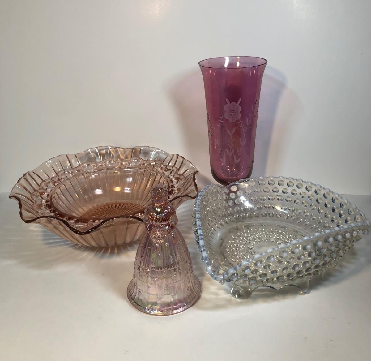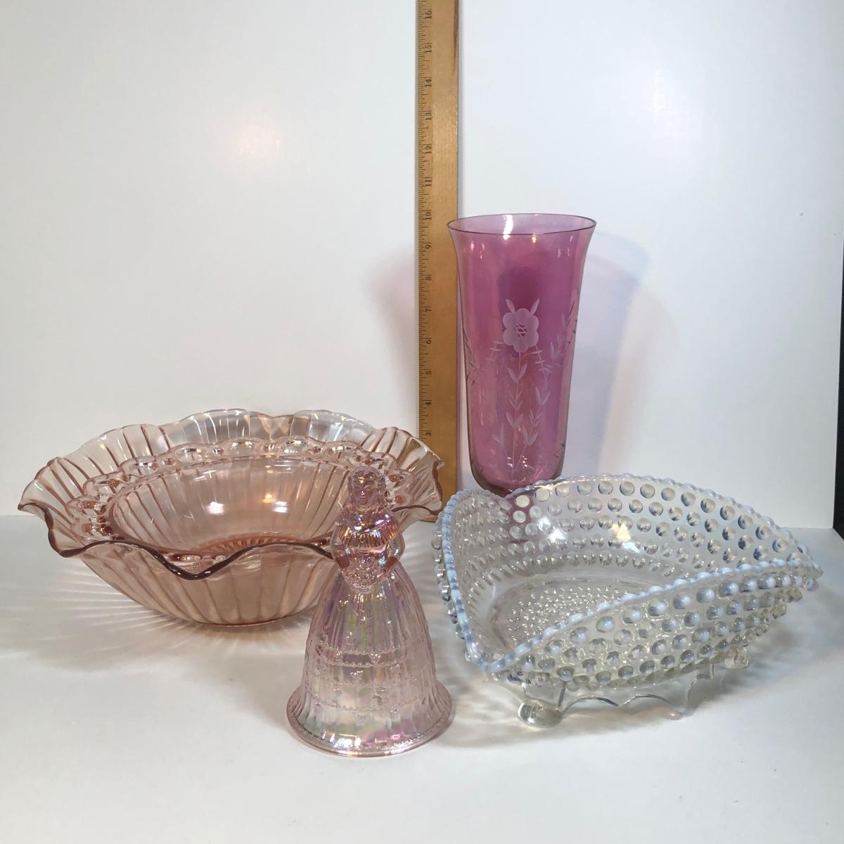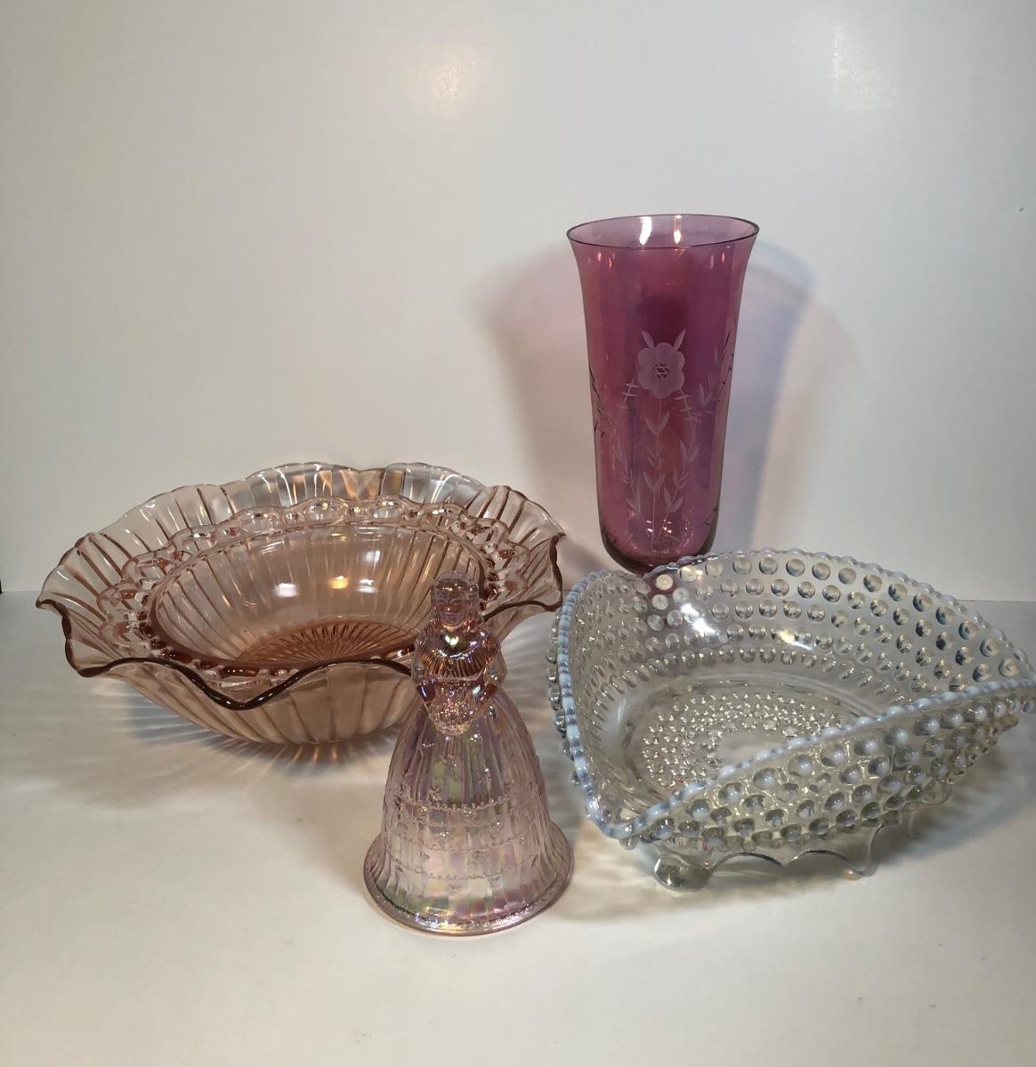 LOT 64M: Pink Depression Glass, Etched Cranberry Vase, Imperial Glass Co Bell & More