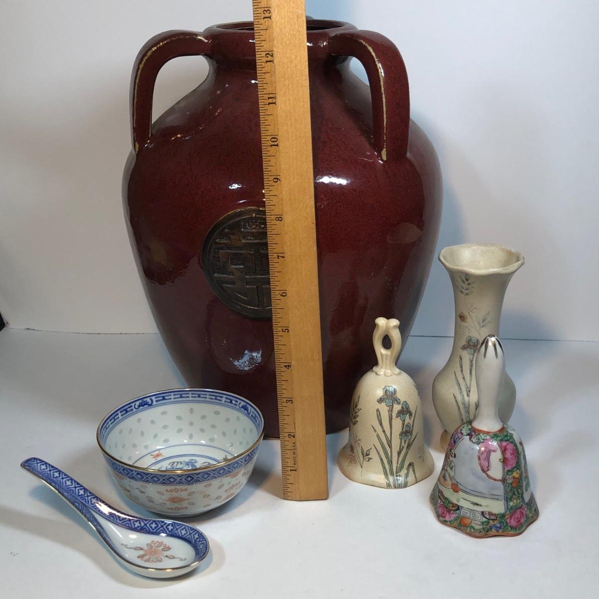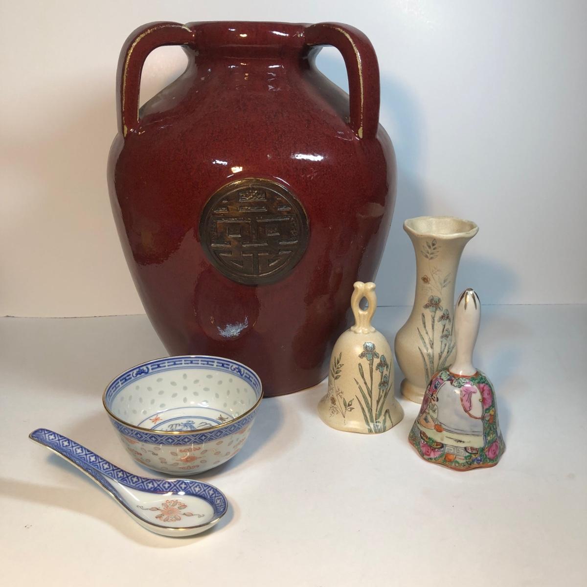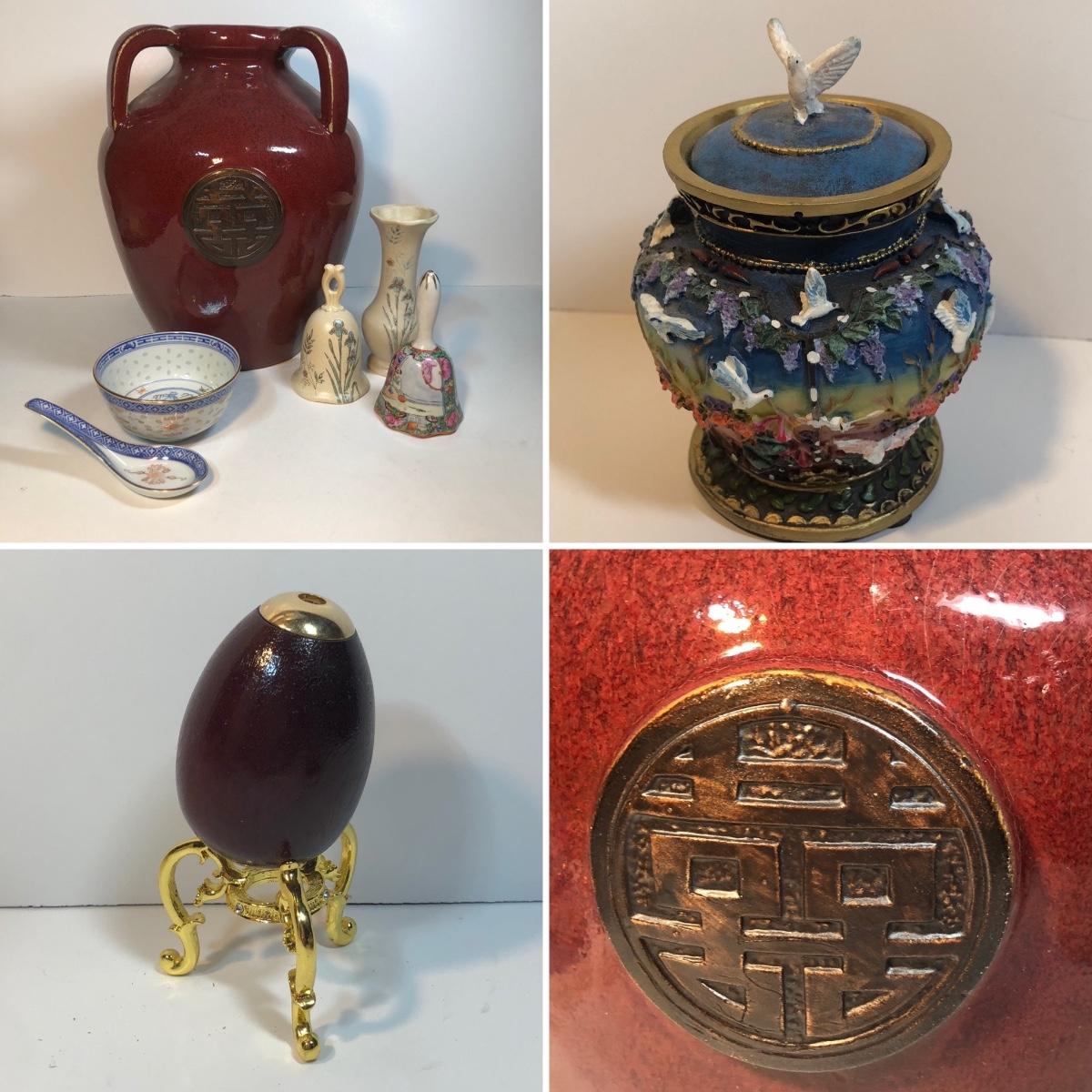 LOT 82M: Large Pottery Jar w/ Handles, Bowl & Matching Spoon Made in China, Kaleidoscope Egg, Bells & More