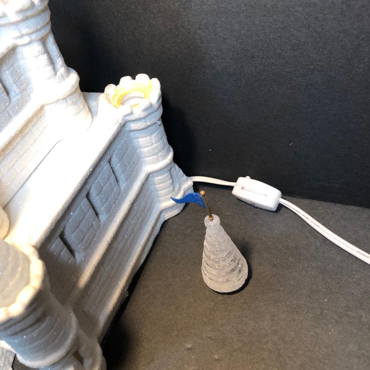 Comes in 3 pieces. Flags are removed and 3 of the trees are detached from the figure.