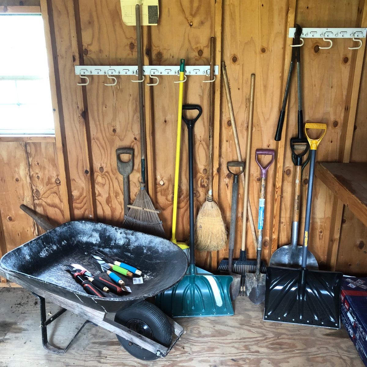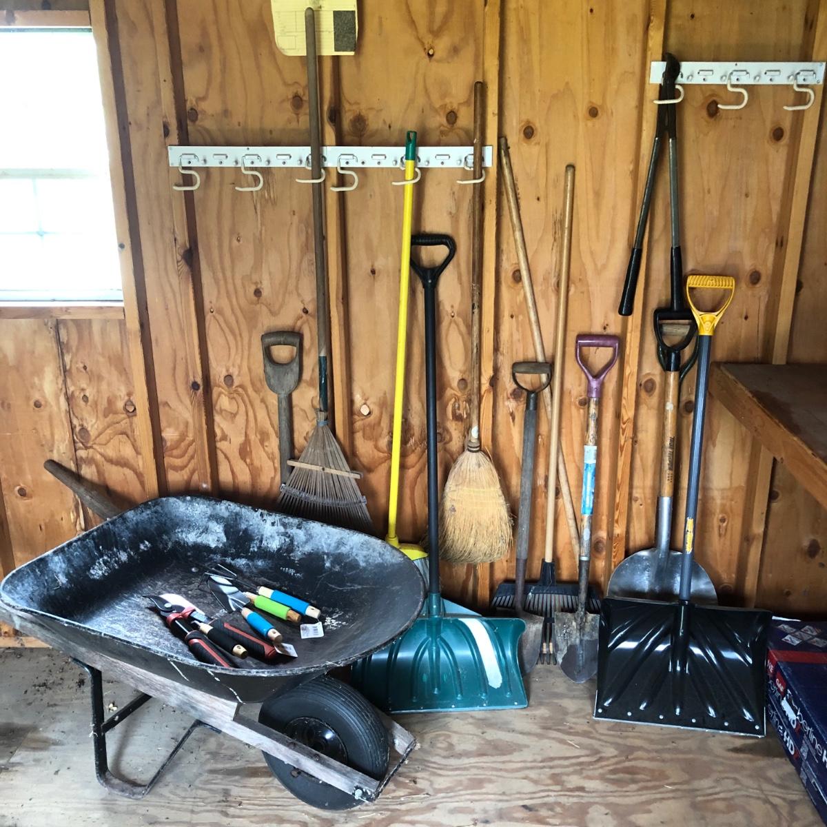 LOT 101M: Wheel Barrow, Shovels, Gardening Tools & More