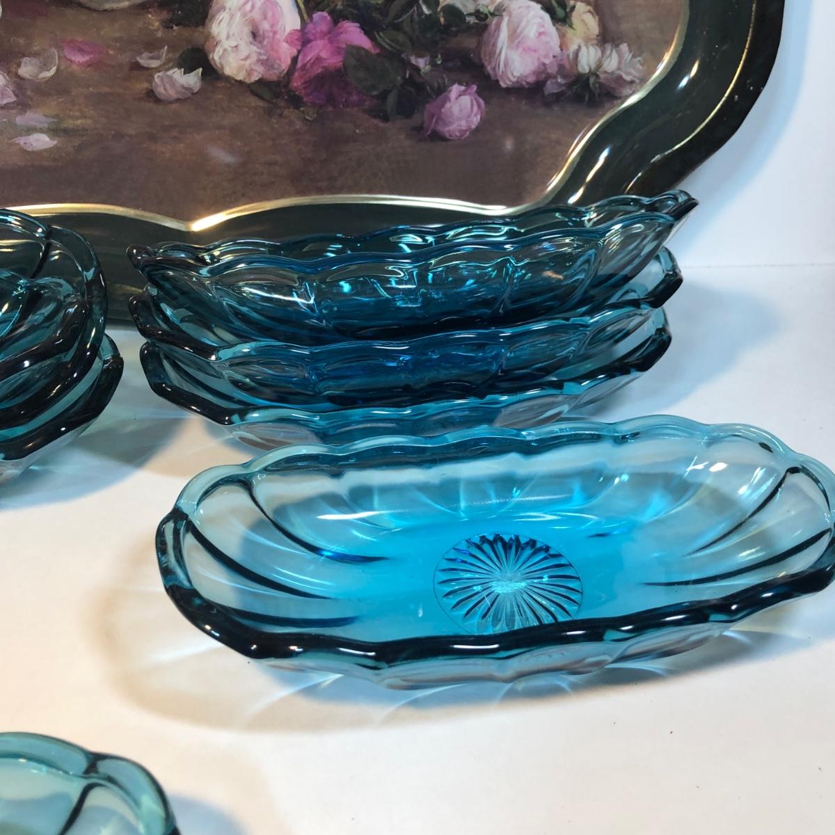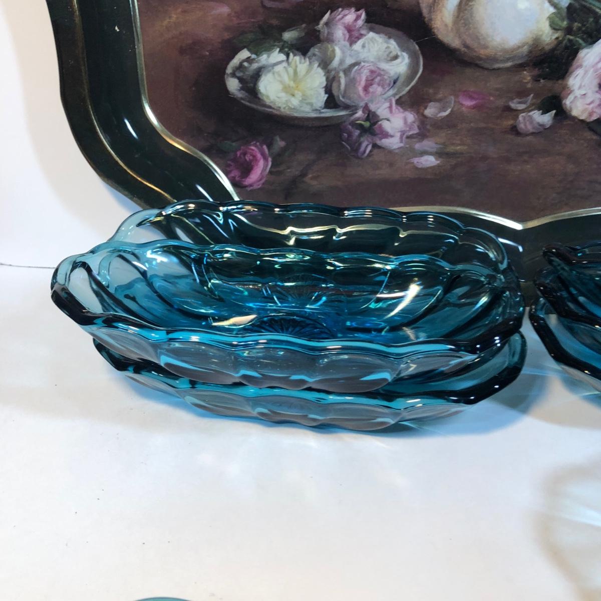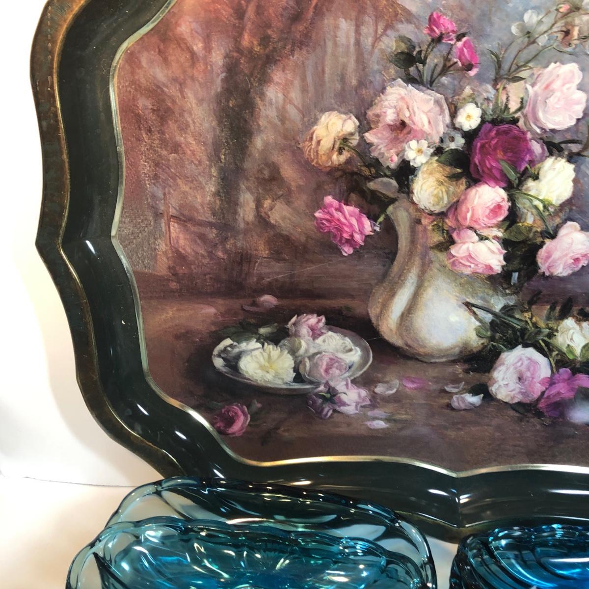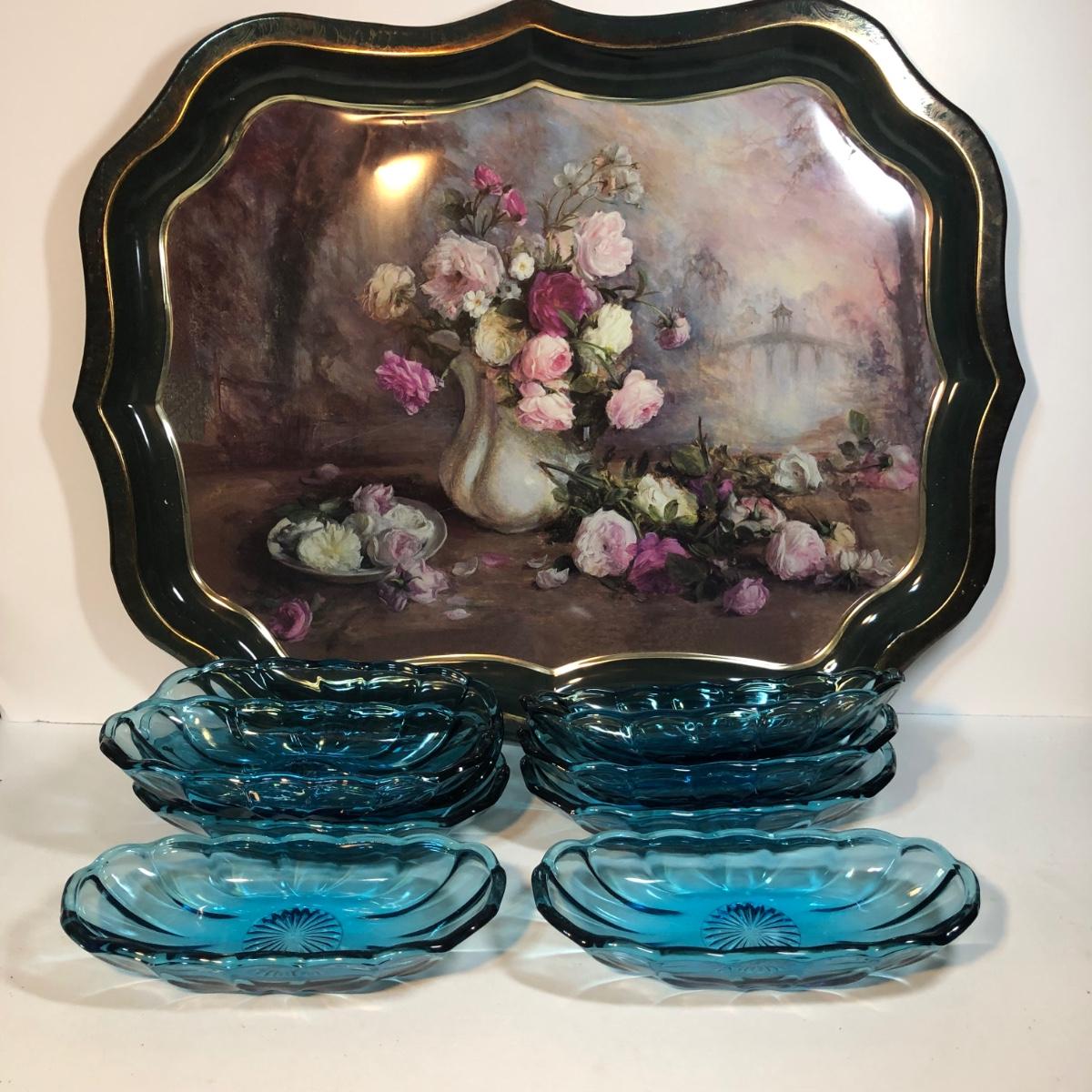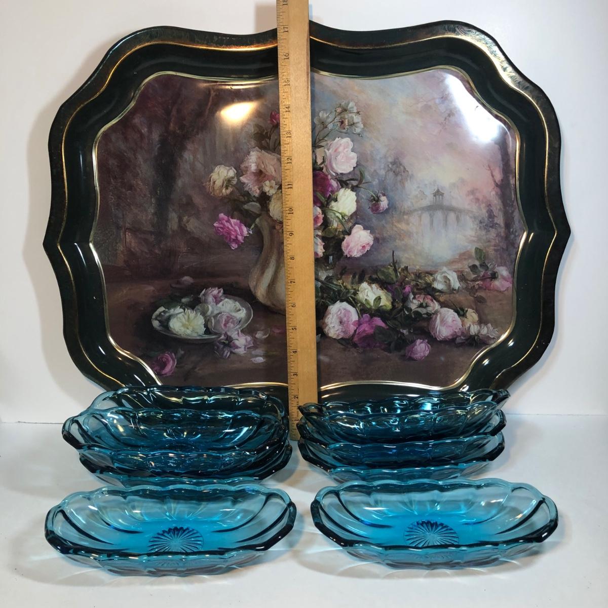 LOT 111M: The Sherwood Studio English Garden Flowers Tray w/ Blue Glass Dishes