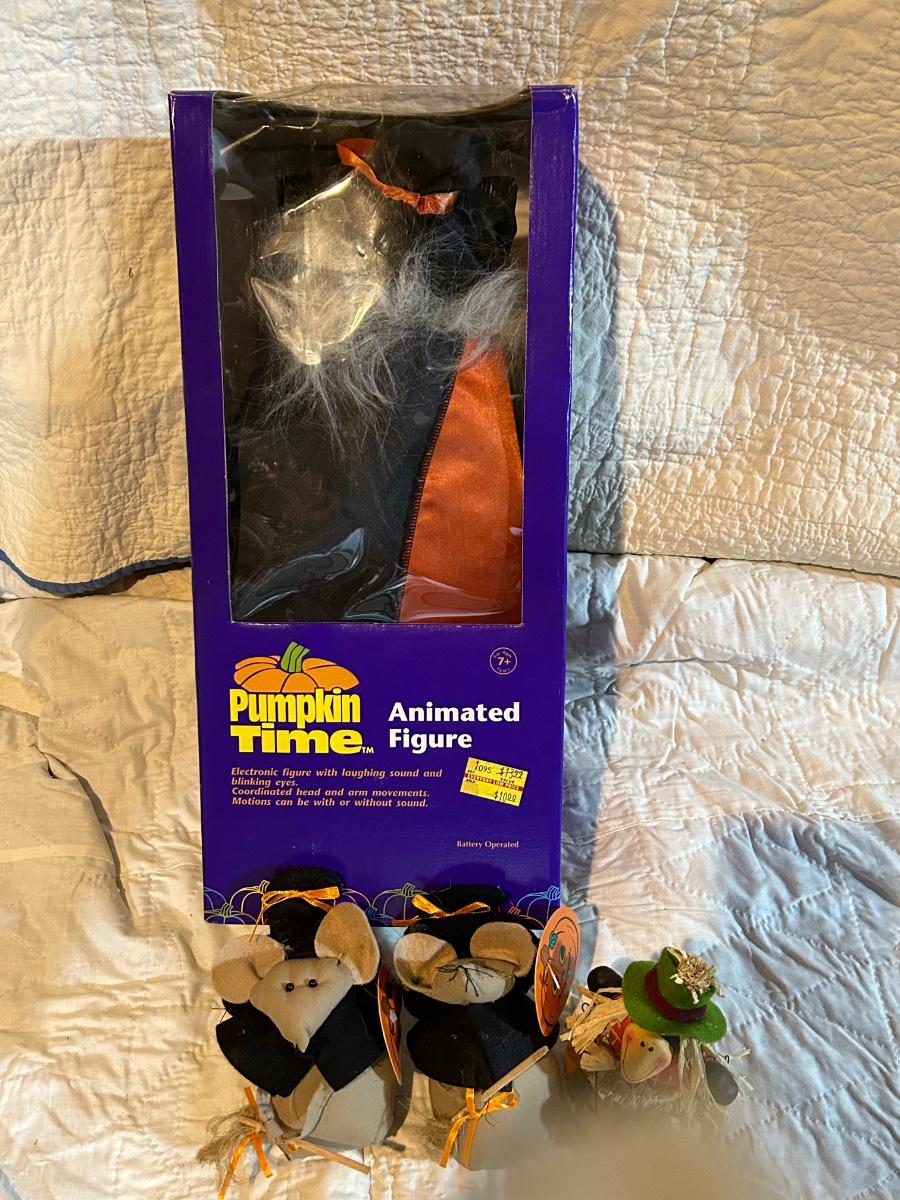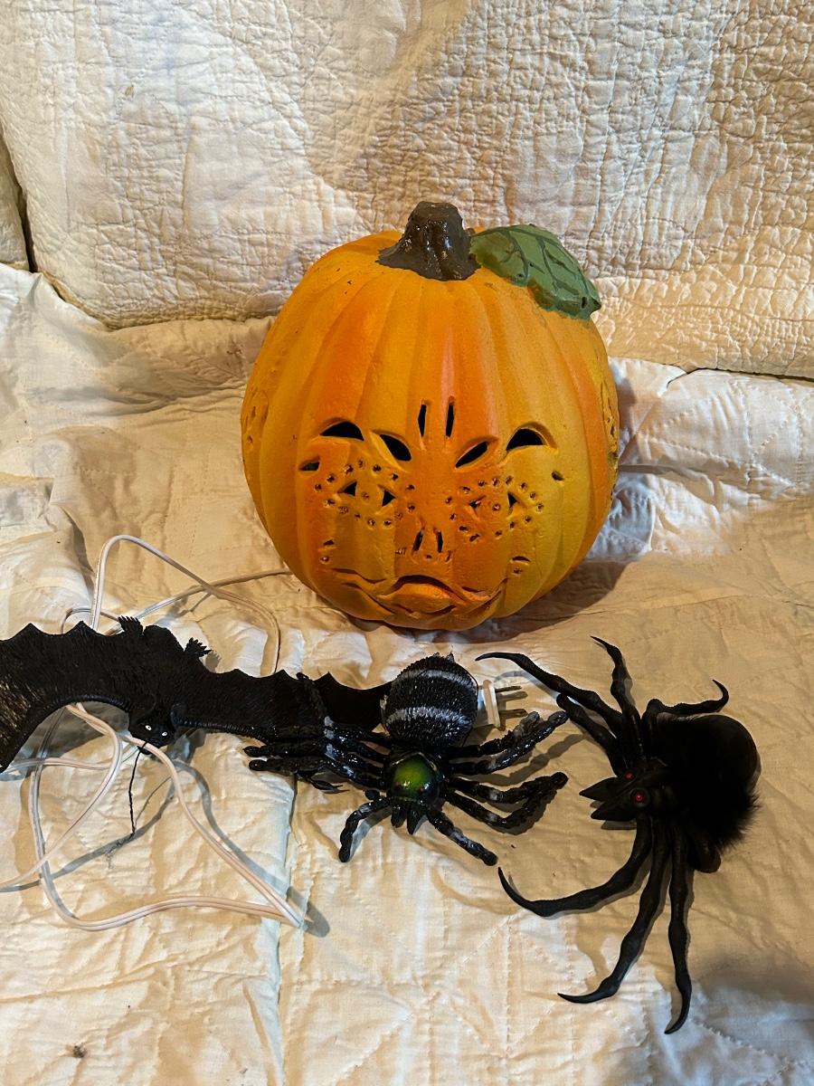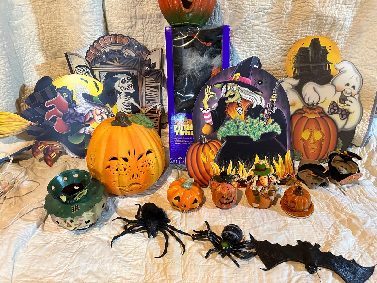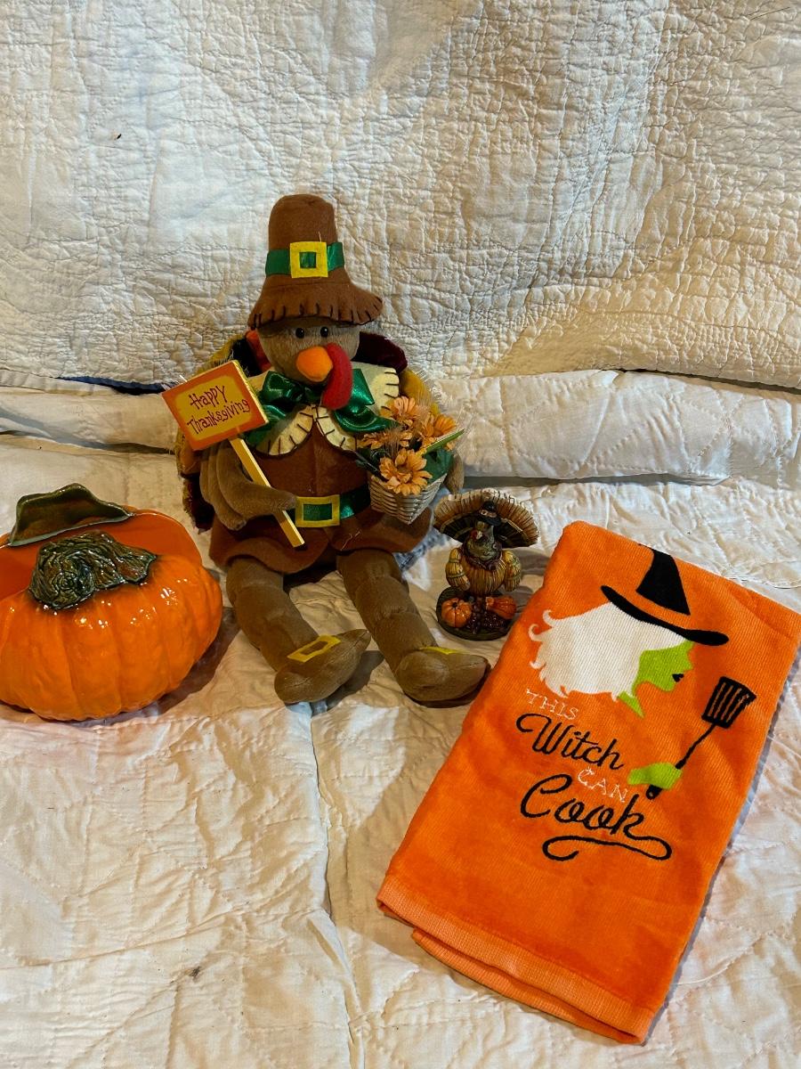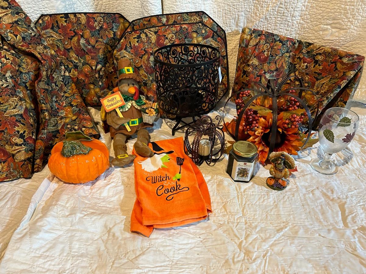 Lot includes Halloween and fall decorations, table cloth and placemats. Large outdoor turkey blow up lawn decoration in Rubbermaid box. Blow up turkey is untested.