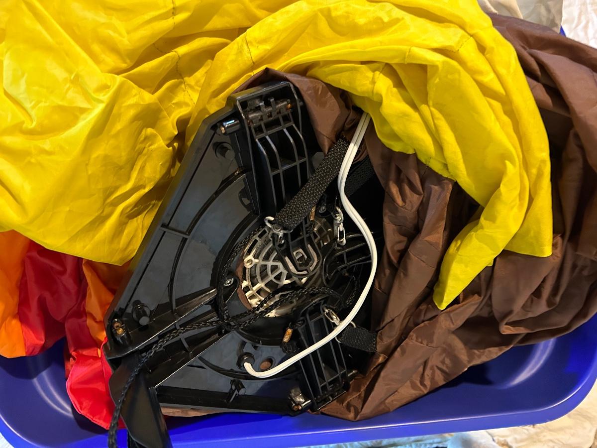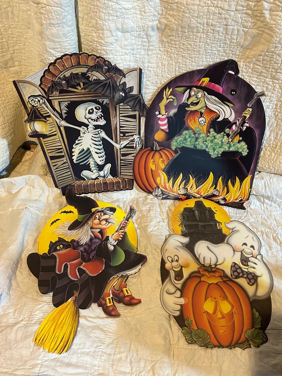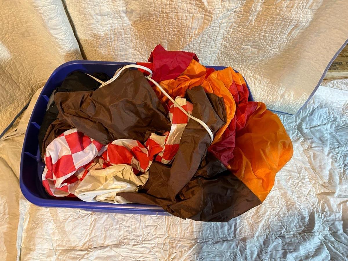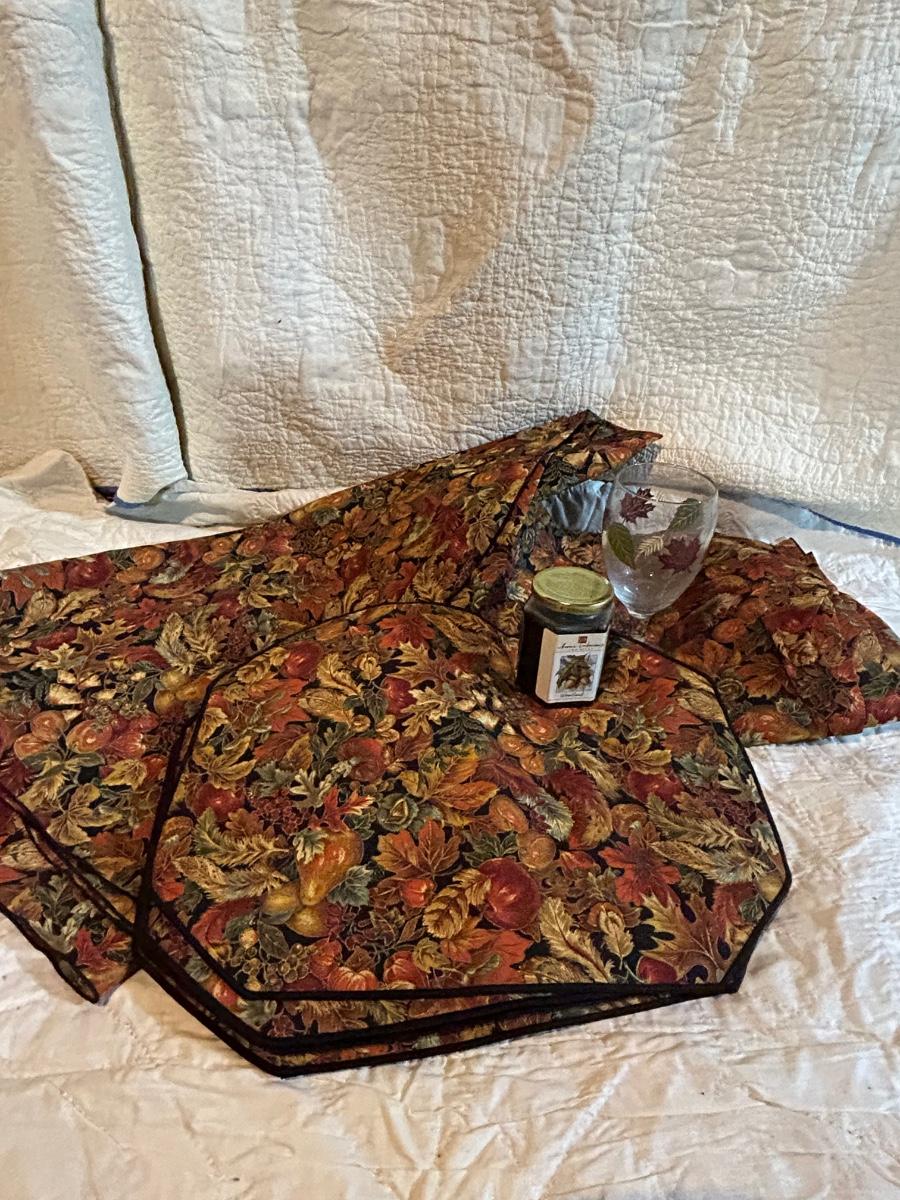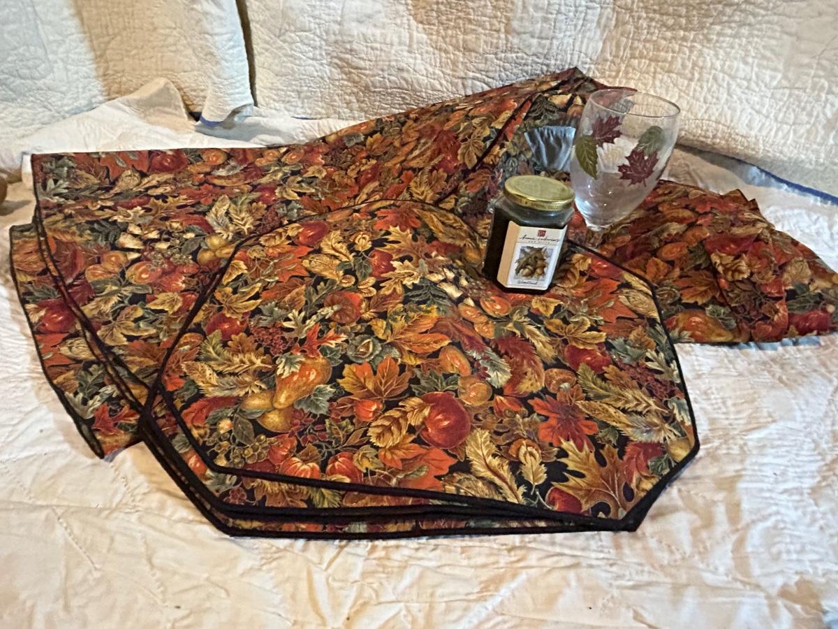 Lot includes Halloween and fall decorations, table cloth and placemats. Large outdoor turkey blow up lawn decoration in Rubbermaid box. Blow up turkey is untested.