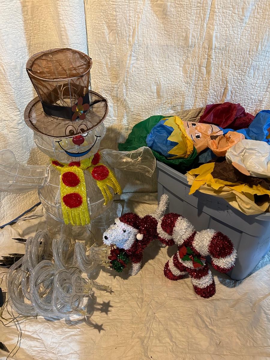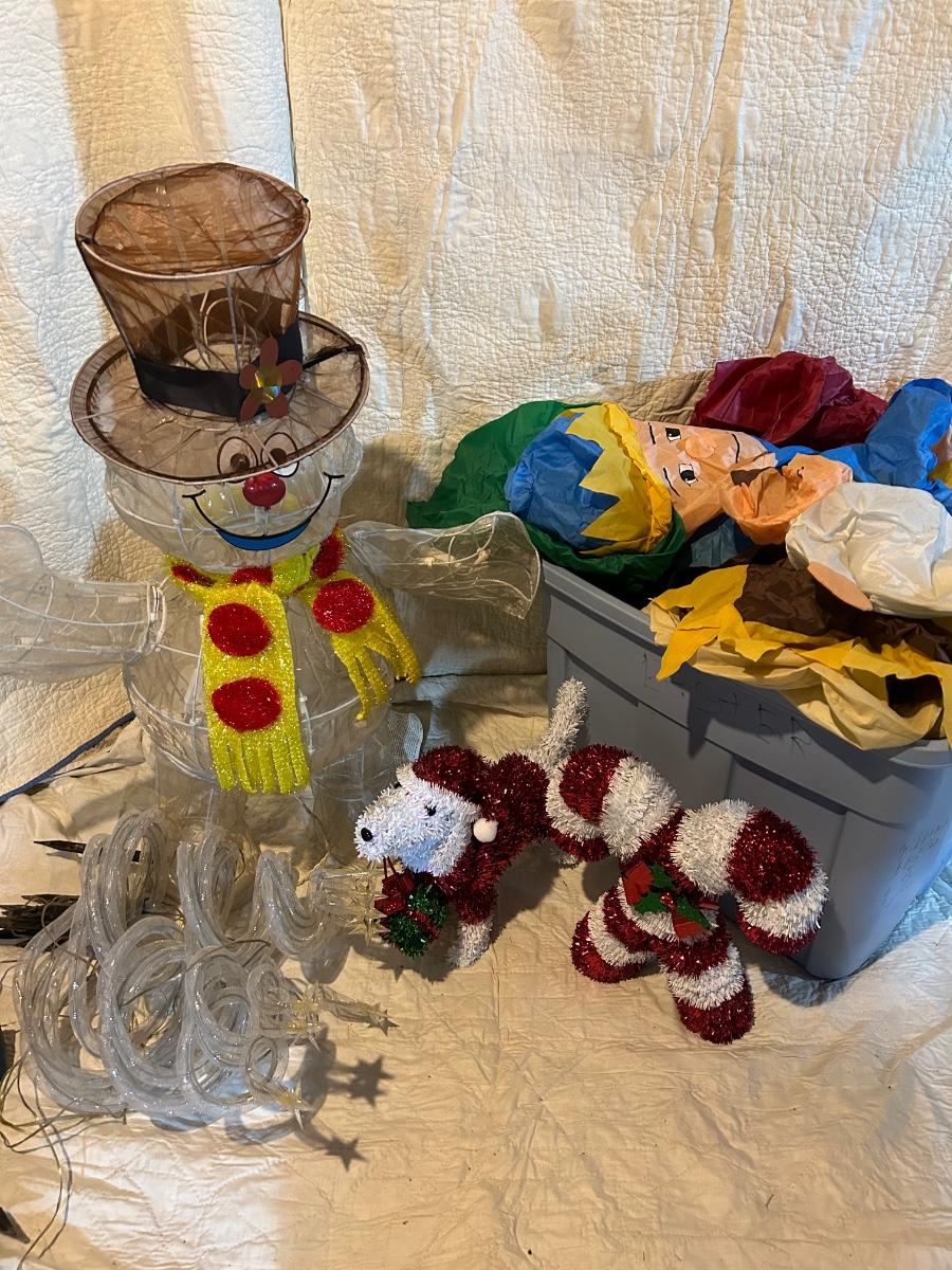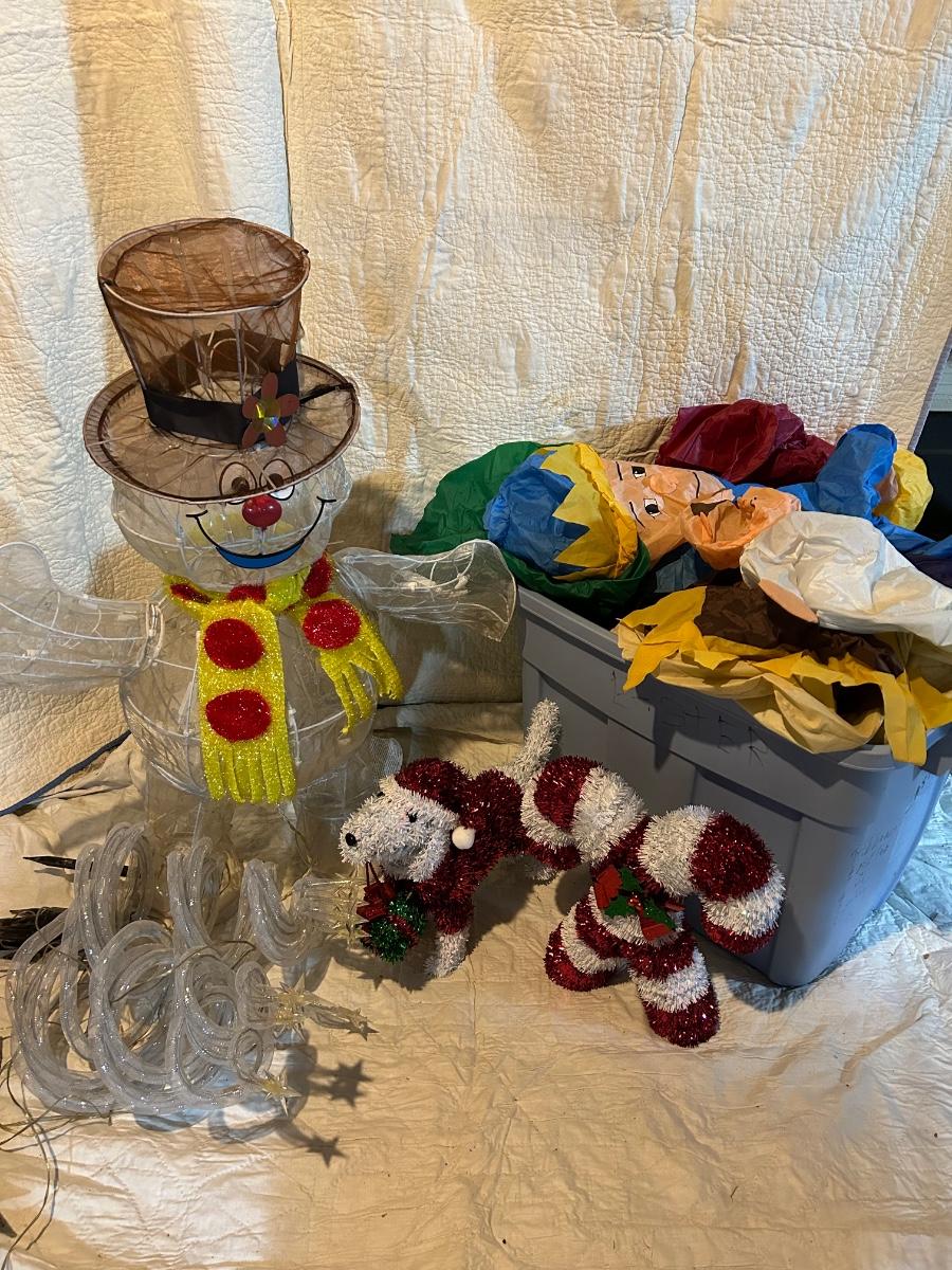 Blow up nativity scene, untested. Frosty The Snowman outdoor lawn decoration. Solar light up trees.