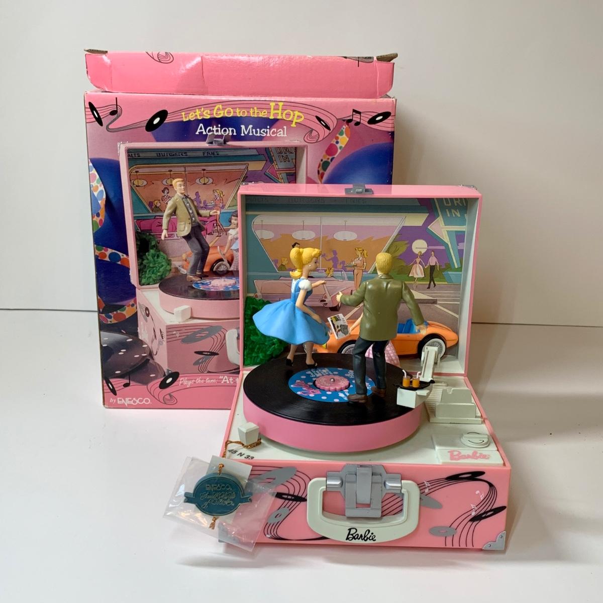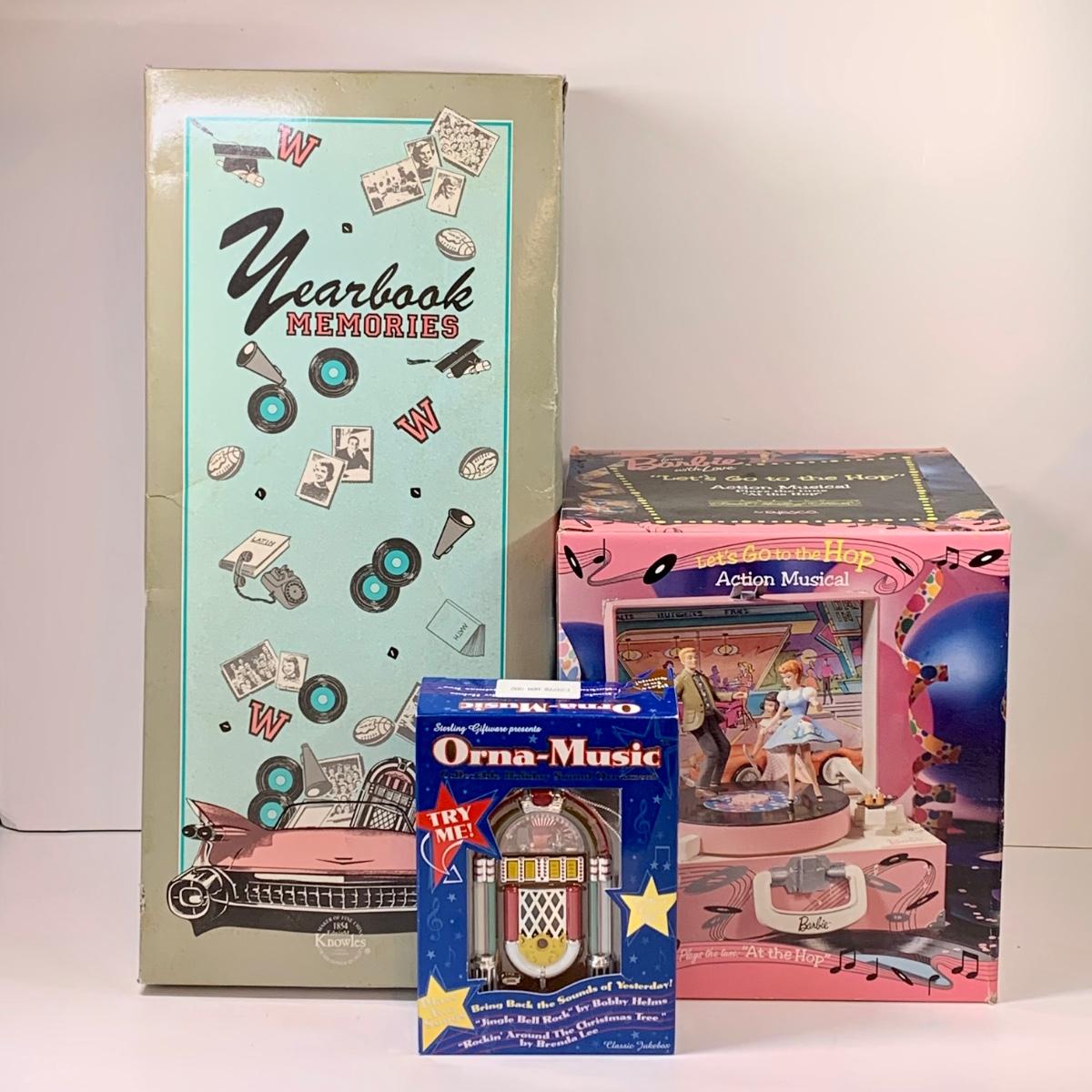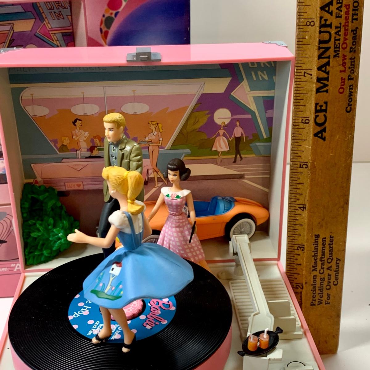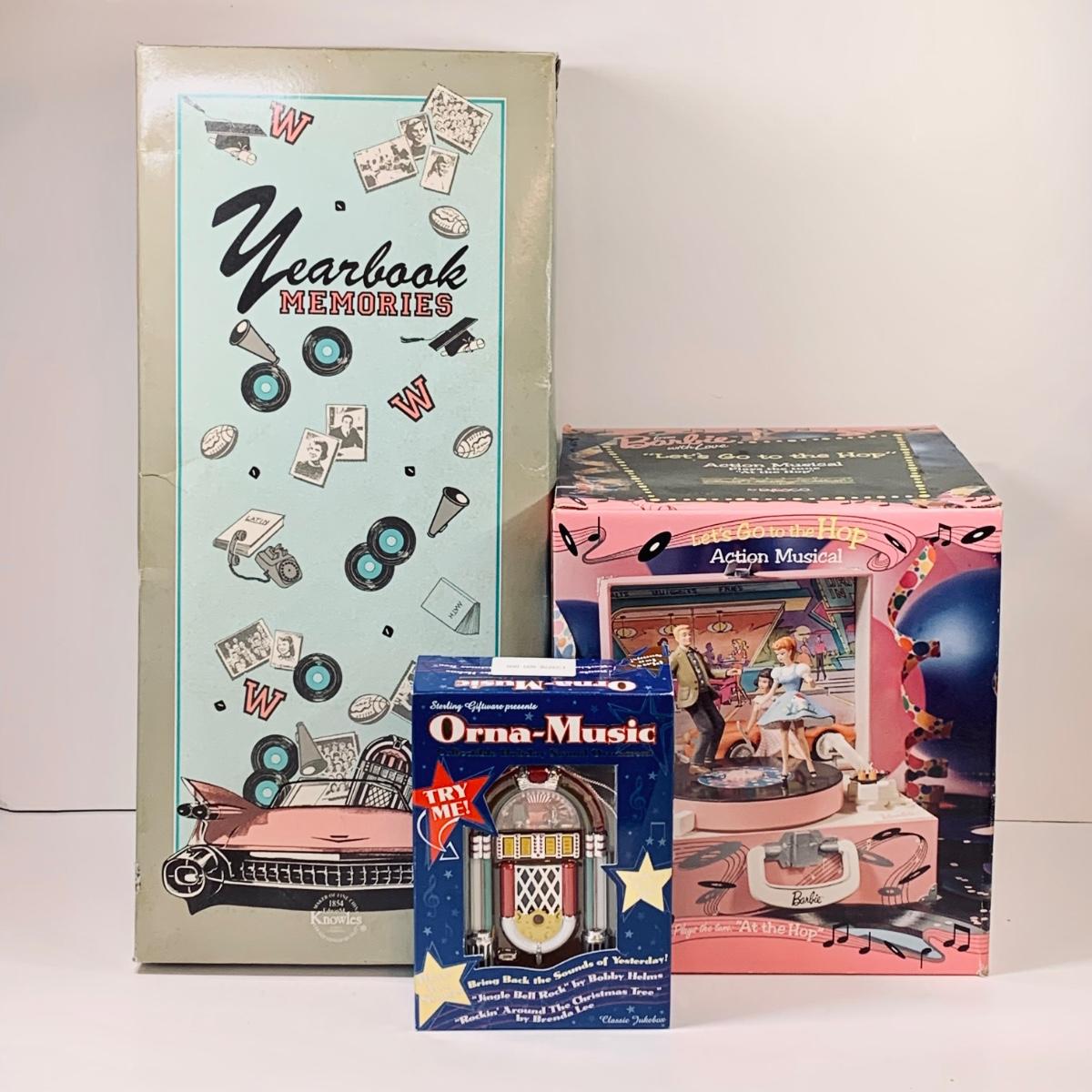 LOT 183R: Barbie LET’S GO TO THE HOP Music Box w/ Action #551538 ENESCO, "Peggy Sue" Yearbook Memories Porcelain Doll & Orna-Musical Juke Box Ornament