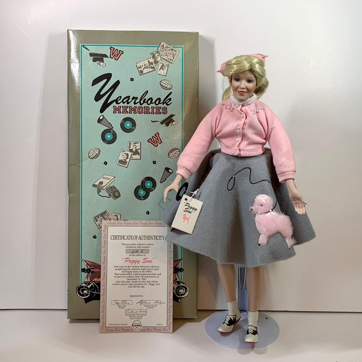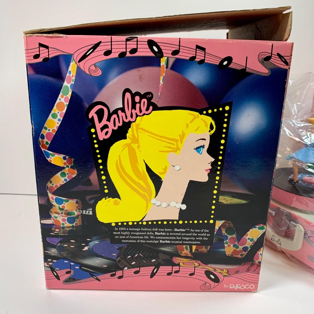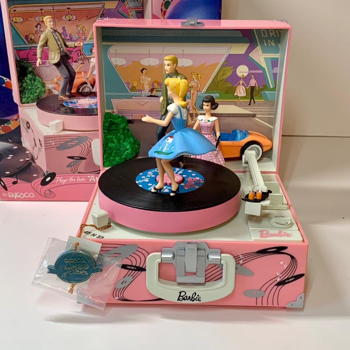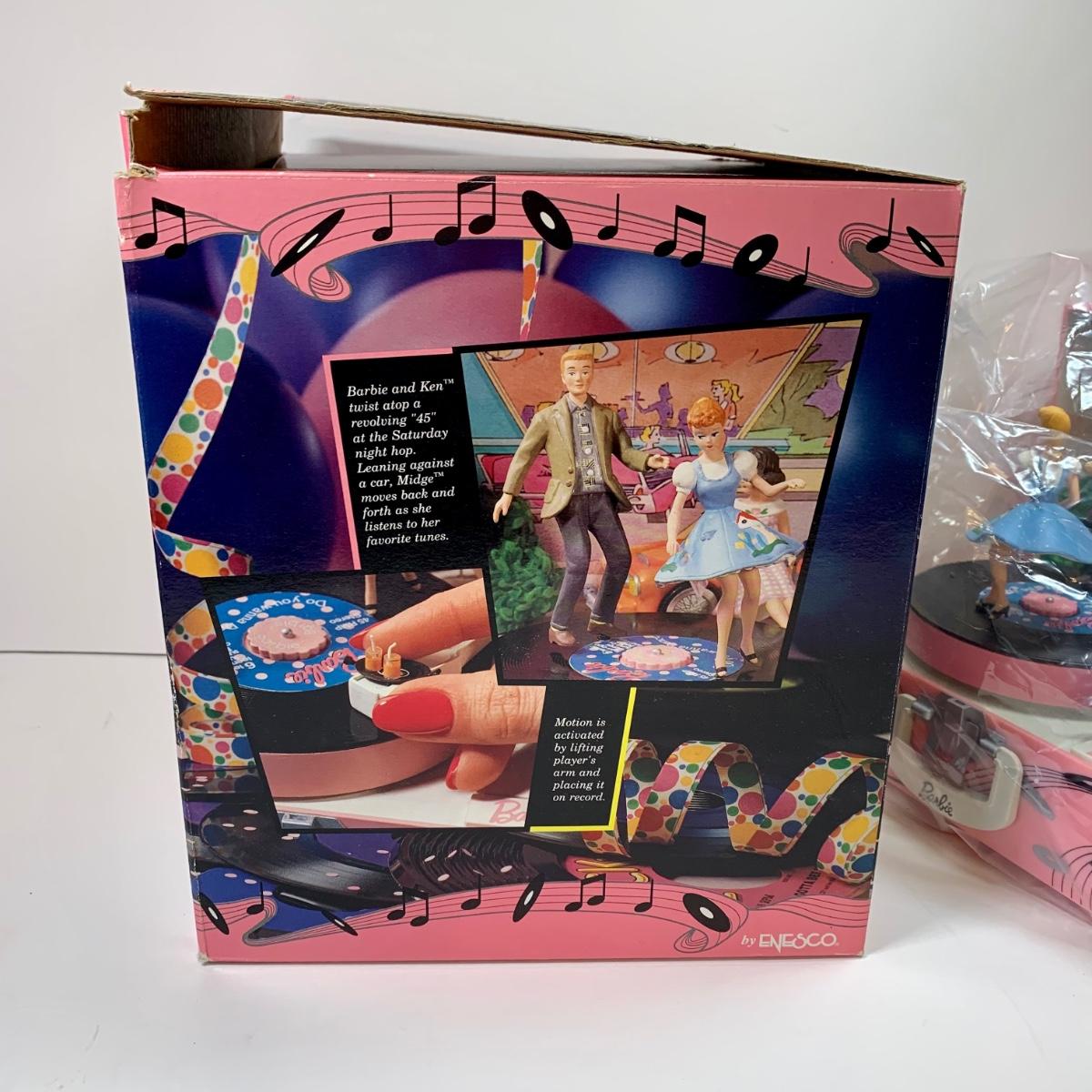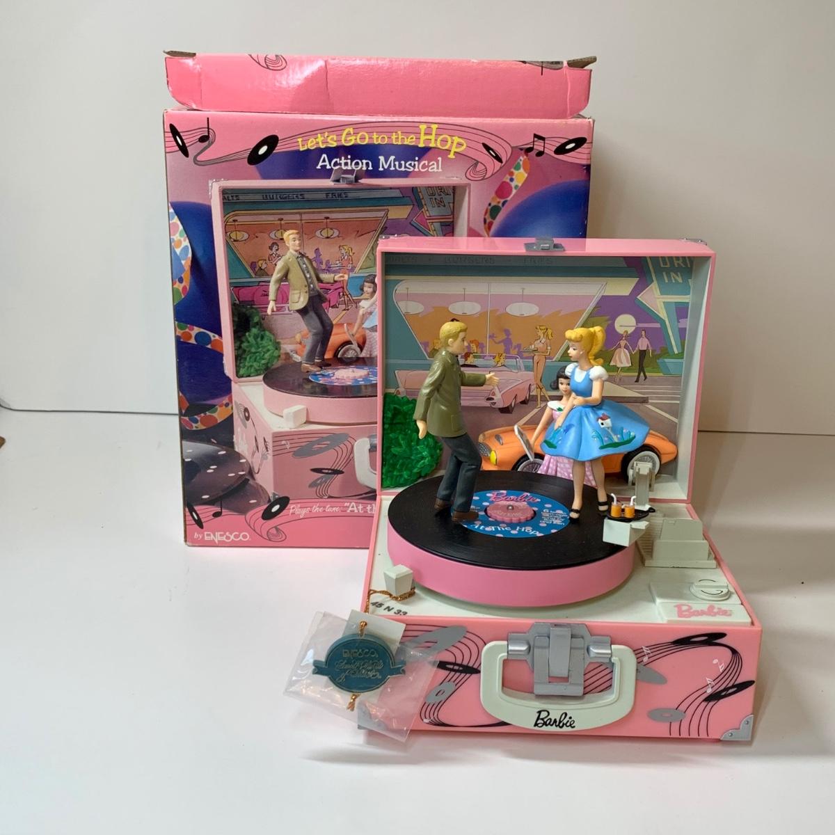 LOT 183R: Barbie LET’S GO TO THE HOP Music Box w/ Action #551538 ENESCO, "Peggy Sue" Yearbook Memories Porcelain Doll & Orna-Musical Juke Box Ornament
