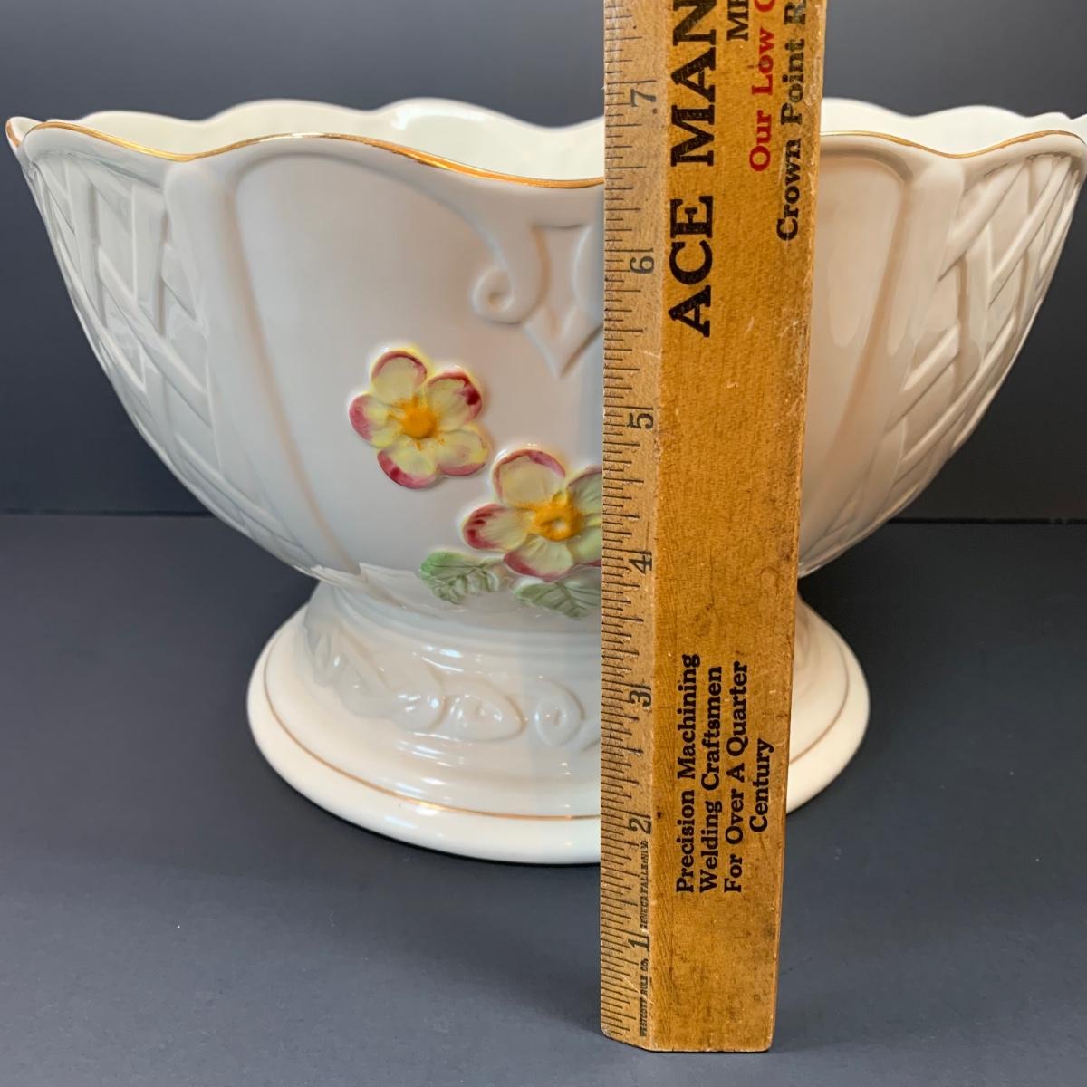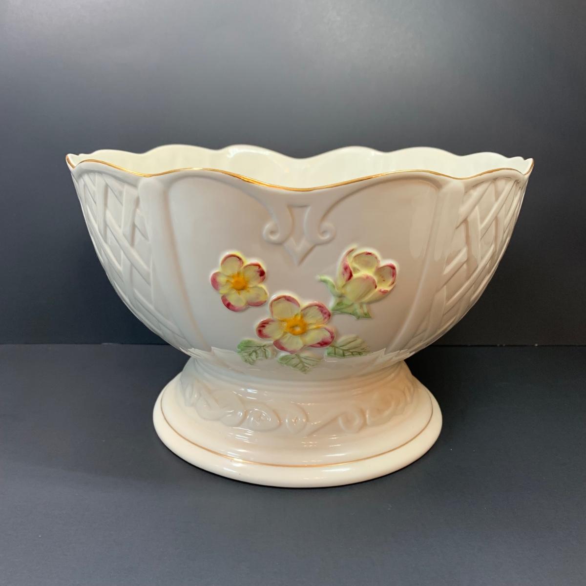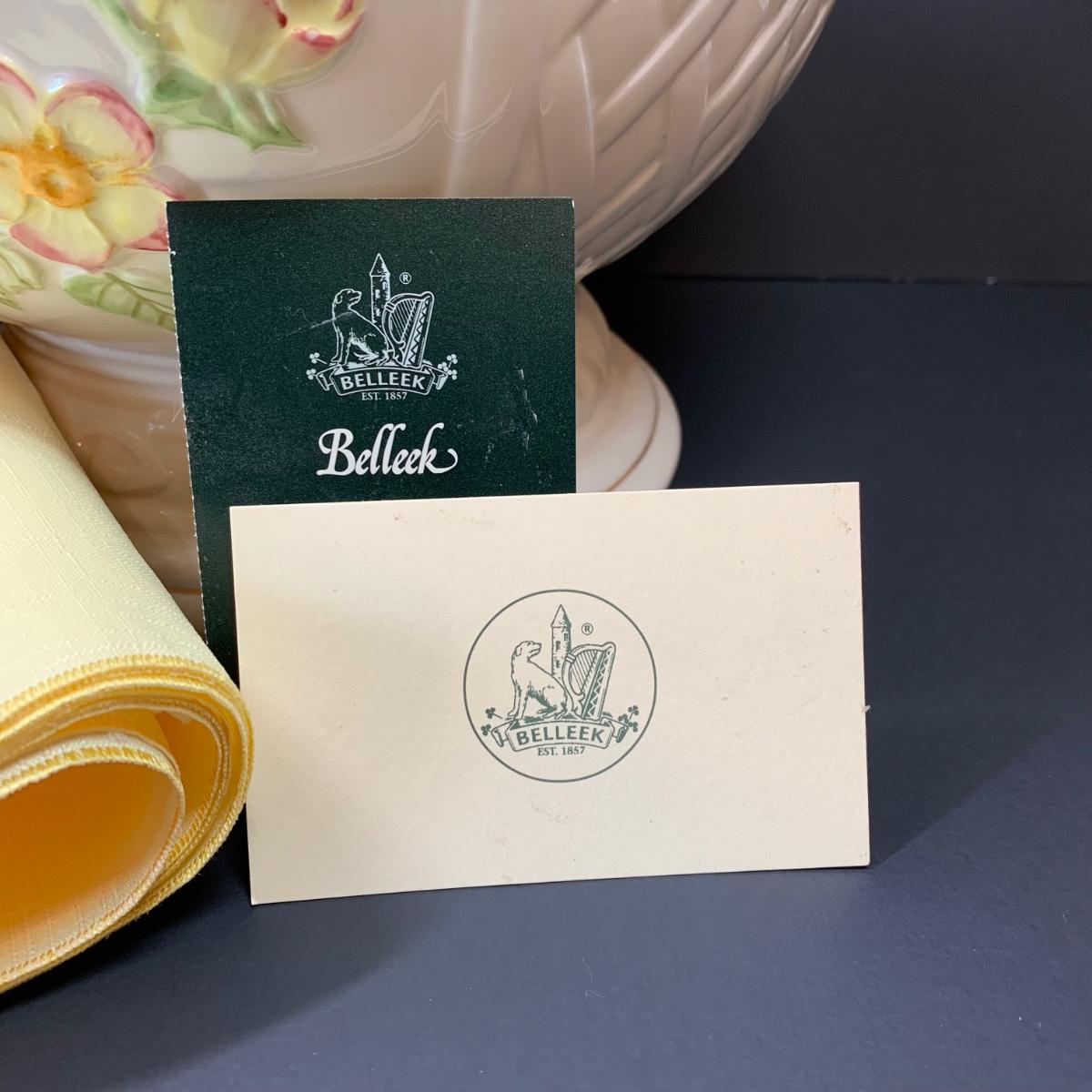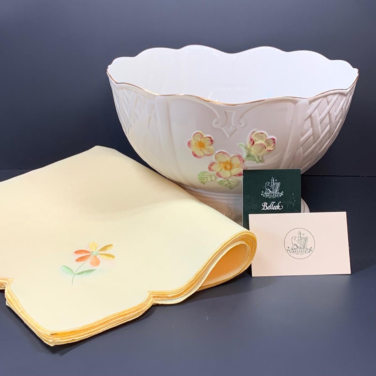 LOT 184R: Beautiful Large Belleek Bowl & Yellow Floral Napkins (8)