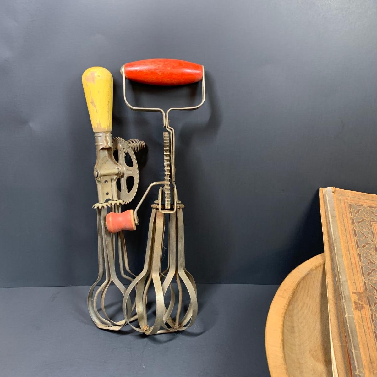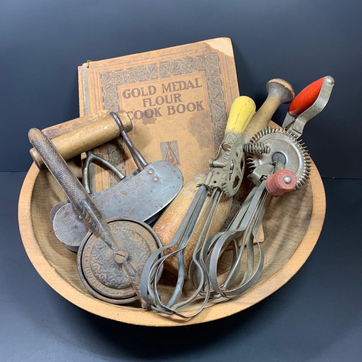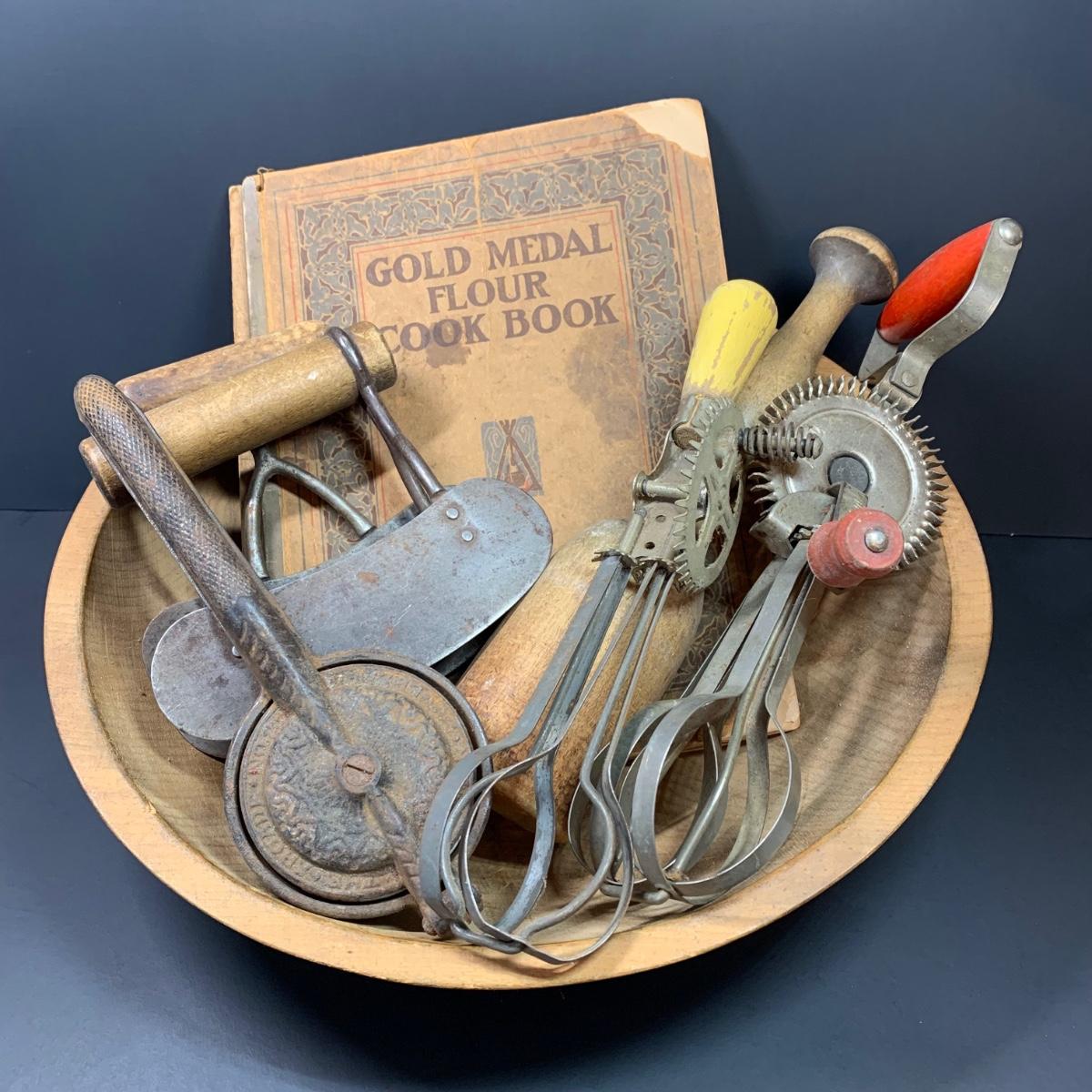 LOT 187R: Primitive Kitchen Collection: Antique Hand Juicer, Vintage Hand-Crafted Wooden Bowl, Hand Mixers, Wooden Pestle Masher/Grinder, Dough Cutters/Blades & Medal Flour Cookbooks