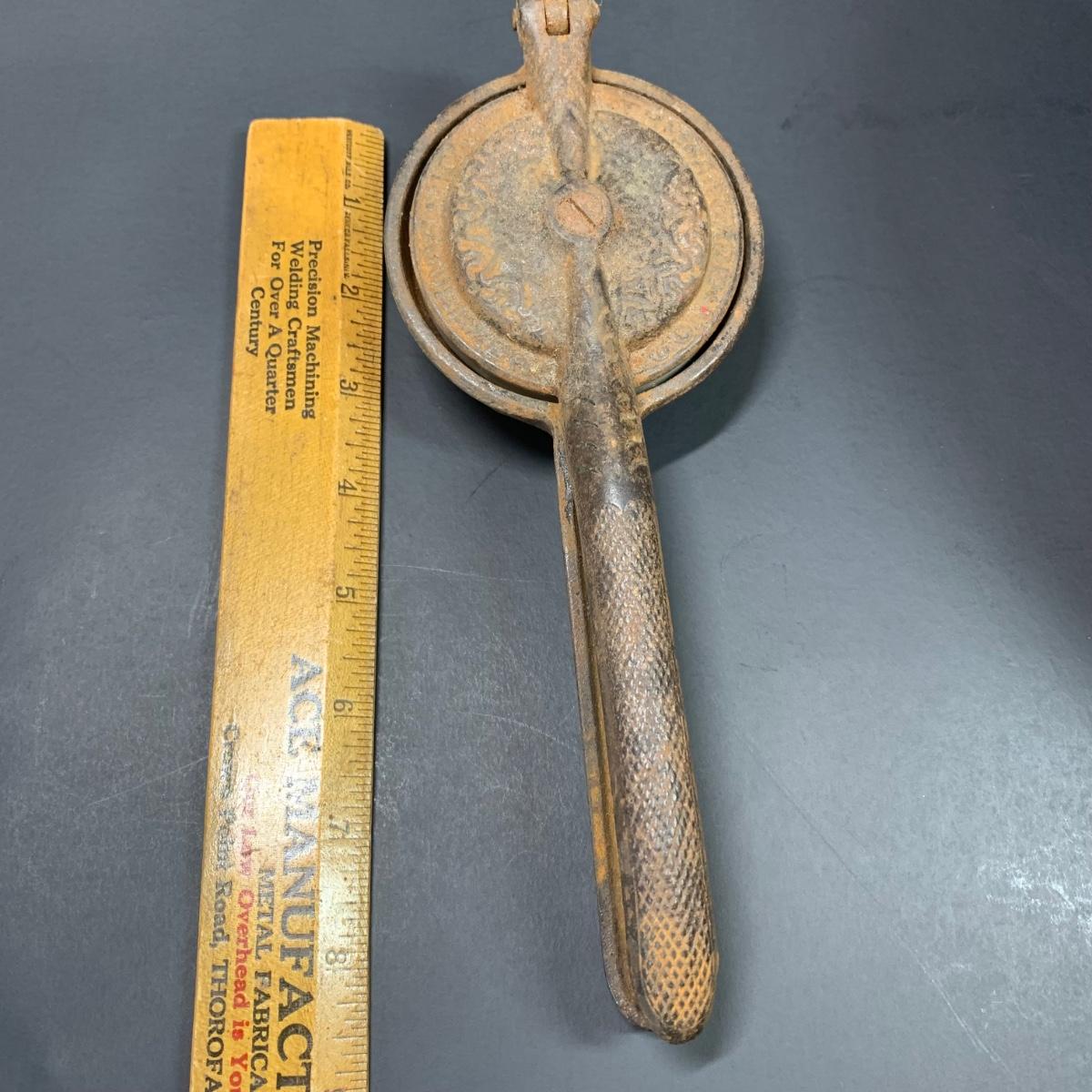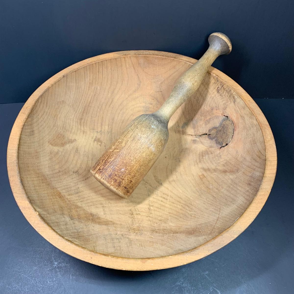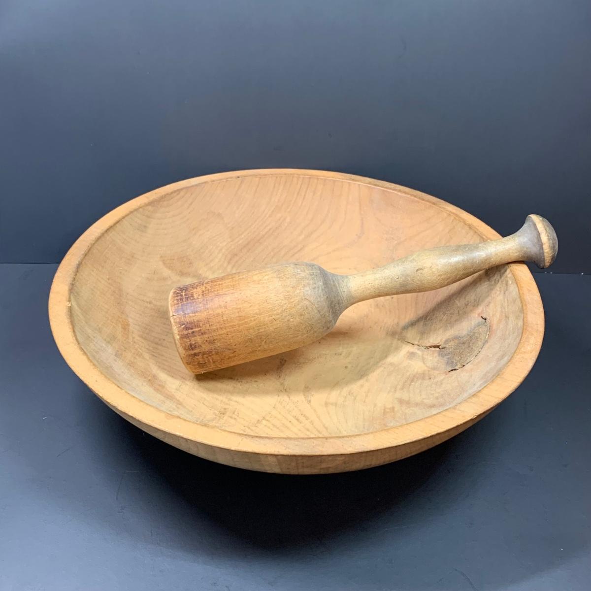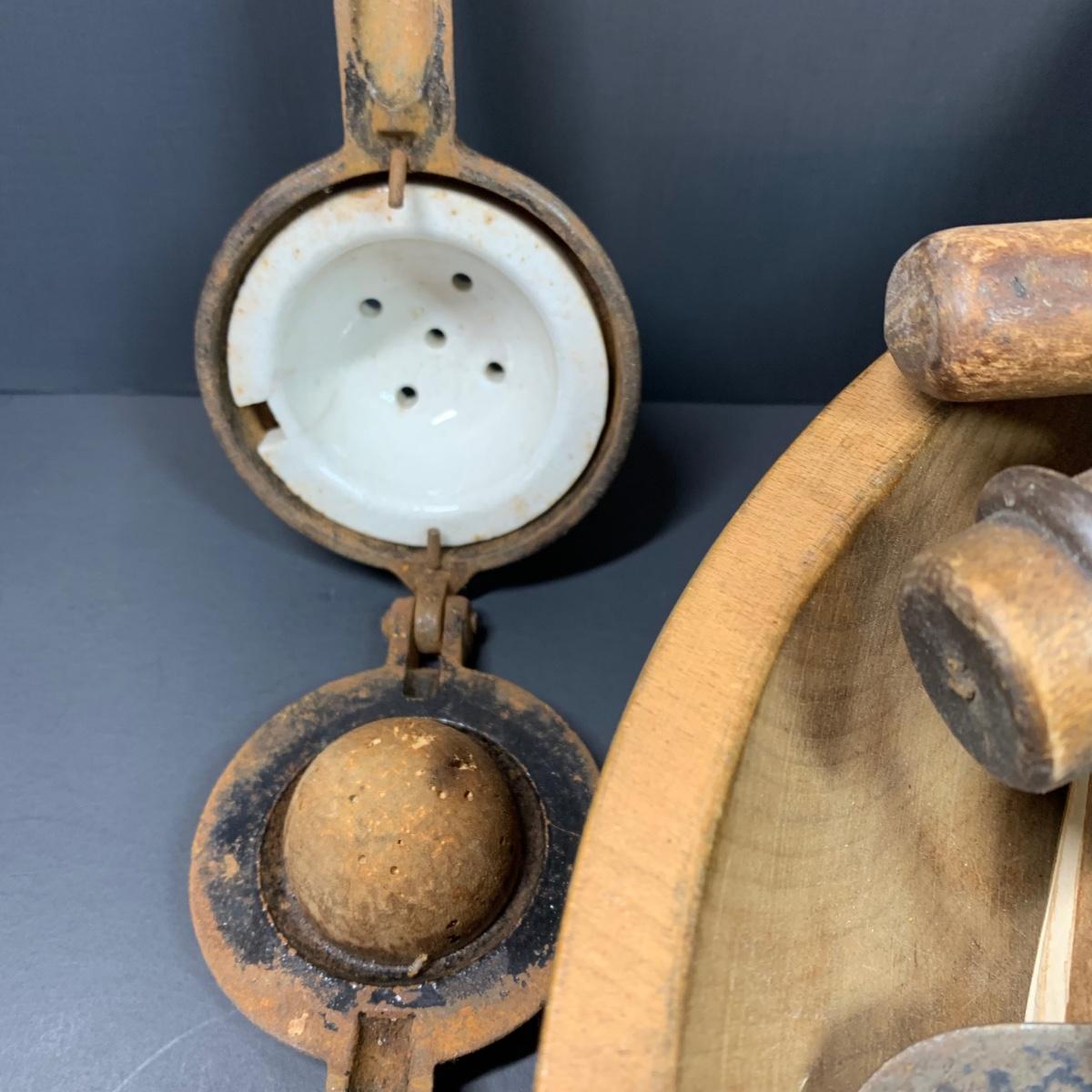 LOT 187R: Primitive Kitchen Collection: Antique Hand Juicer, Vintage Hand-Crafted Wooden Bowl, Hand Mixers, Wooden Pestle Masher/Grinder, Dough Cutters/Blades & Medal Flour Cookbooks