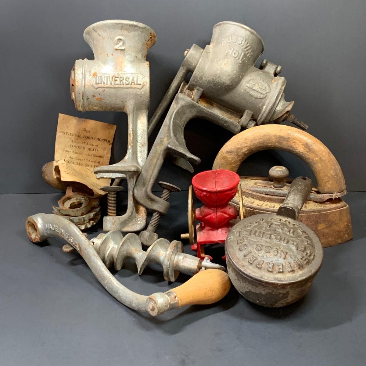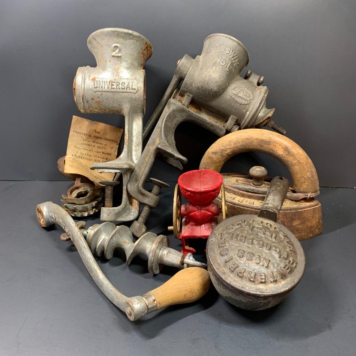 LOT 188R: Vintage Meat Grinders, Iron, Antique Enterprise No.33 Ice Scraper & More