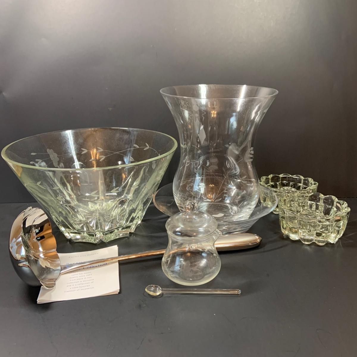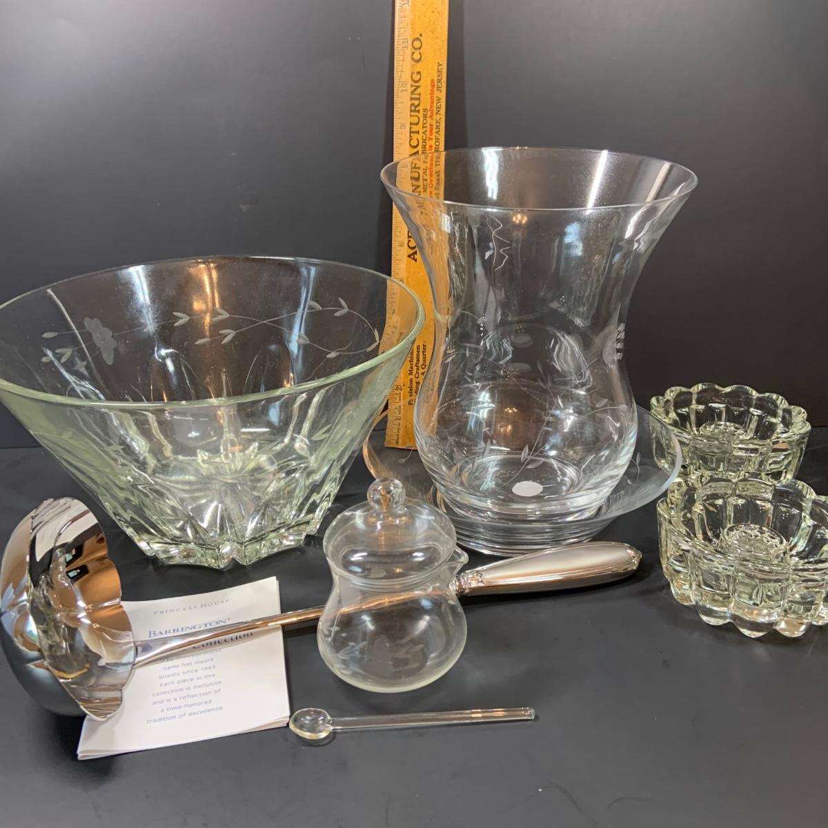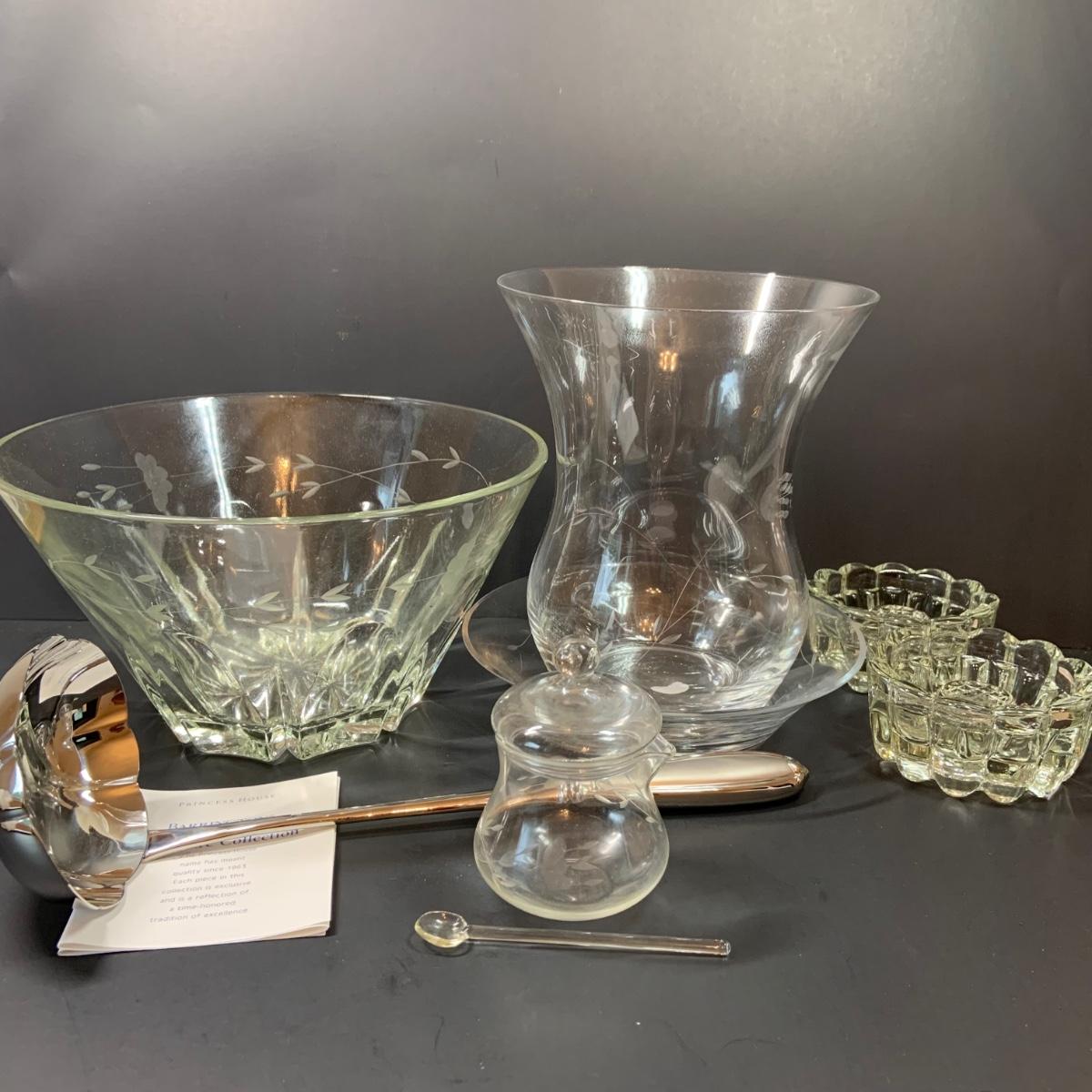 LOT 189G: Princess House Collection: Vase, Candle Holders, Sugar Bowl, Large Bowl& Serving Spoon