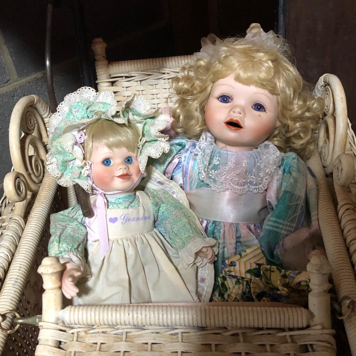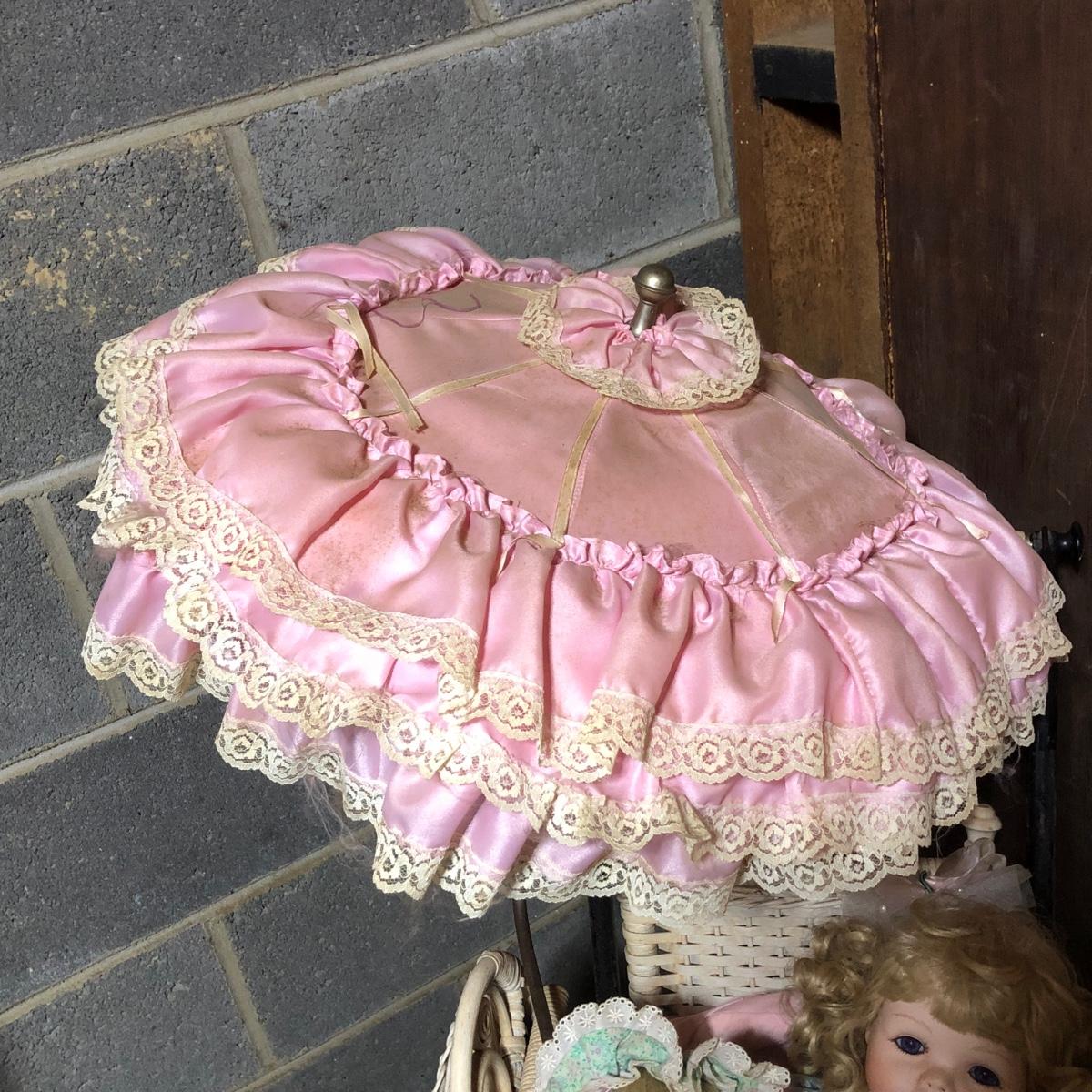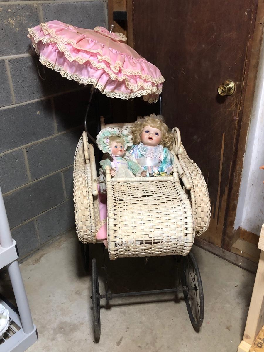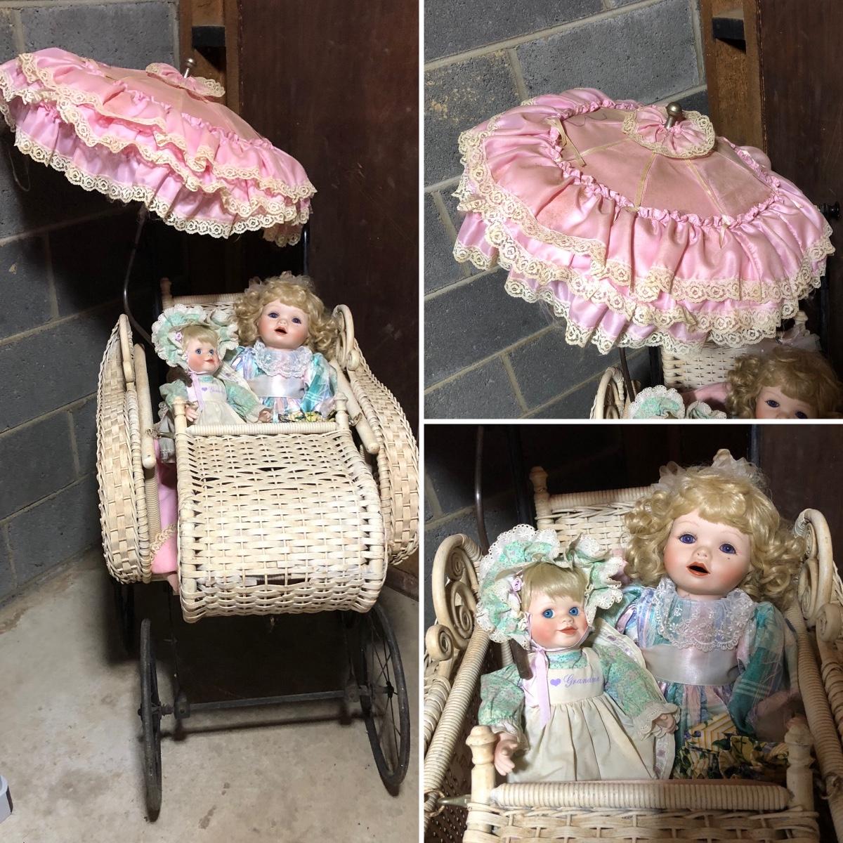 LOT 201M: Vintage Wicker Stroller w/ Pink Umbrella & Porcelain Dolls