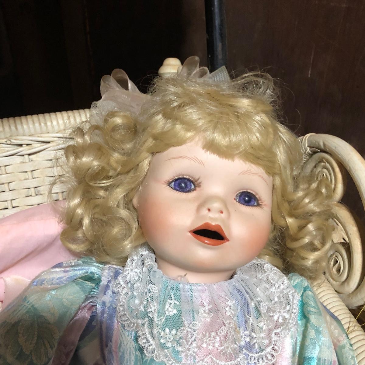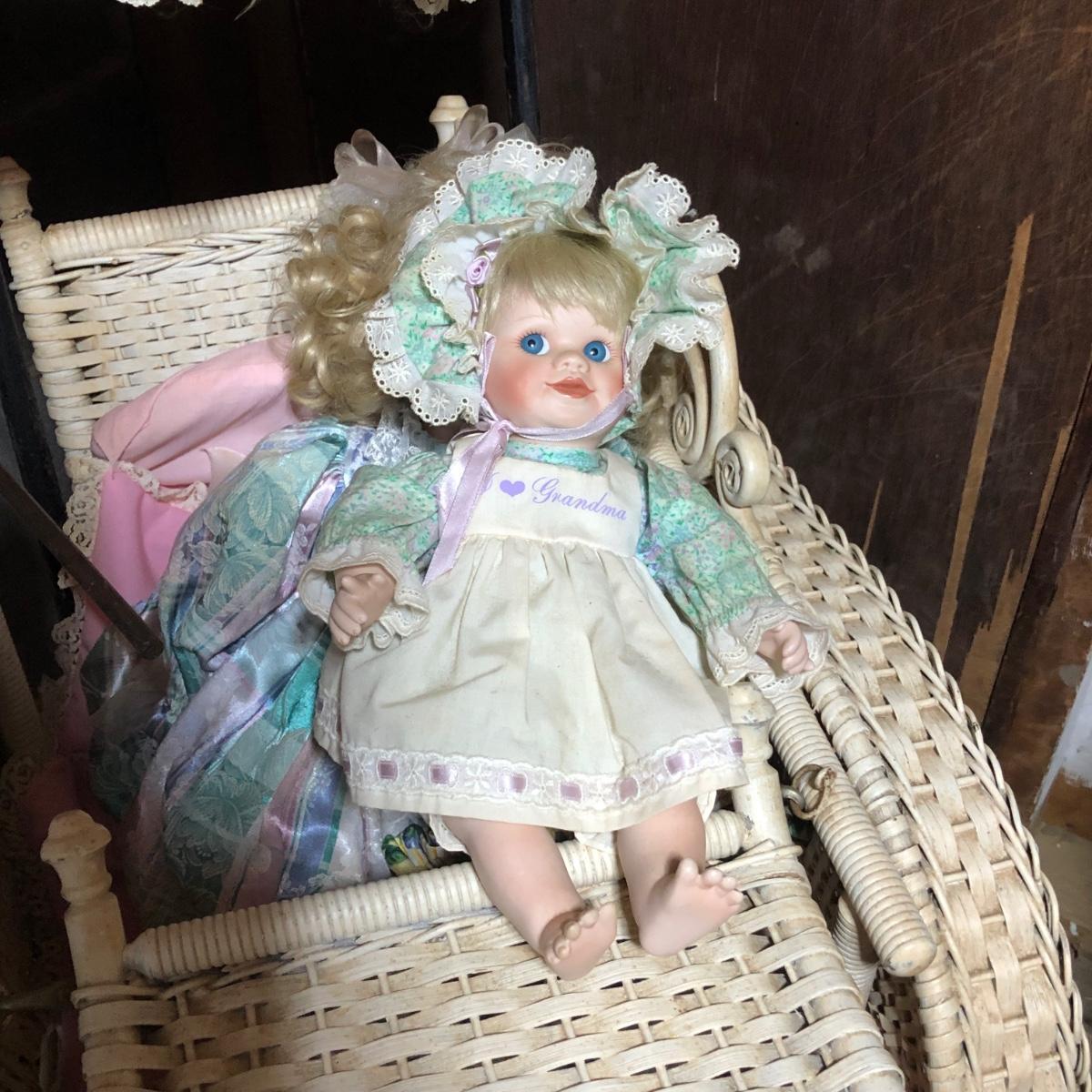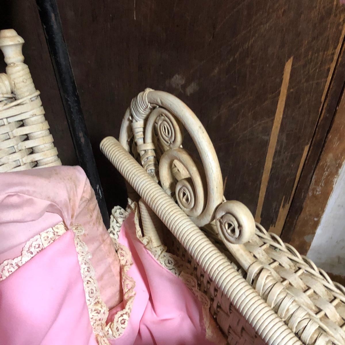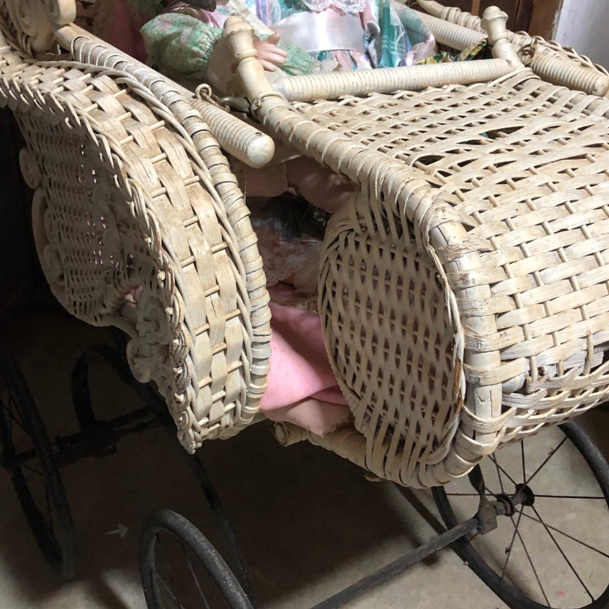 LOT 201M: Vintage Wicker Stroller w/ Pink Umbrella & Porcelain Dolls