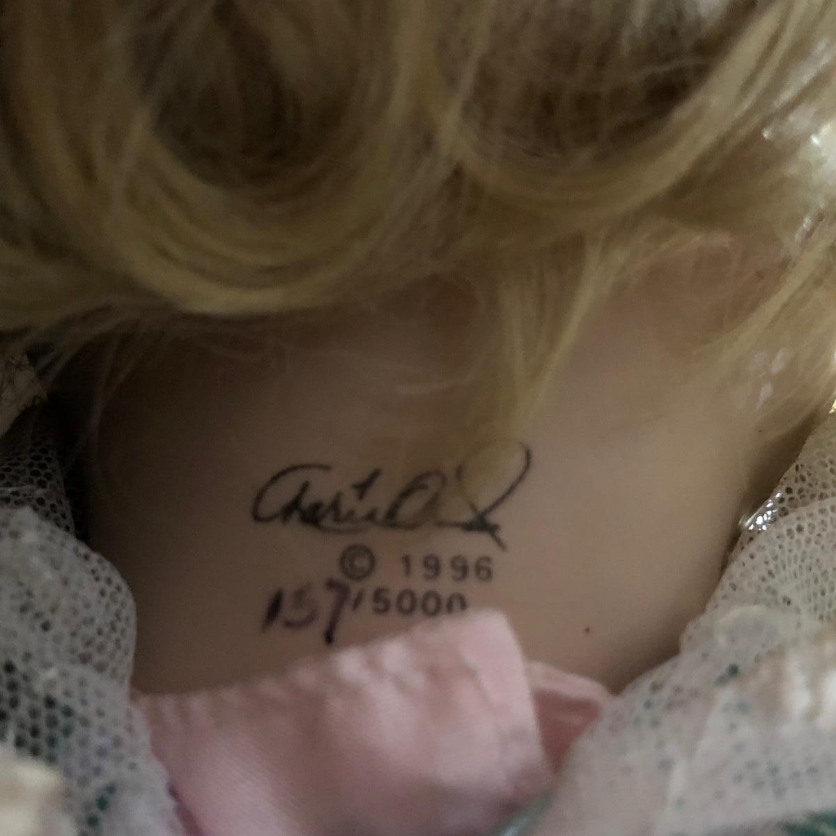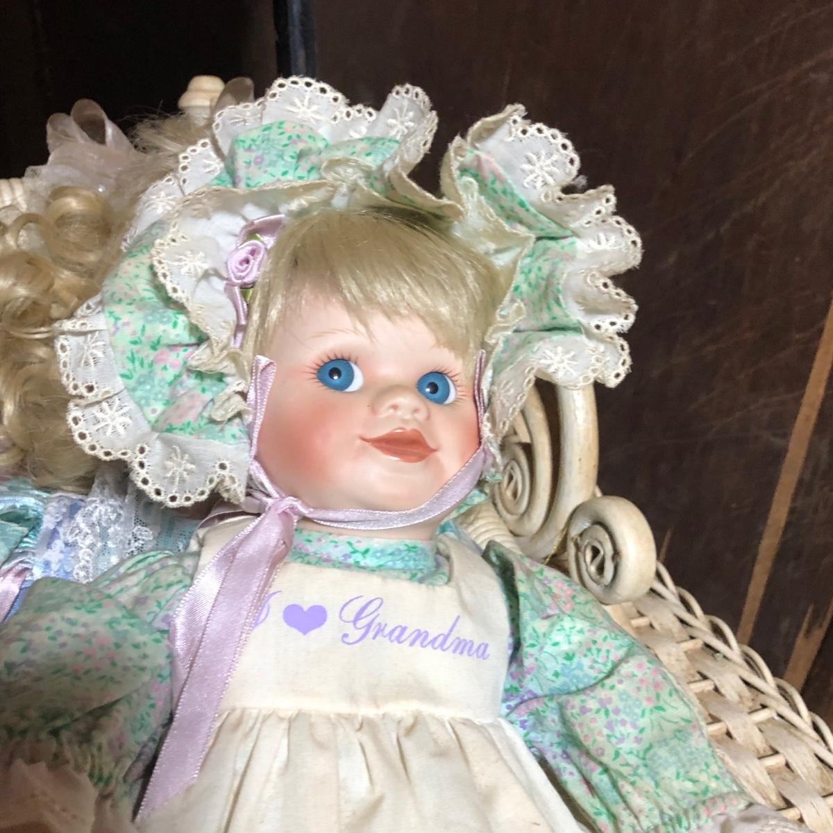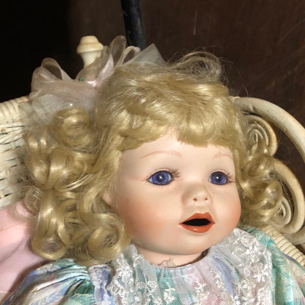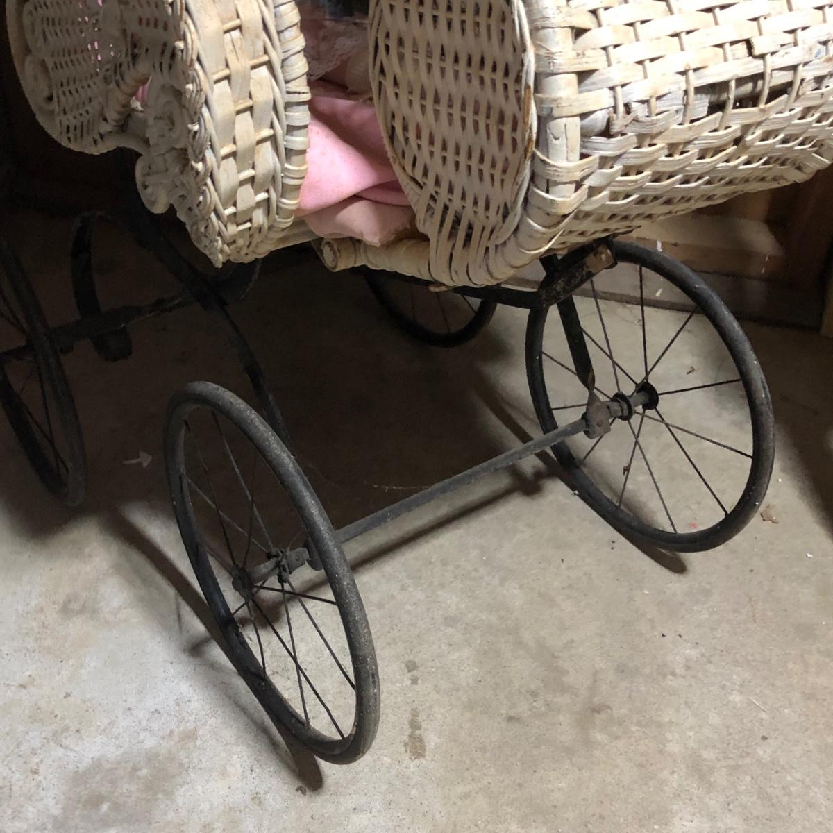 LOT 201M: Vintage Wicker Stroller w/ Pink Umbrella & Porcelain Dolls