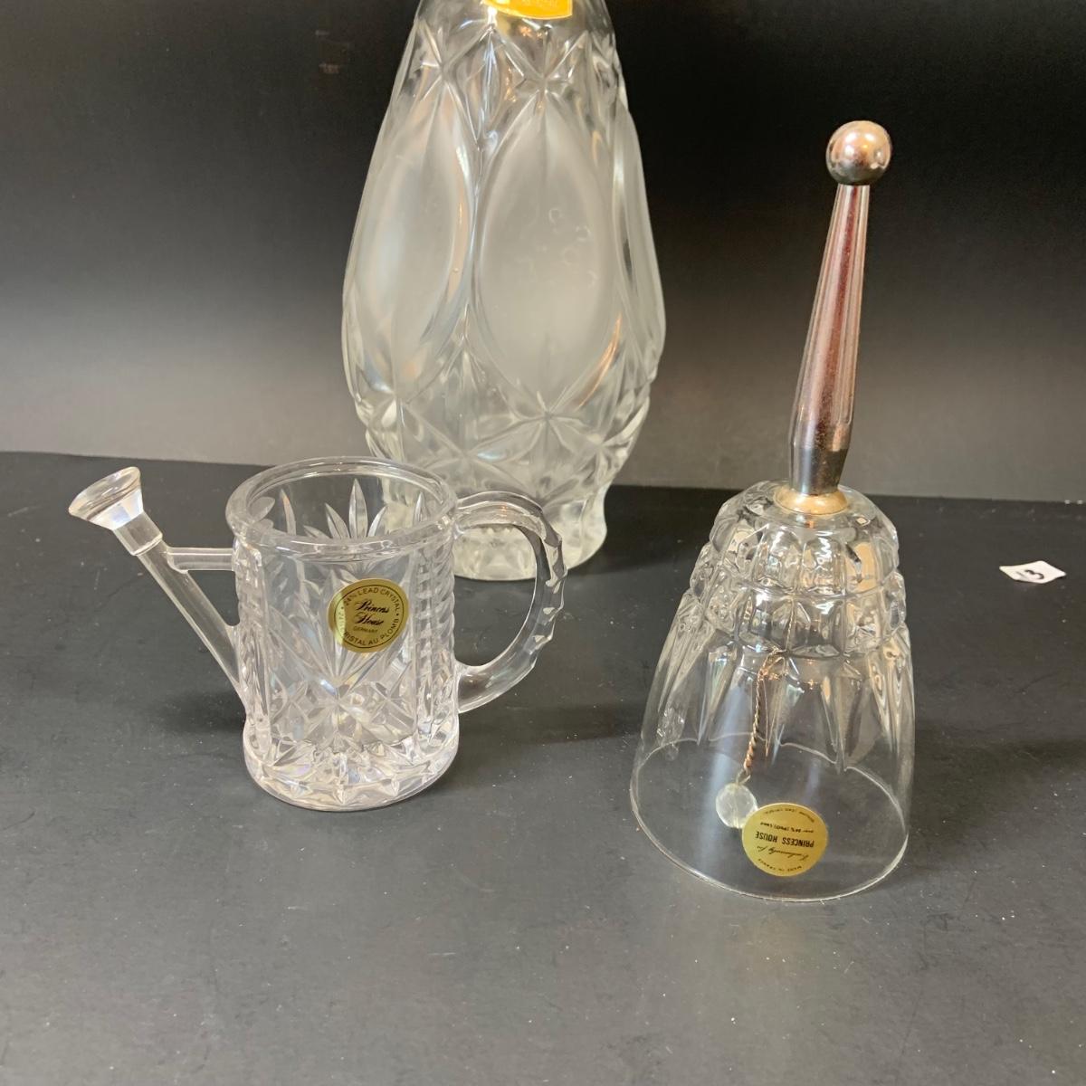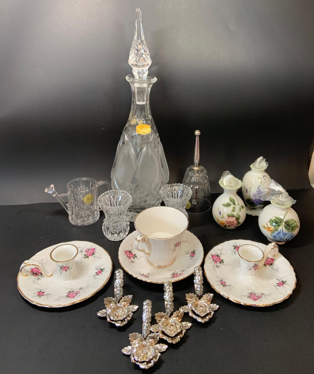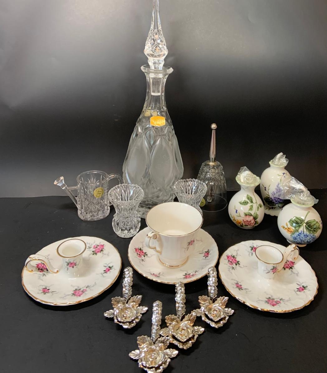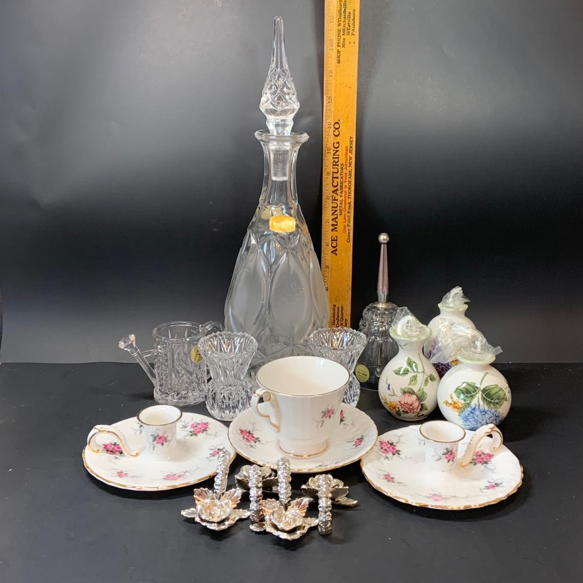 LOT:245G: Princess House - Lead Crystal Decanter, Glass Bell, Watering Can, Small Vases, Ceramic Oil Burners, Tea Cup, Candle Holders and Napkin Rings
