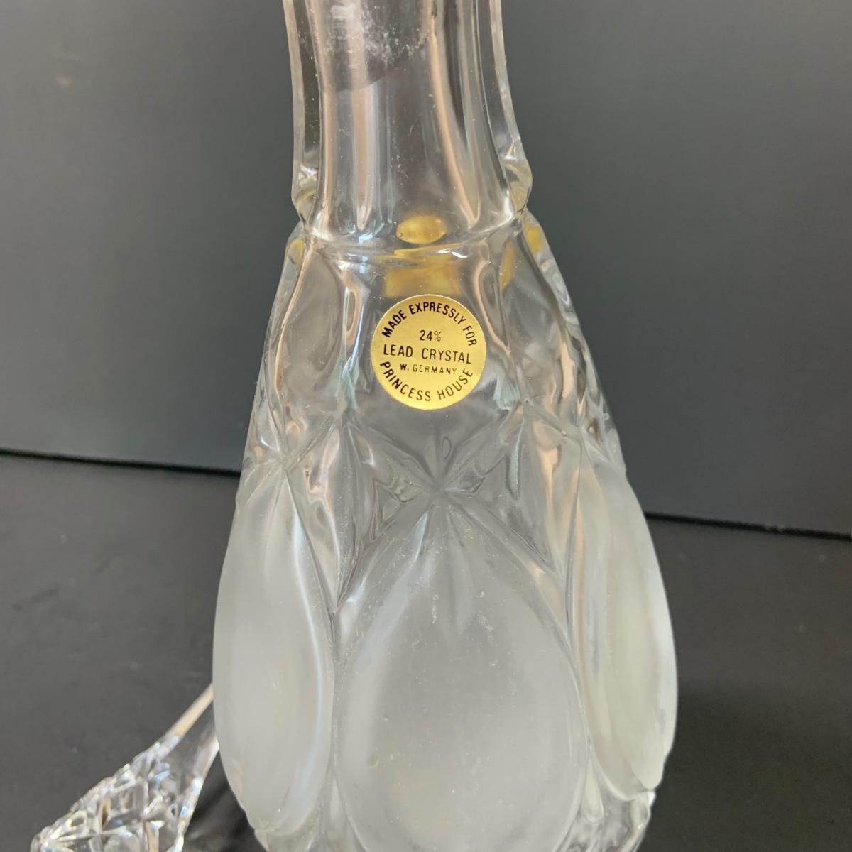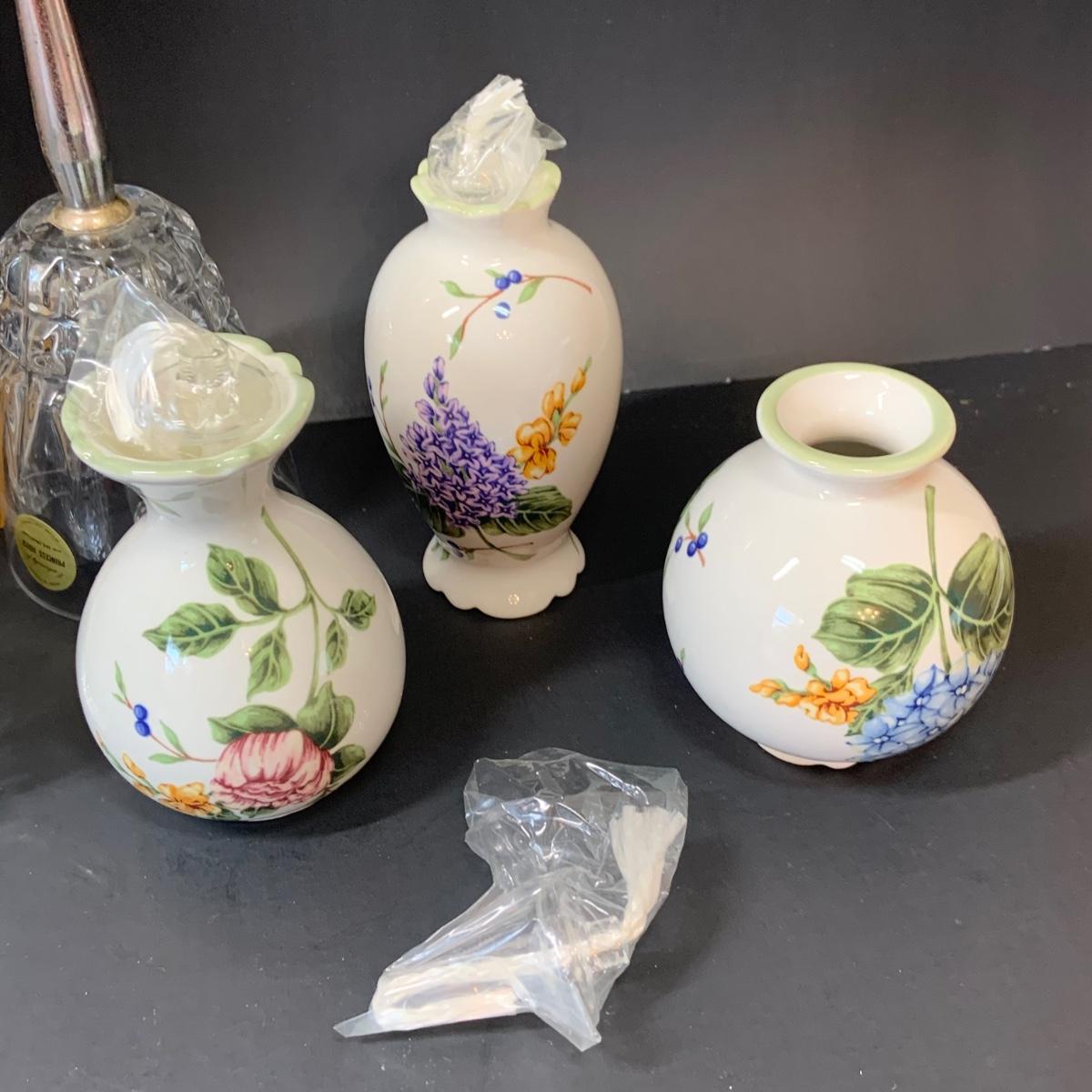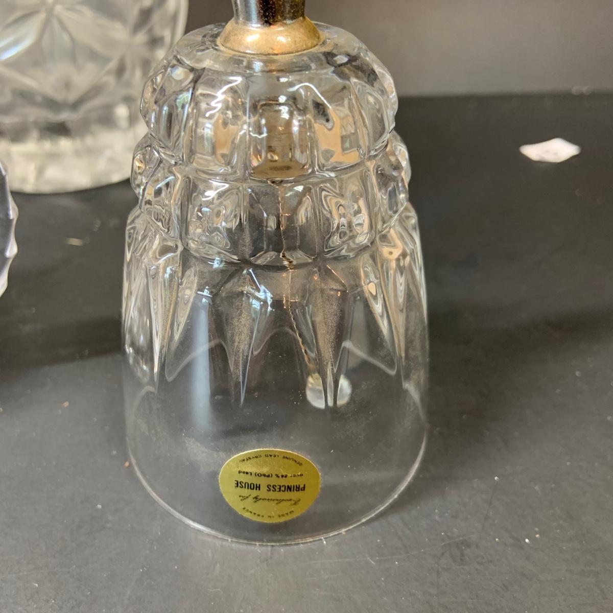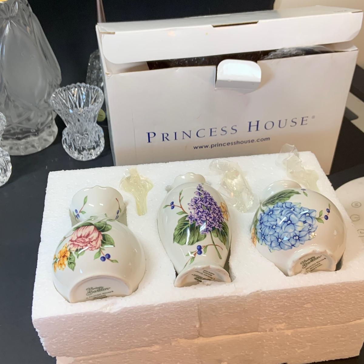 LOT:245G: Princess House - Lead Crystal Decanter, Glass Bell, Watering Can, Small Vases, Ceramic Oil Burners, Tea Cup, Candle Holders and Napkin Rings