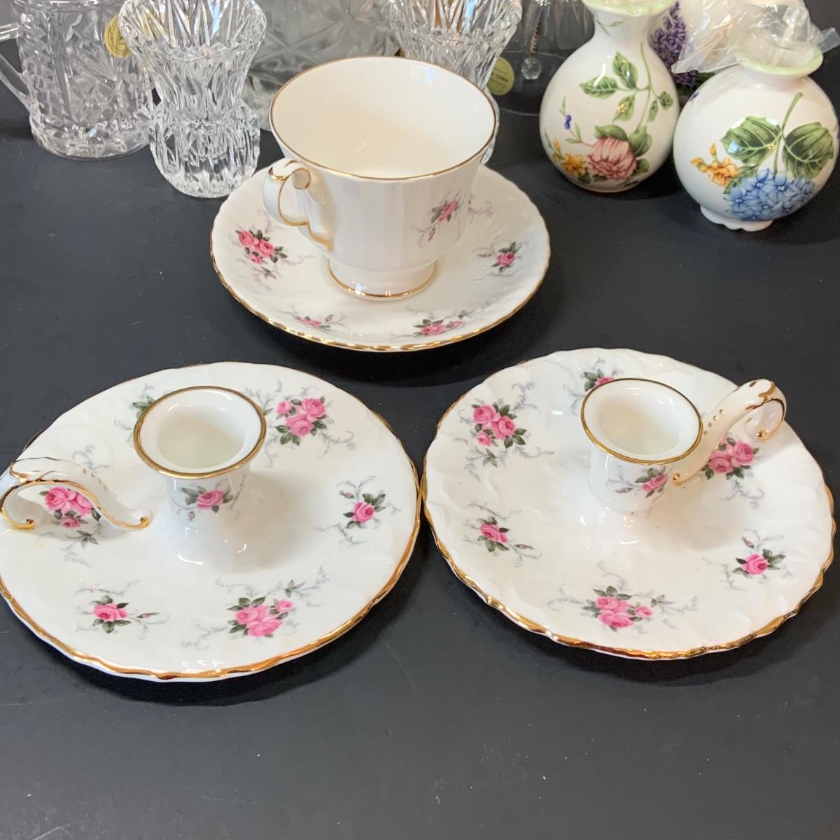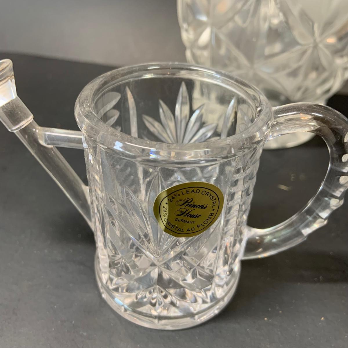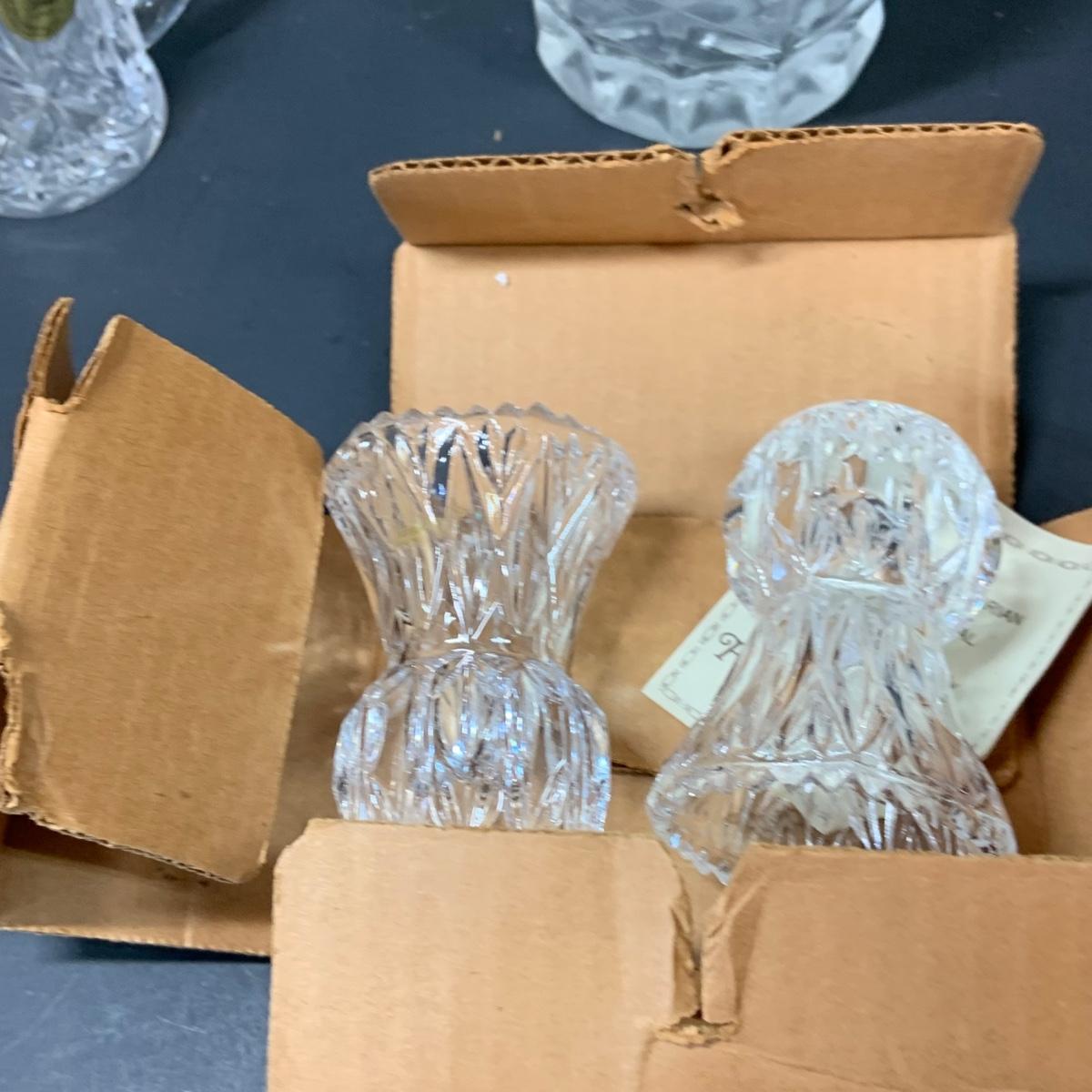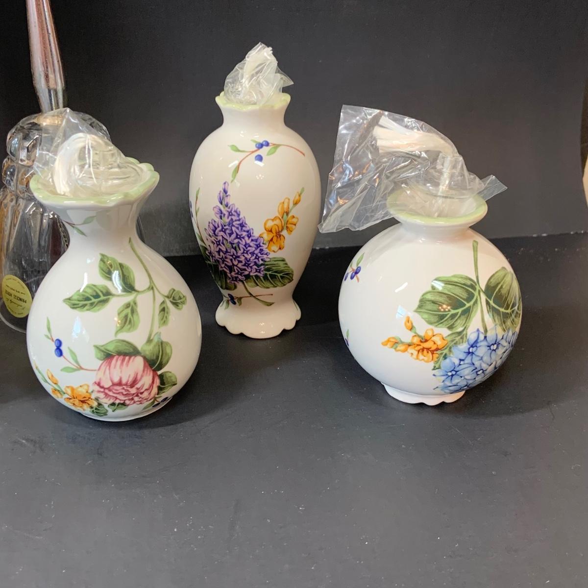 LOT:245G: Princess House - Lead Crystal Decanter, Glass Bell, Watering Can, Small Vases, Ceramic Oil Burners, Tea Cup, Candle Holders and Napkin Rings