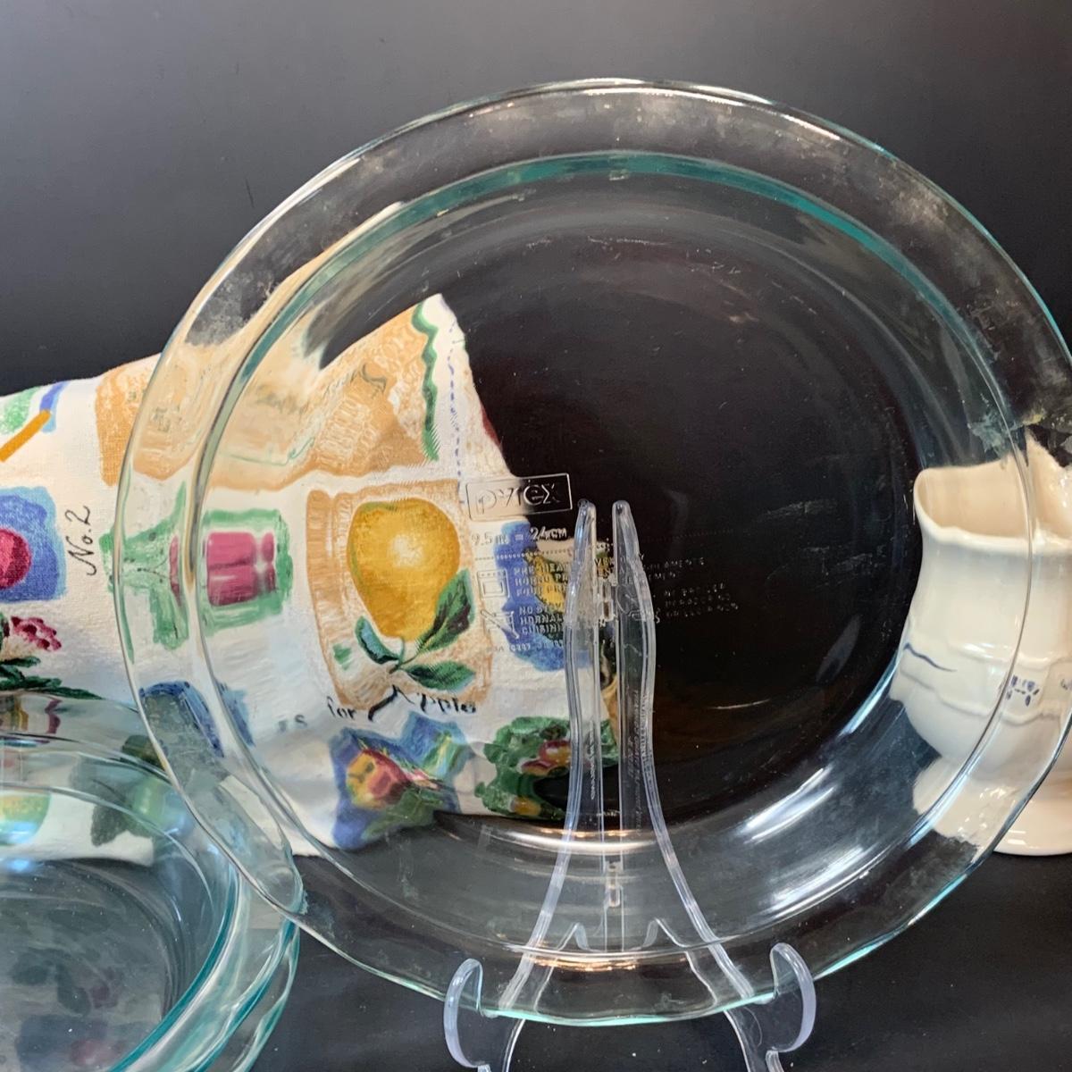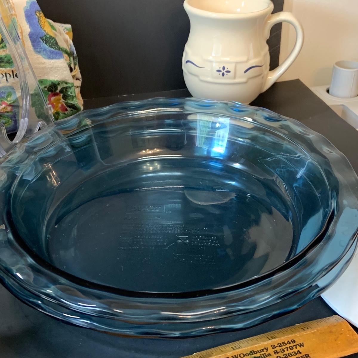 LOT:248: Pyrex Pie Pans 2 Blue, 3 Clear, Pyrex Crazy Daisy Mixing Bowl,  Longaberger Ceramic Creamer, Butter Boat and More