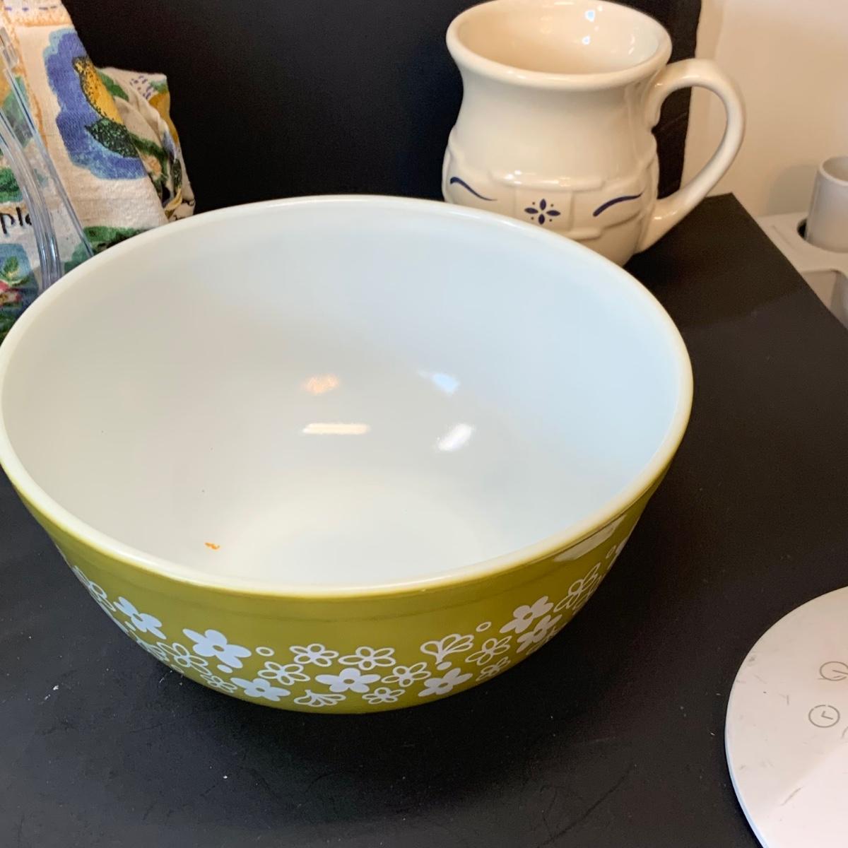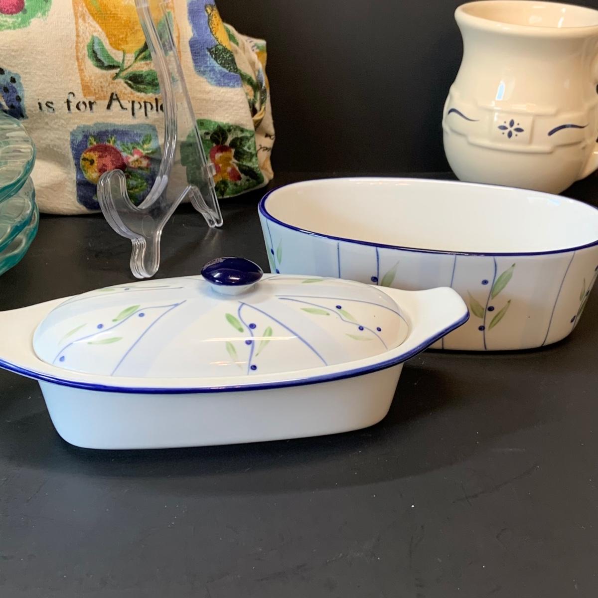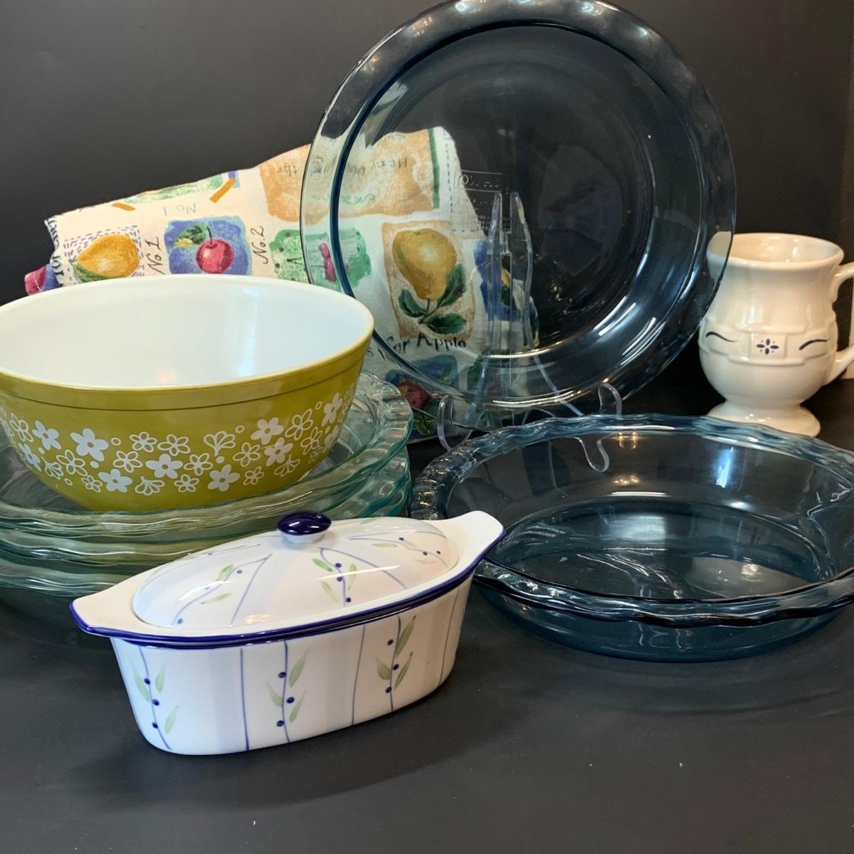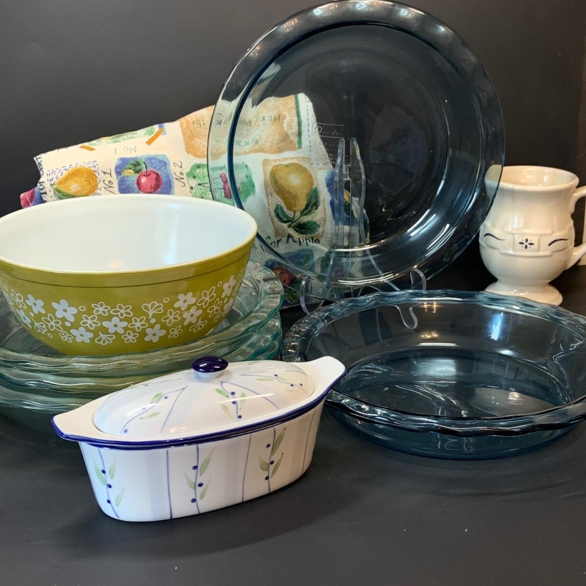 LOT:248: Pyrex Pie Pans 2 Blue, 3 Clear, Pyrex Crazy Daisy Mixing Bowl, Longaberger Ceramic Creamer, Butter Boat and More