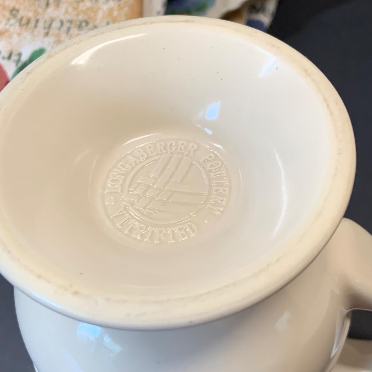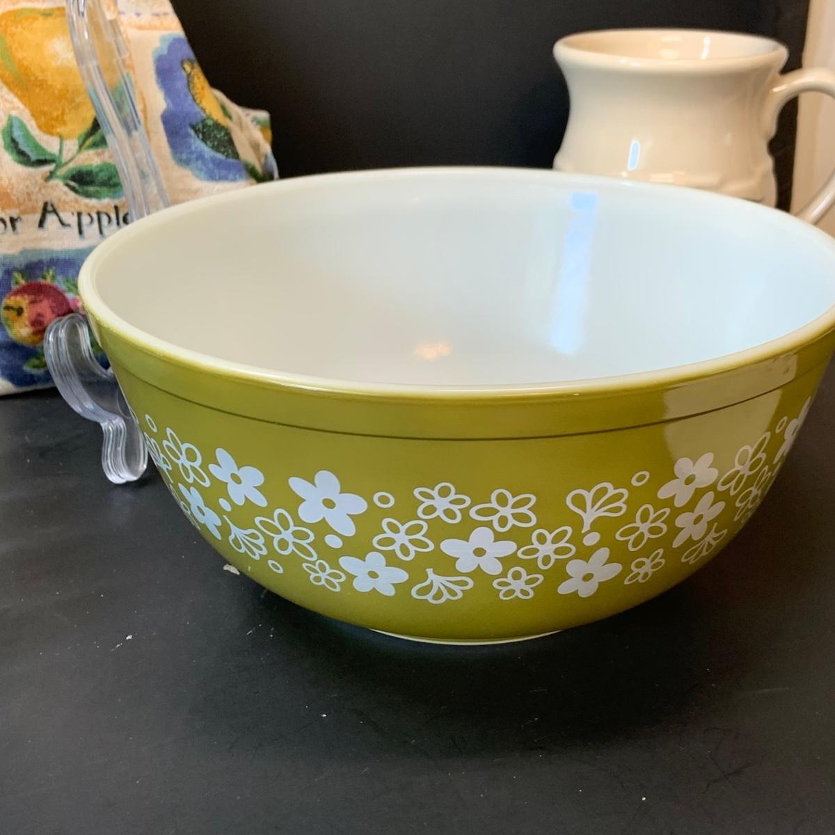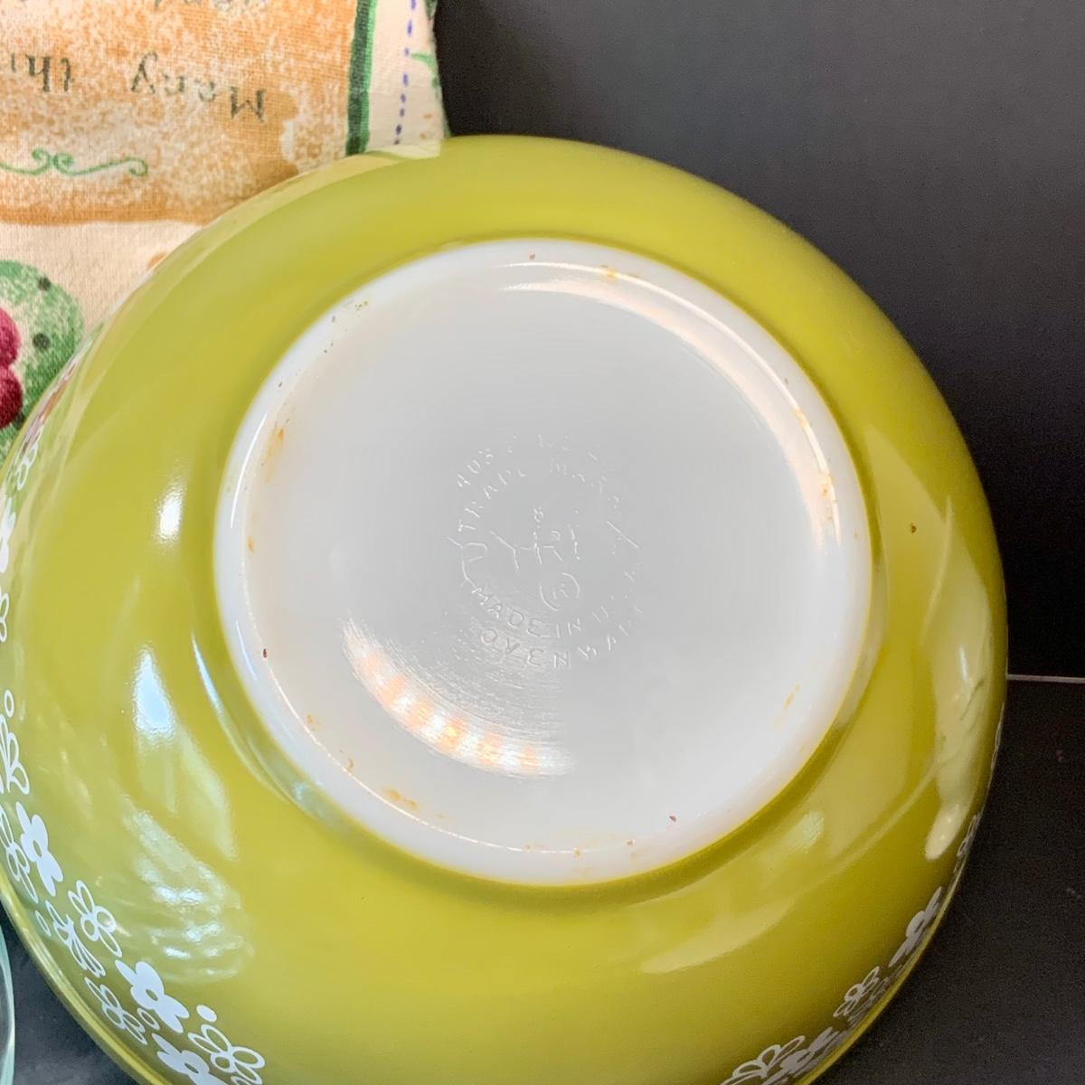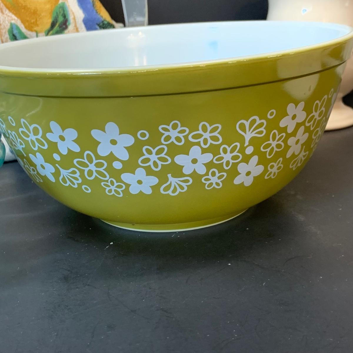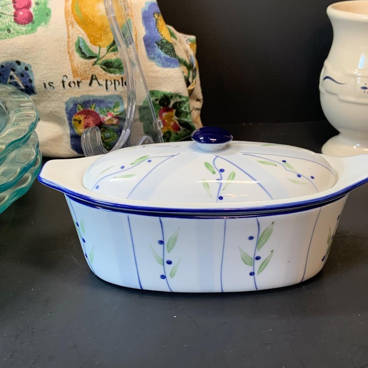 LOT:248: Pyrex Pie Pans 2 Blue, 3 Clear, Pyrex Crazy Daisy Mixing Bowl, Longaberger Ceramic Creamer, Butter Boat and More