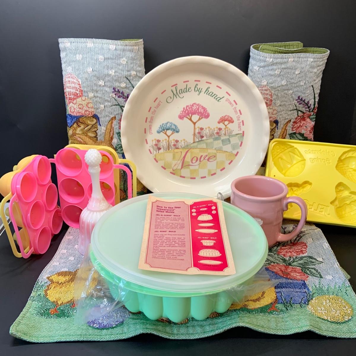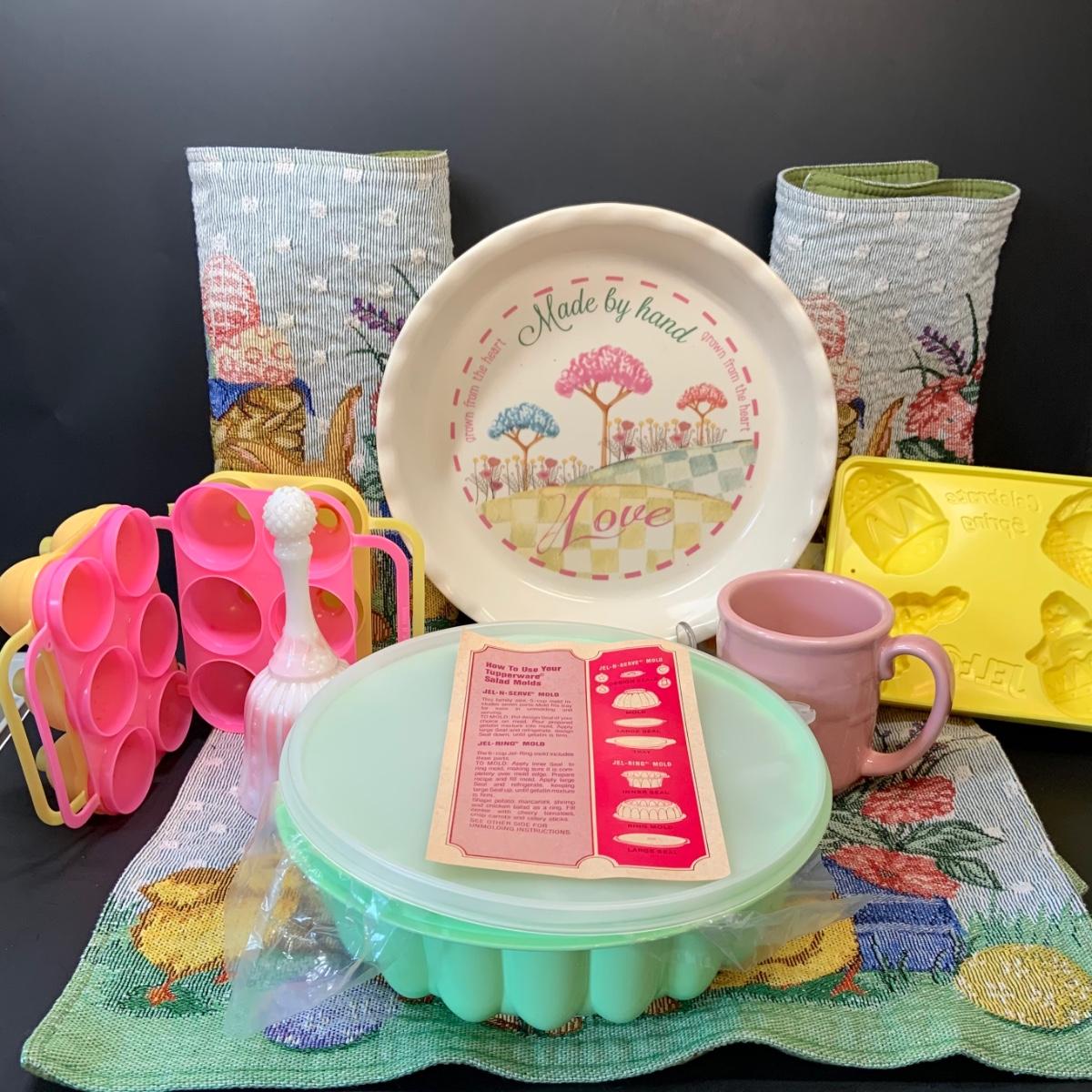 LOT:249G: Jello It's Spring - Spring Themed and Other Jello Molds, Pink  Longaberger Ceramic Mug. Pie Dish and More