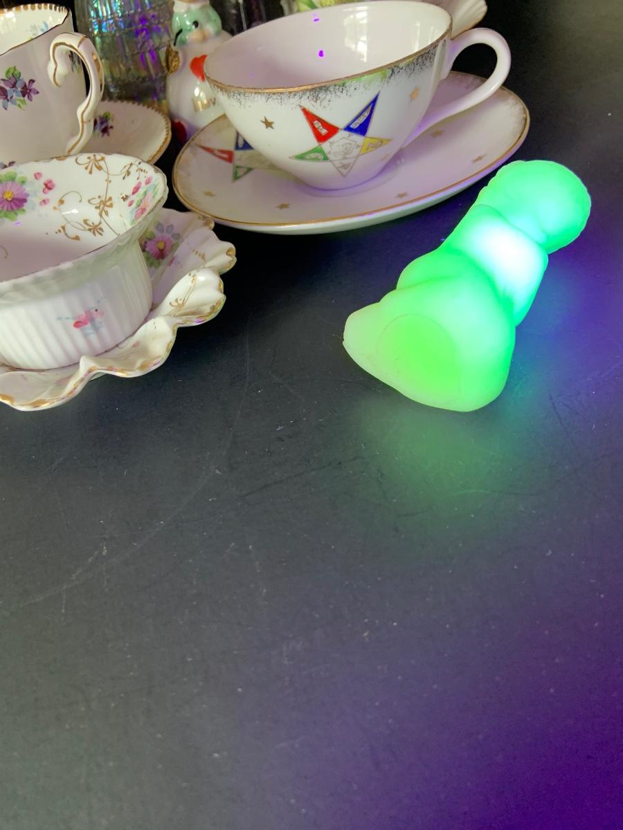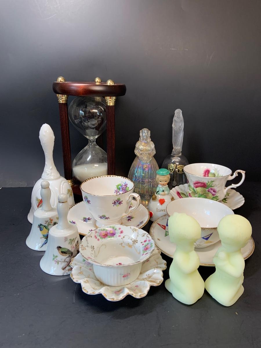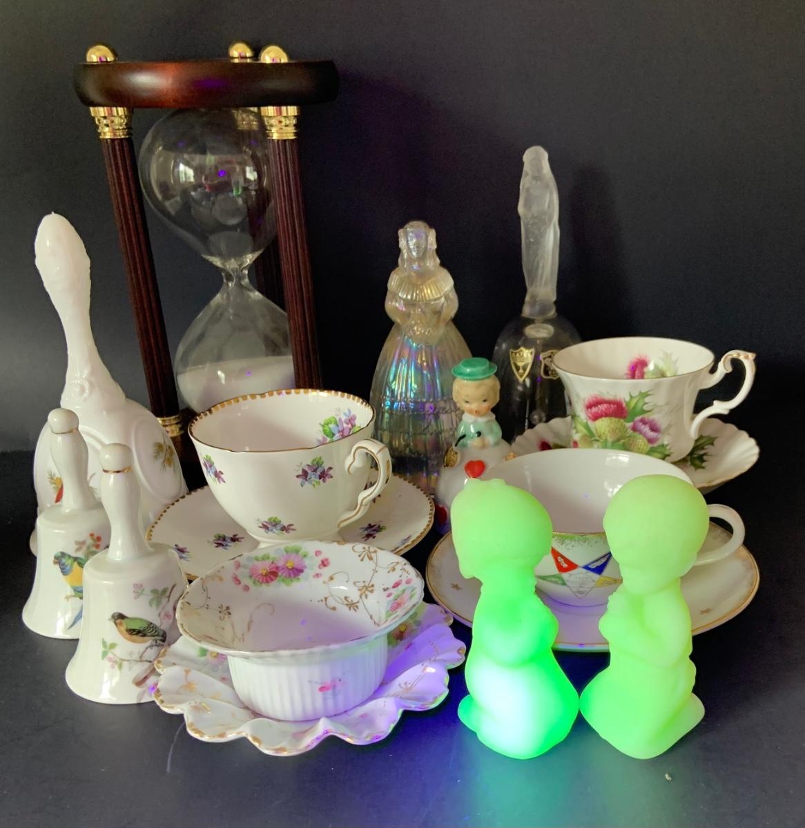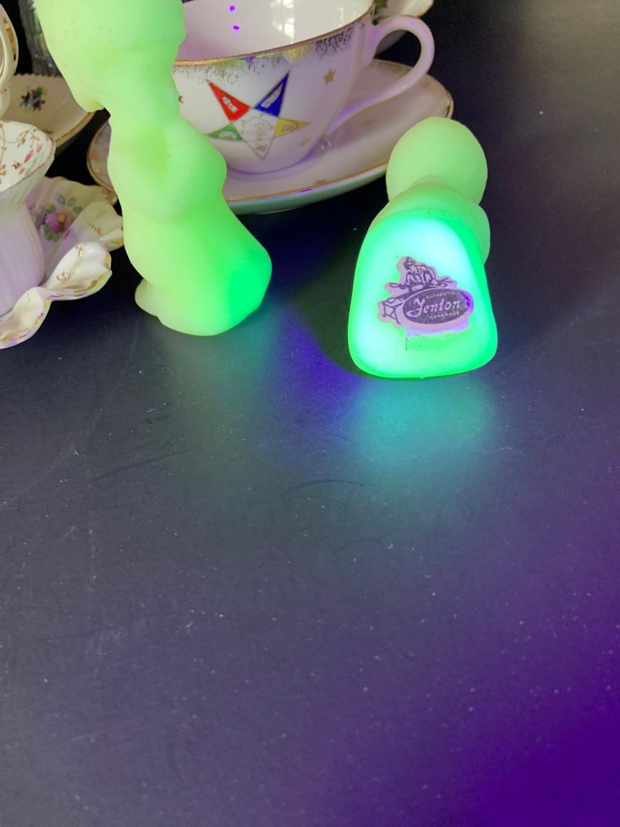LOT::251G: Fenton Green Custard Uranium Glass Praying Girl & Boy; Tea Cups & Saucers, Bells Imperial Carnival Glass, Milk Glass, Bayel & More