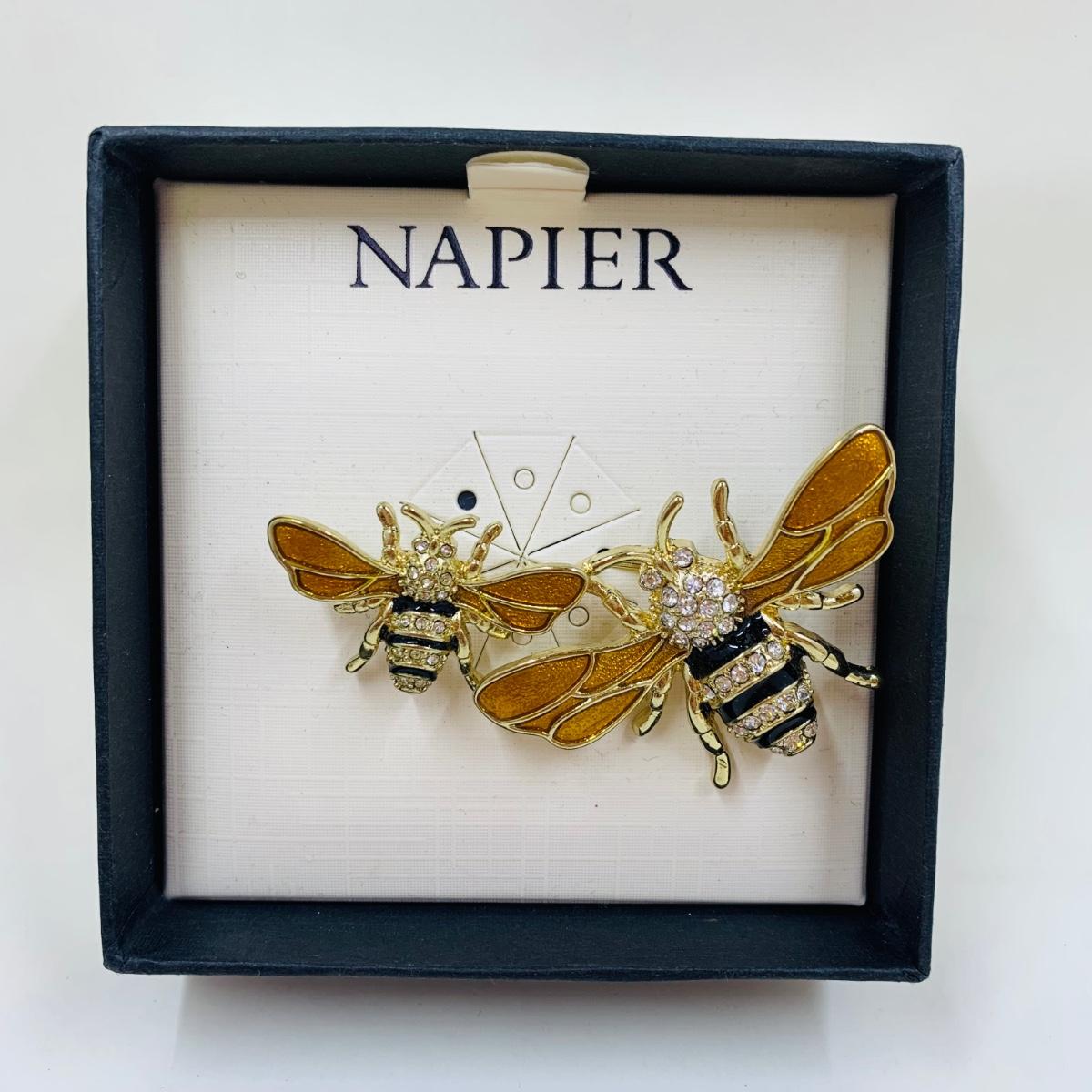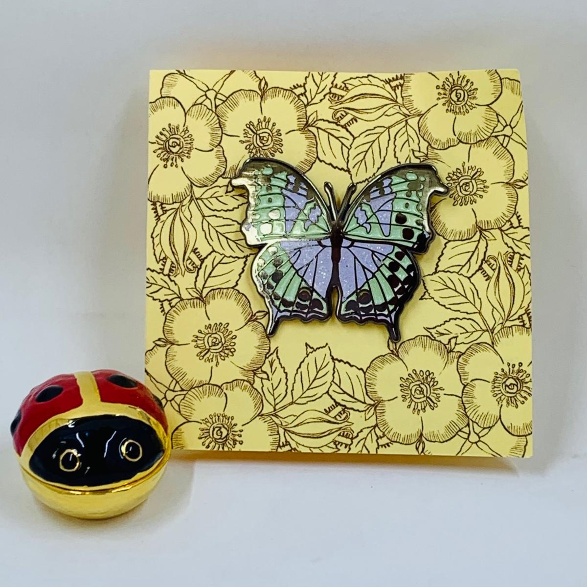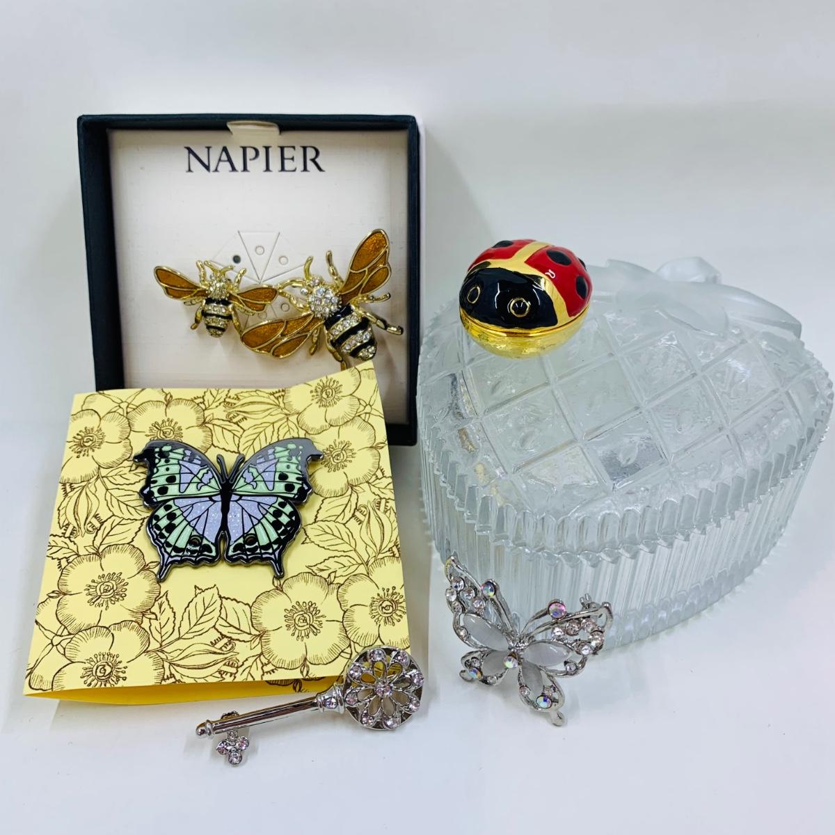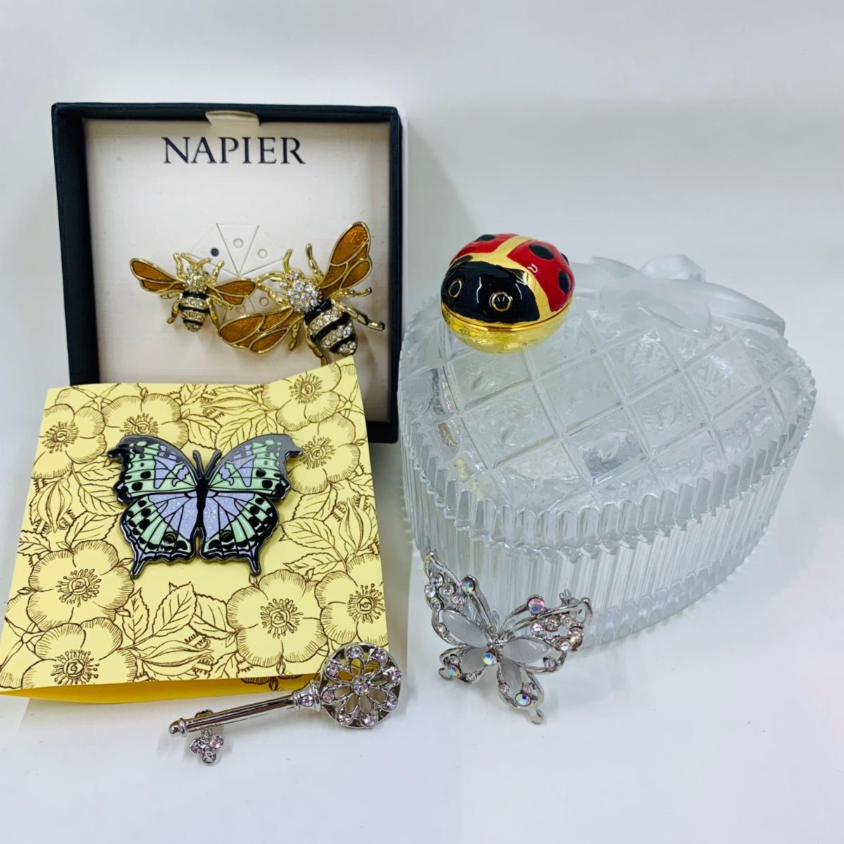 LOT 282R: Napier Bee Brooches, Lady Bug Trinket Box, Floating Fern Butterfly Pin, Strawberry Crystal Trinket Box & More