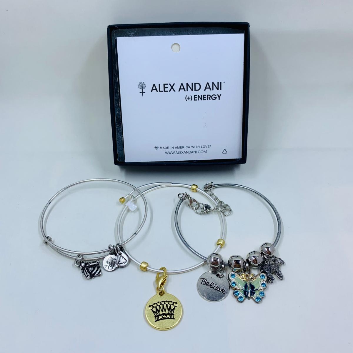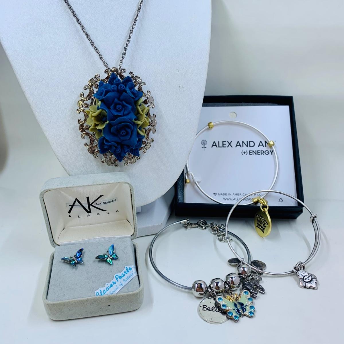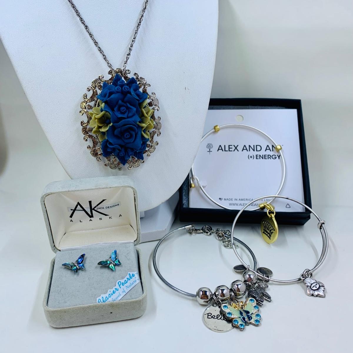 LOT 284R: Glacier Pearle Butterfly Pierced Earrings, Alex & Ani Bracelet & Rose Pendant Necklace