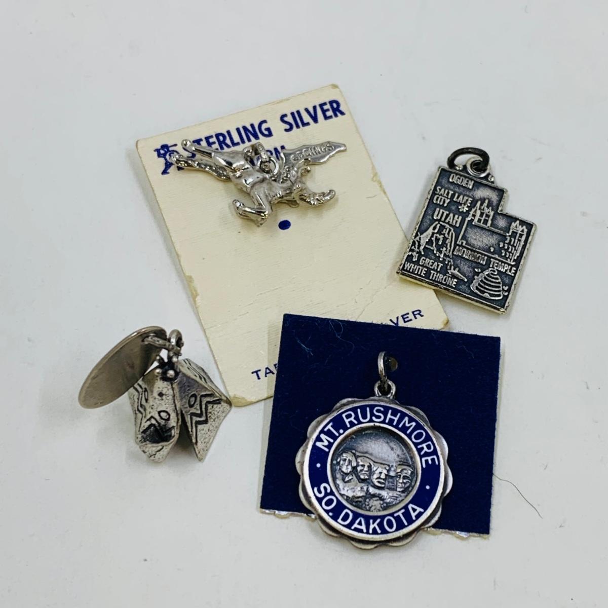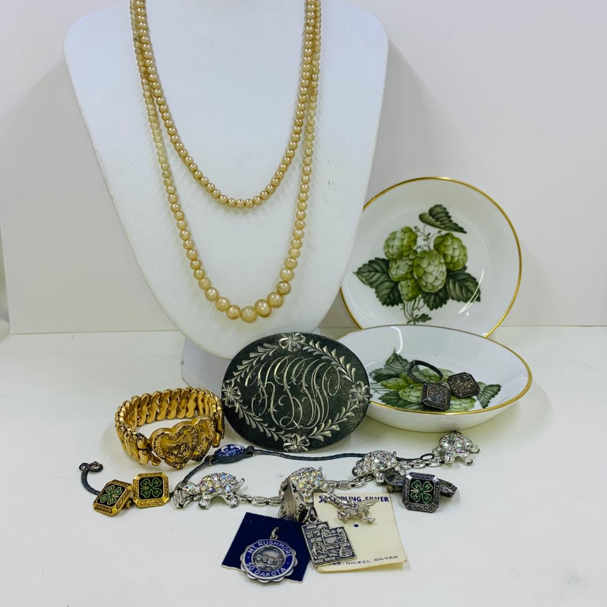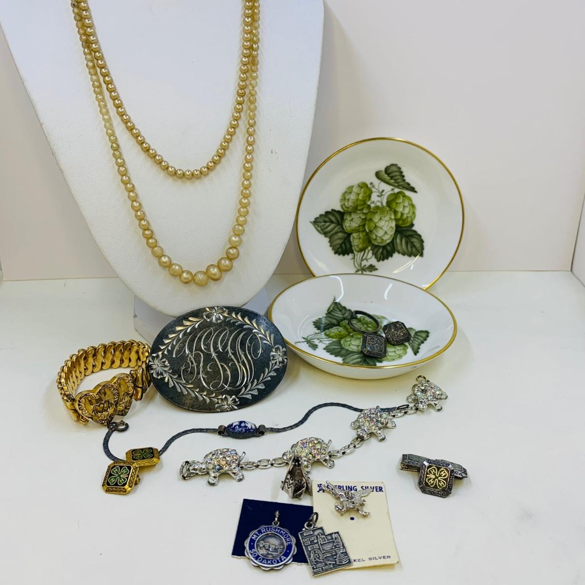 LOT 292R: Sterling Silver Charms & 4-H Pins, Vintage Sweetheart Gold Tone Bracelet, Pearls & More