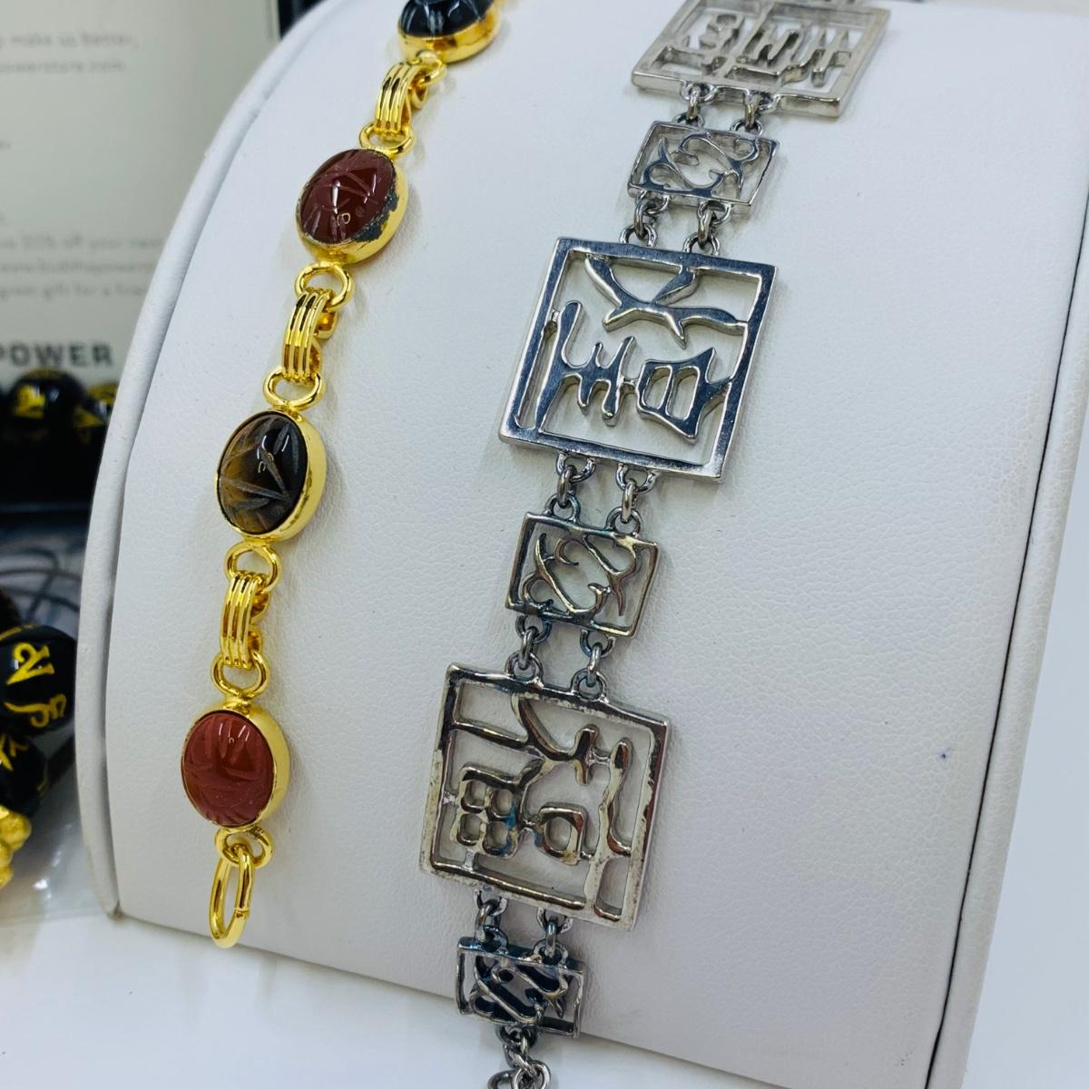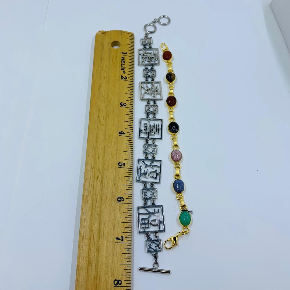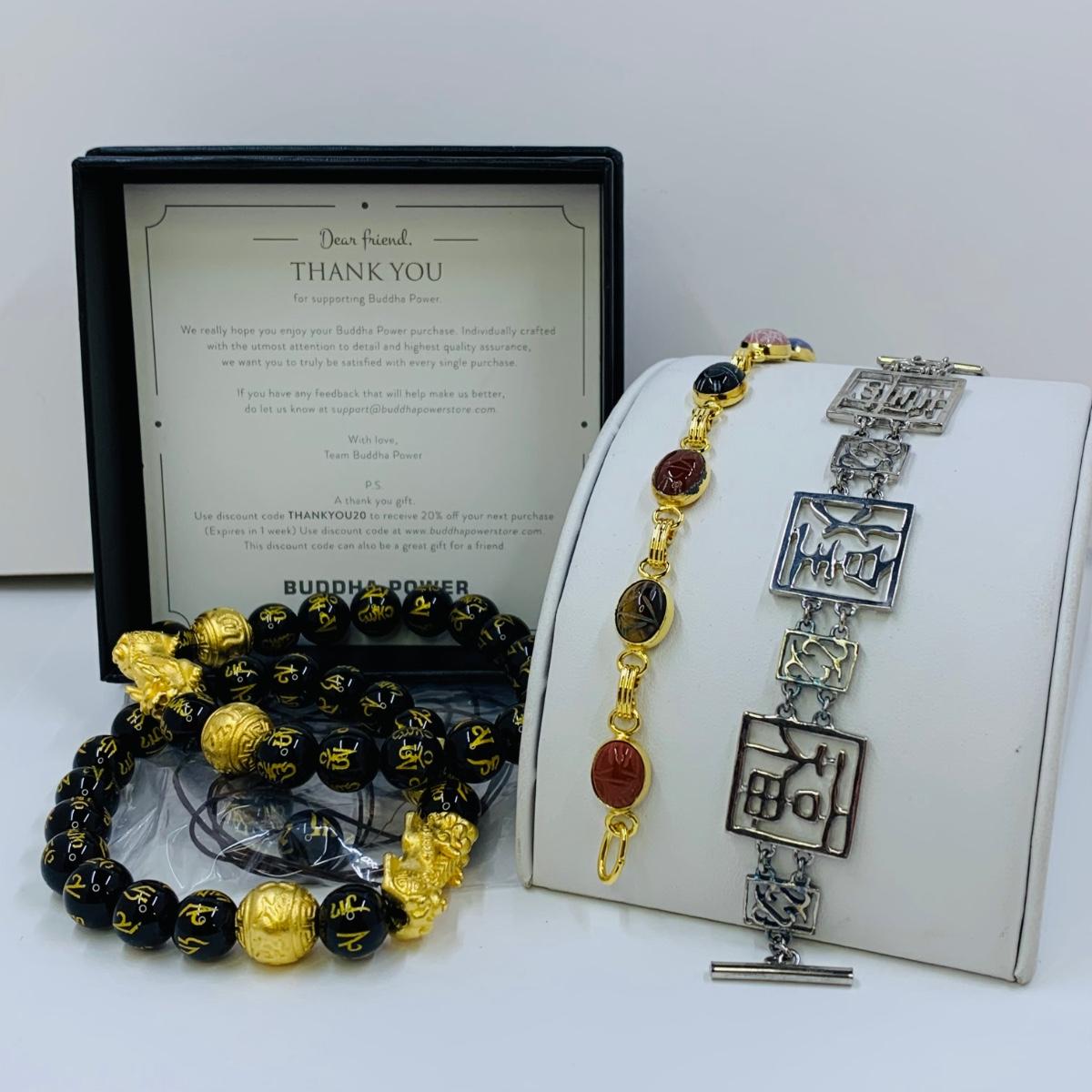 LOT 296R: Budda Power Bracelets, Good Luck Panel Link Bracelet & Multi-Stone Scarab Link Bracelet