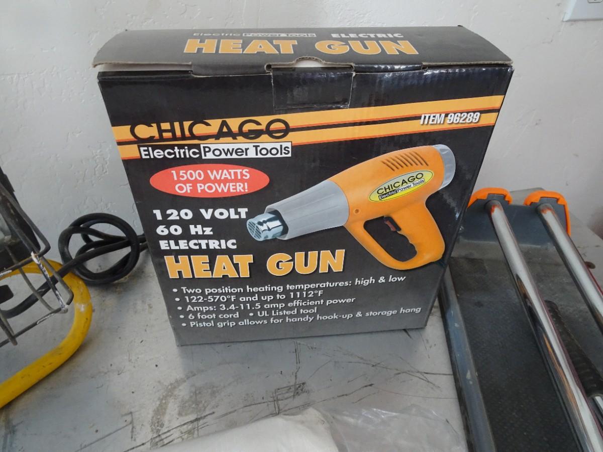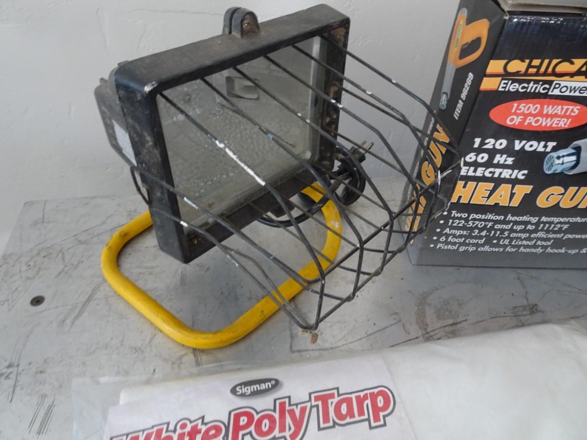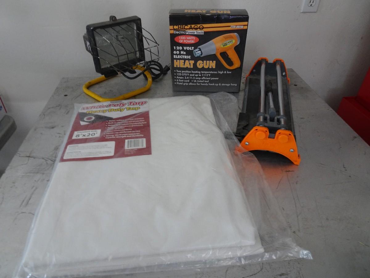 LOT 925. TARP, TILE CUTTER, HEAT GUN AND LIGHT