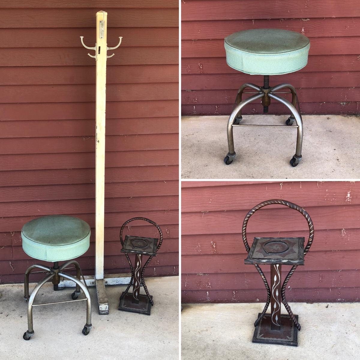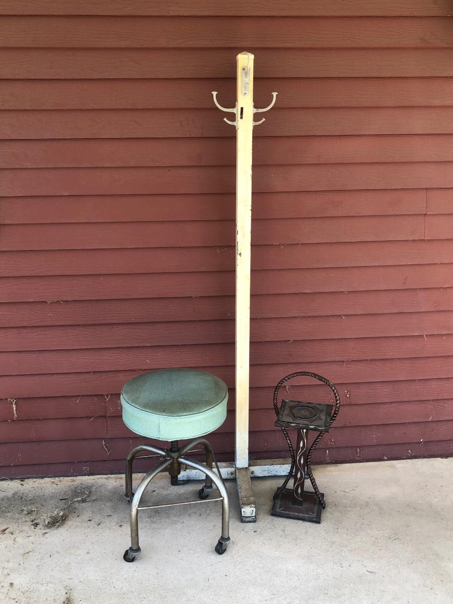 LOT 11M: Vintage Rolling Stool, Ash Tray Table/Stand & Coat Rack