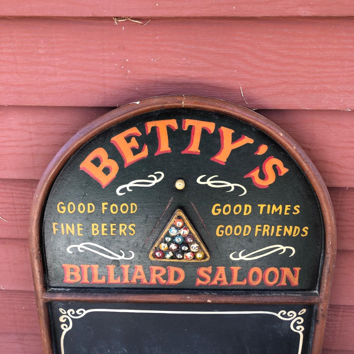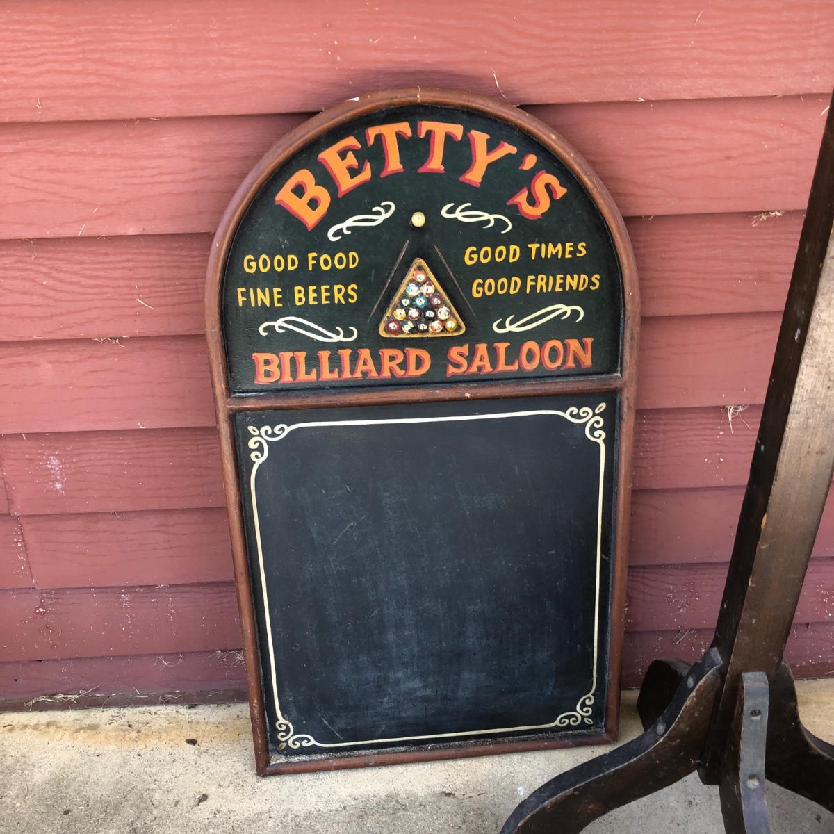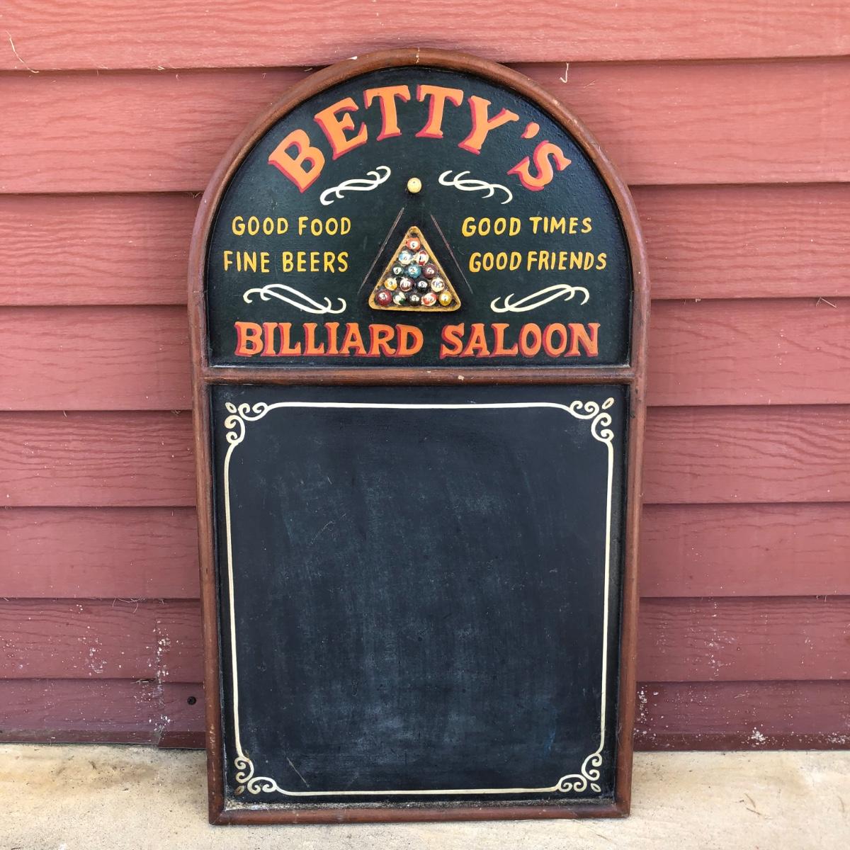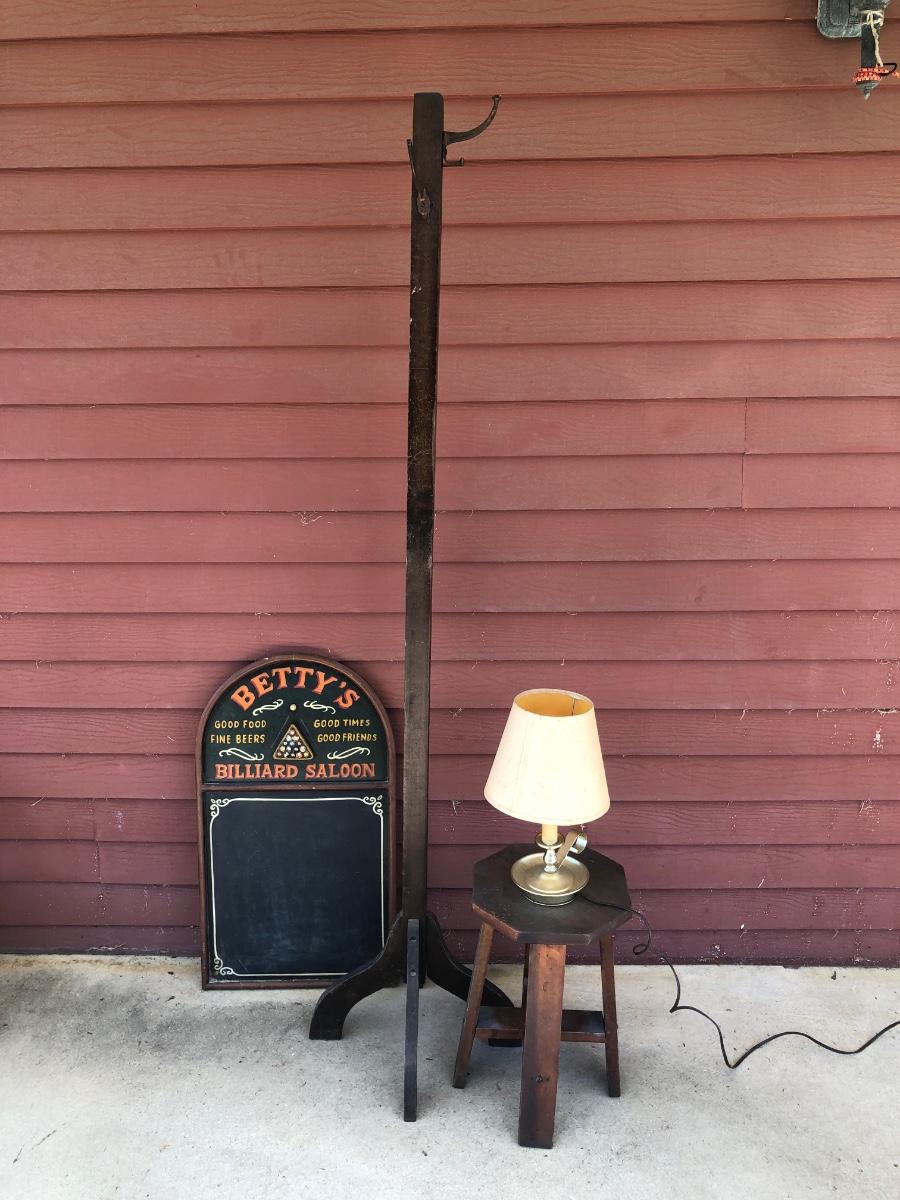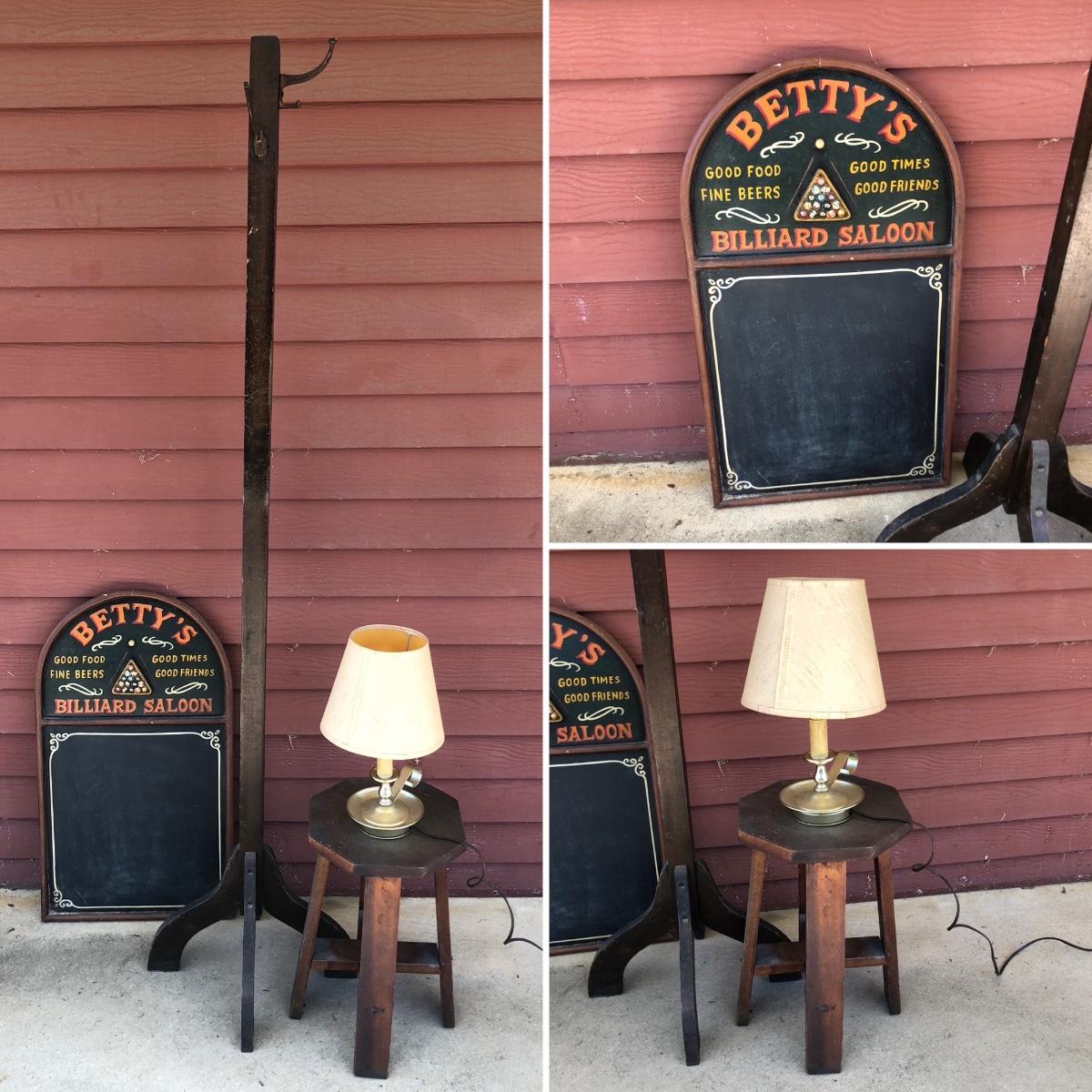 LOT 12M: Vintage Coat Rack, Stool, Betty's Billiard Saloon Chalkboard Sign & Lamp