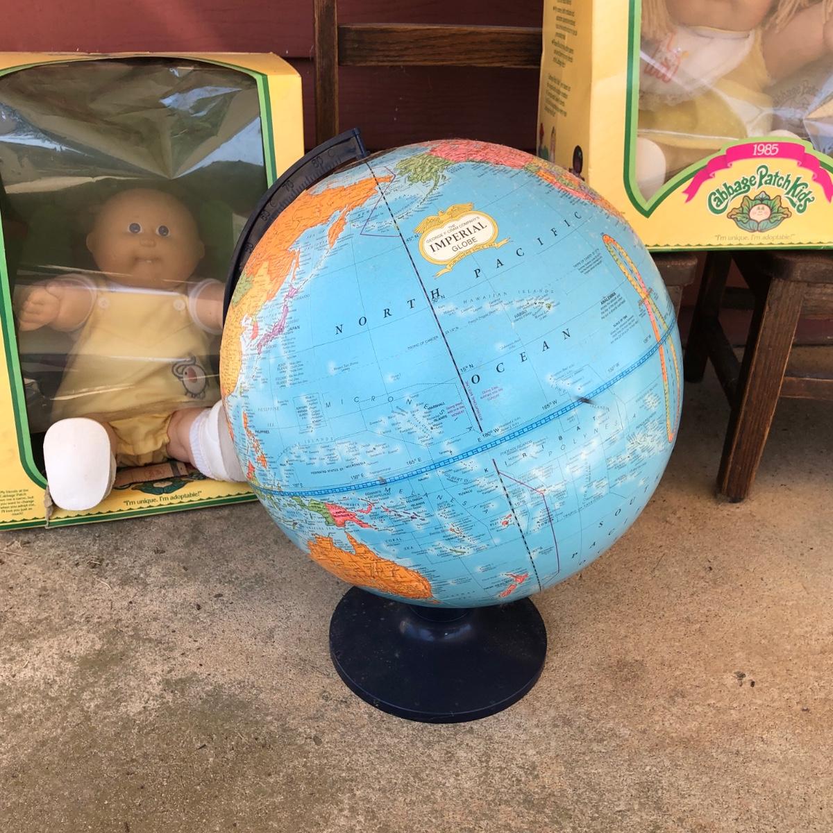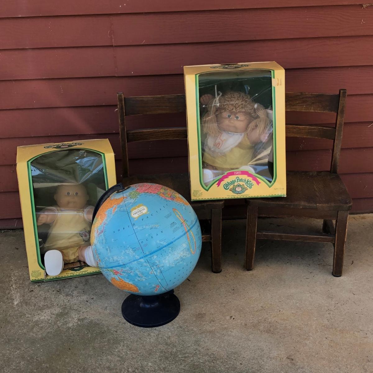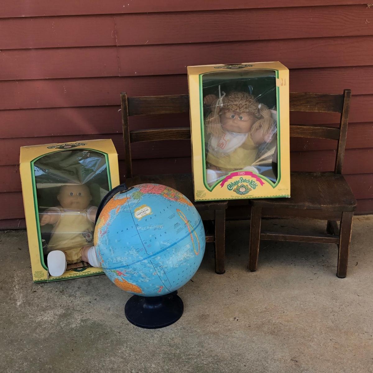 LOT 14M: Vintage Cabbage Patch Kids in Boxes, George F. Cram Co.'s Imperial Globe & 2 Allen Children's Chairs