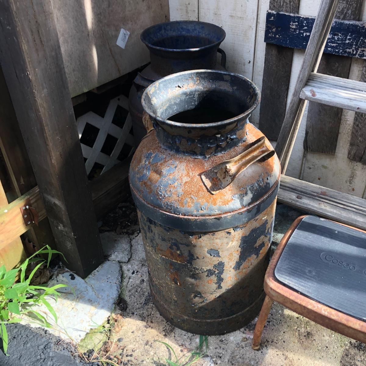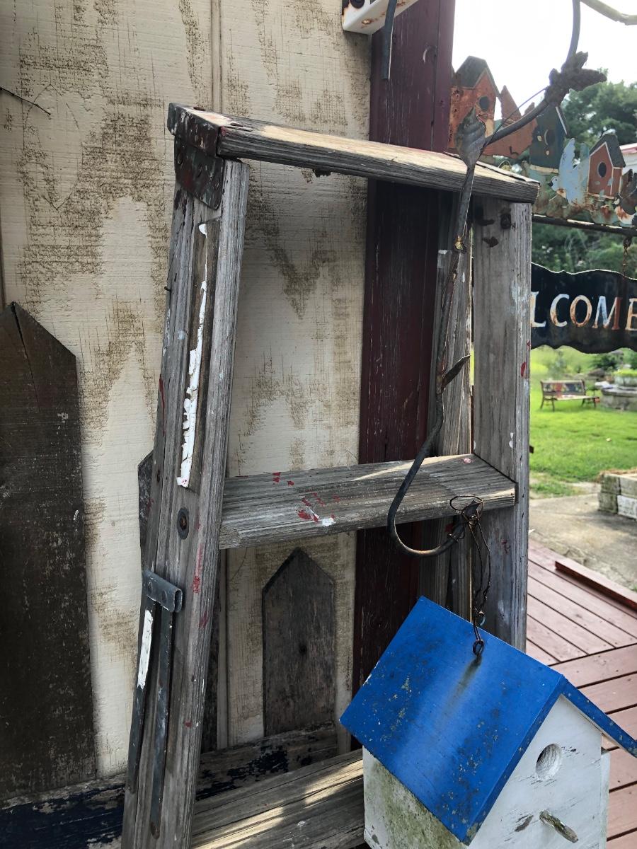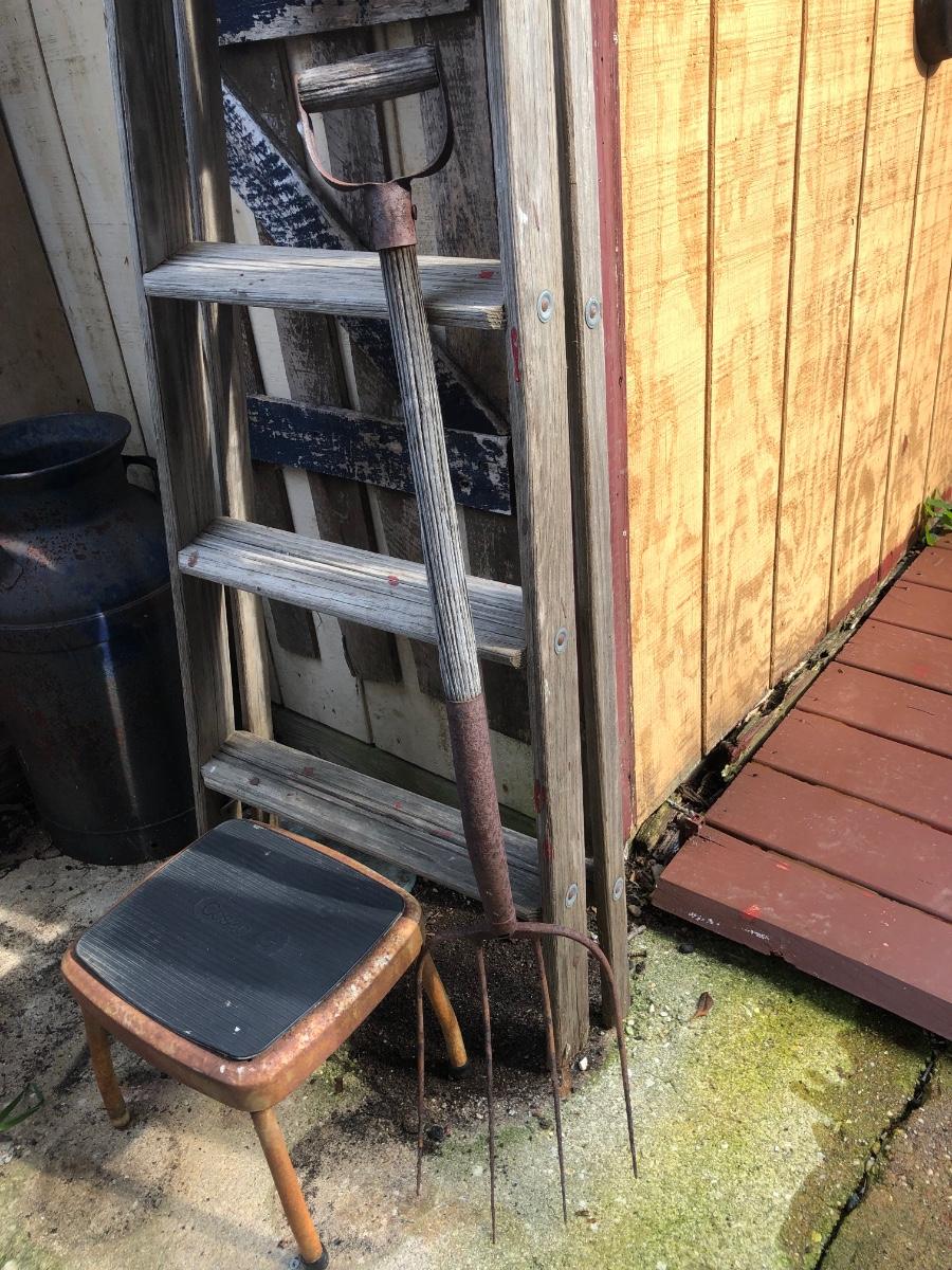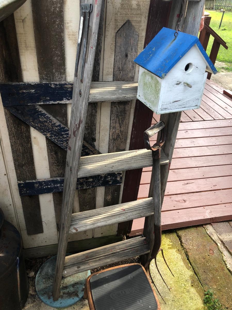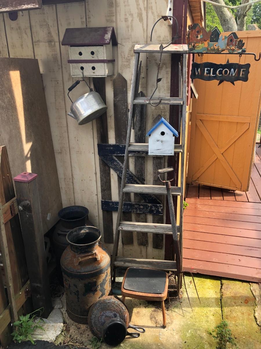 LOT 30M: Vintage Wooden Ladder, Milk Canisters, Cosco Stool, Pitchfork, Cast Iron & Bird Houses