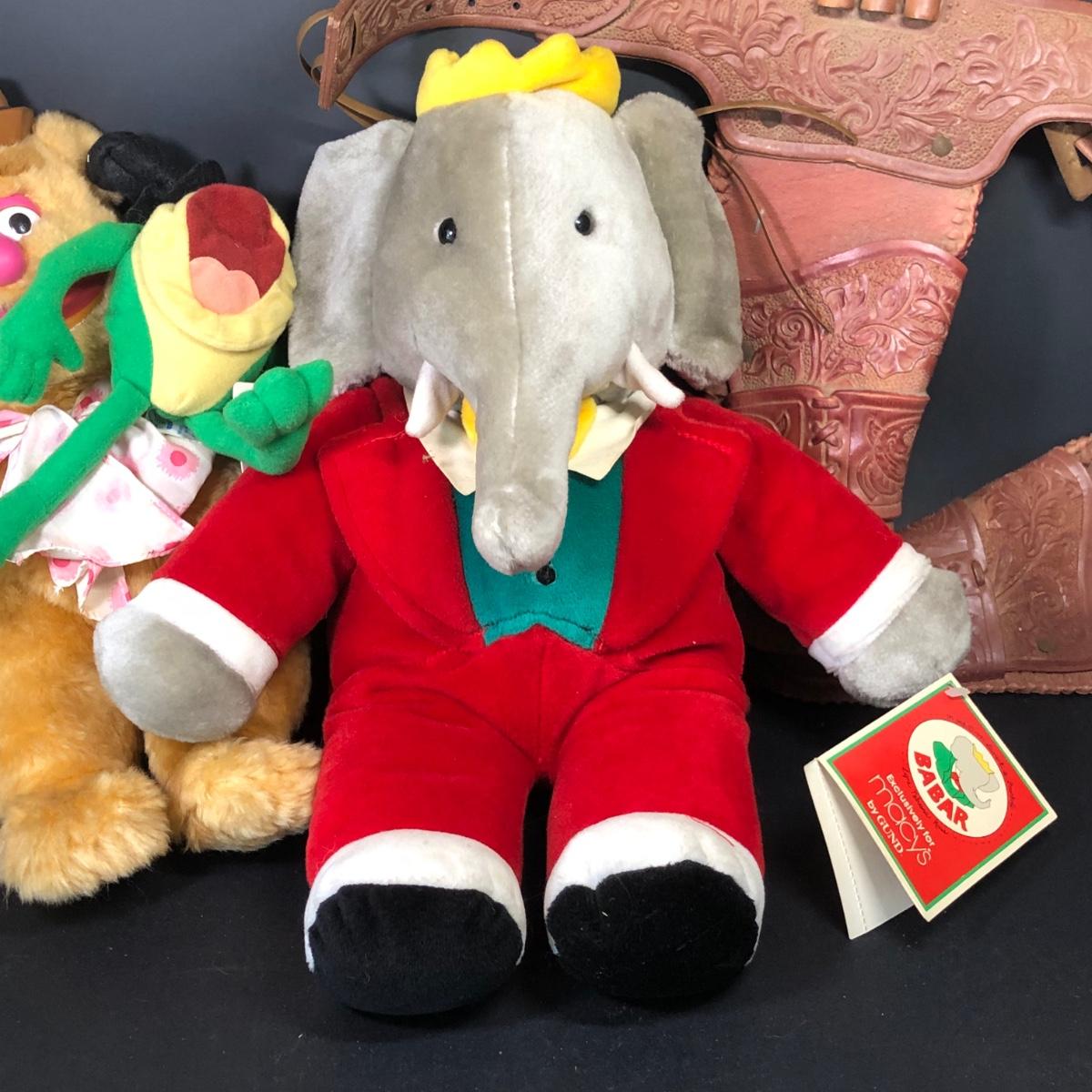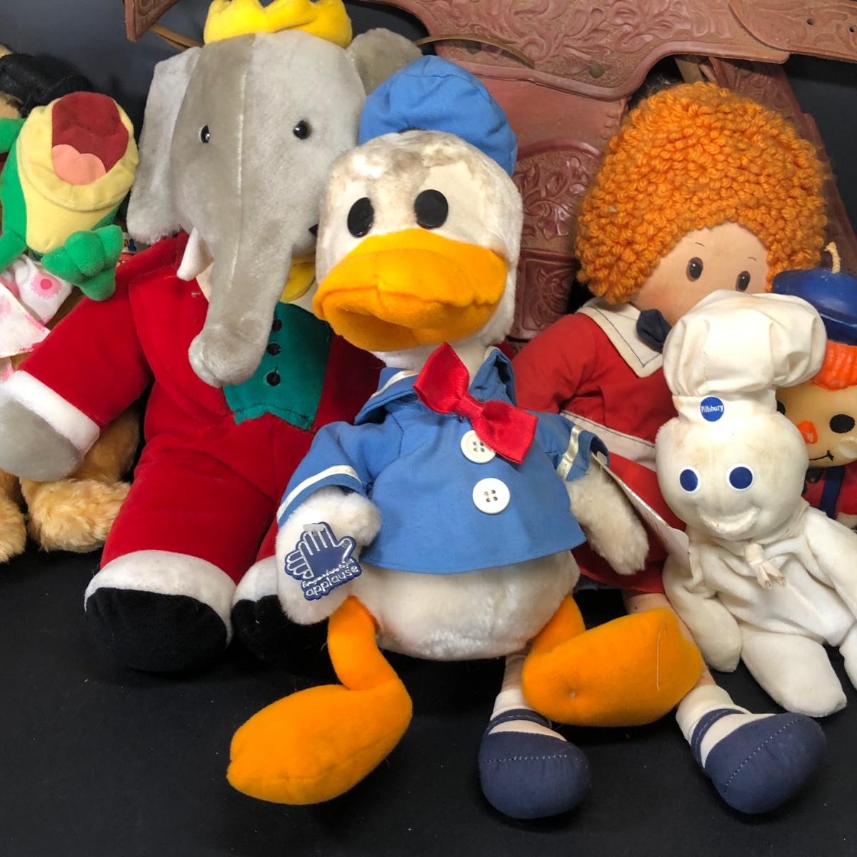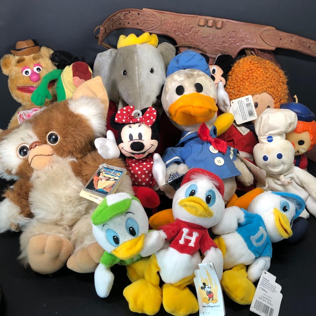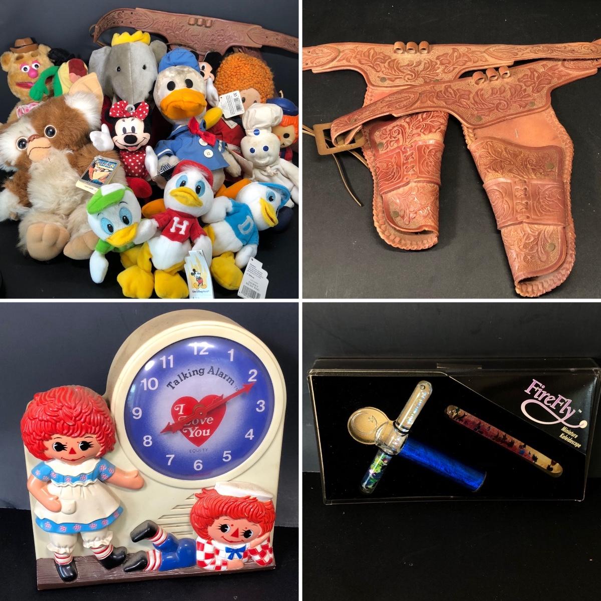 LOT 53M: Stuffed Animal Collection incl. Babar, Donald Duck, Gremlins & More w/ Toy Holsters, 1979 Janex Corp Raggedy Ann Clock & Firefly Mini Kaleidoscope