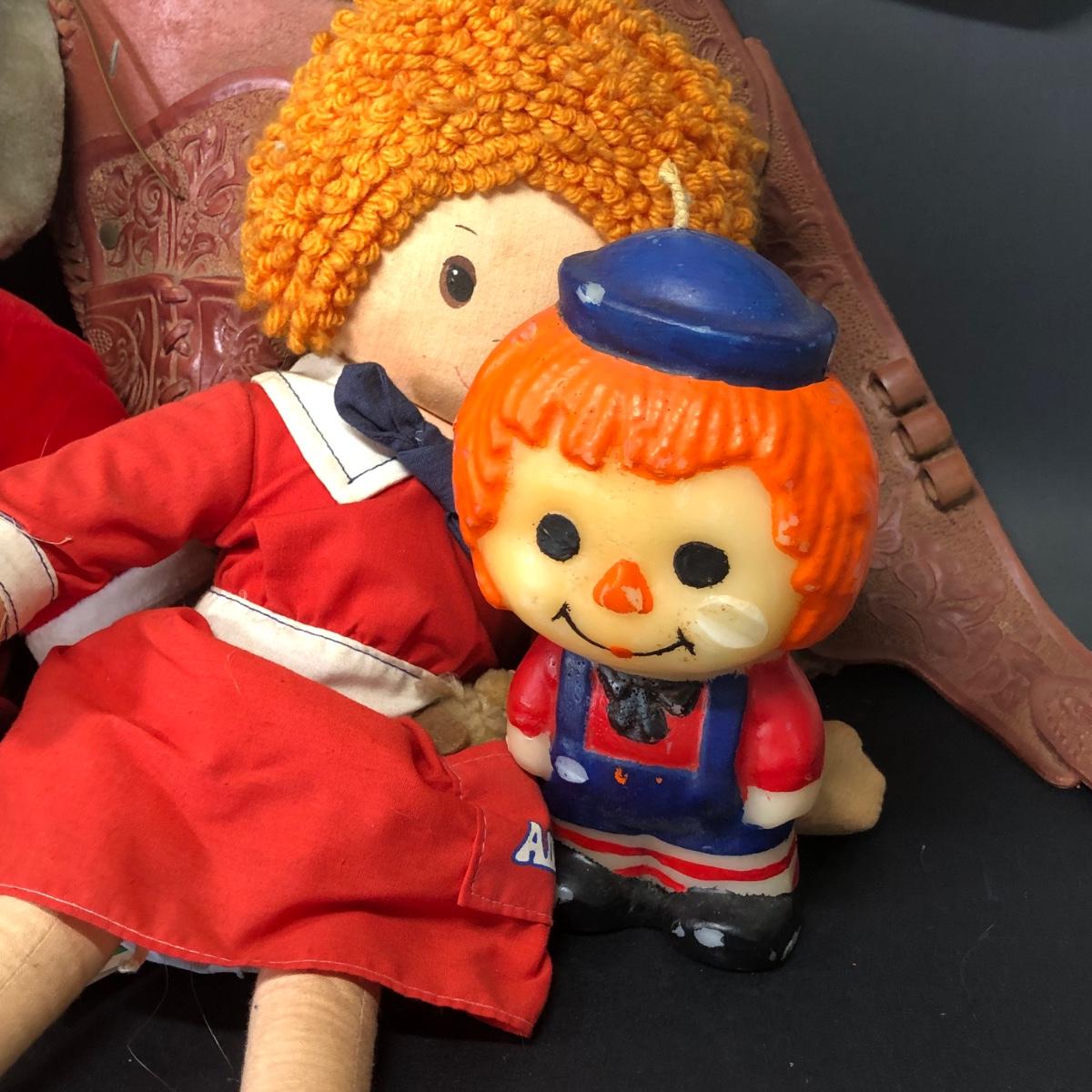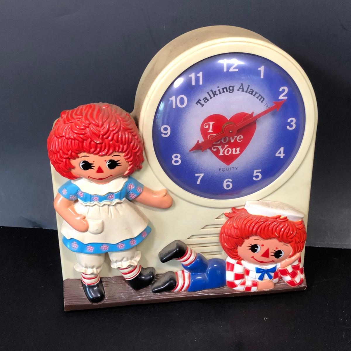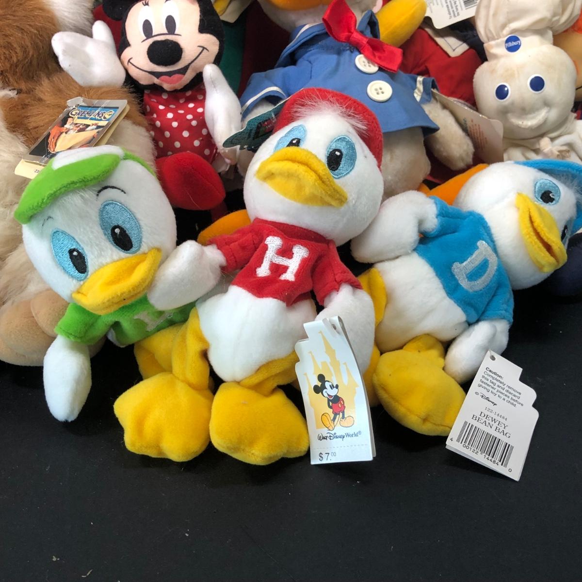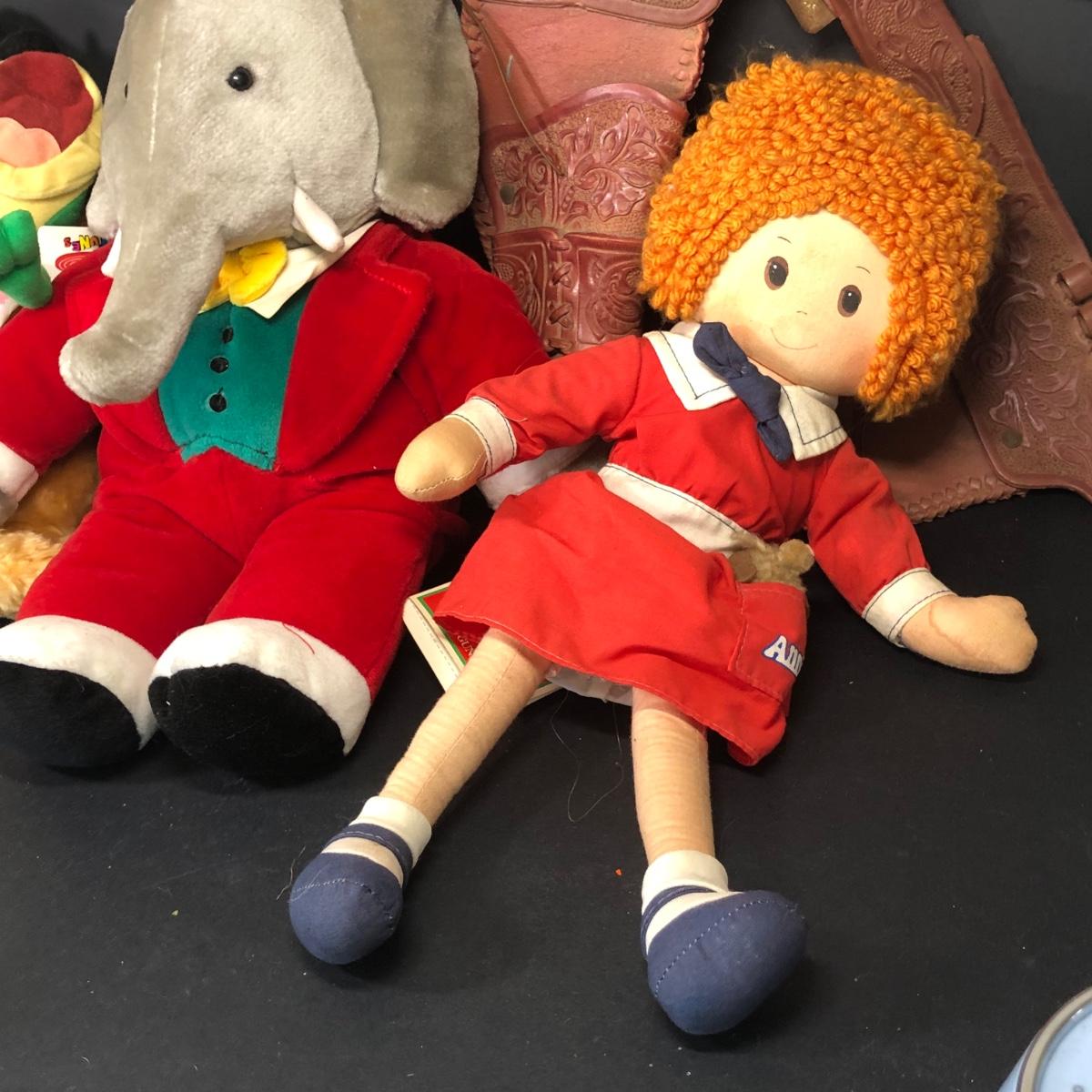 LOT 53M: Stuffed Animal Collection incl. Babar, Donald Duck, Gremlins & More w/ Toy Holsters, 1979 Janex Corp Raggedy Ann Clock & Firefly Mini Kaleidoscope
