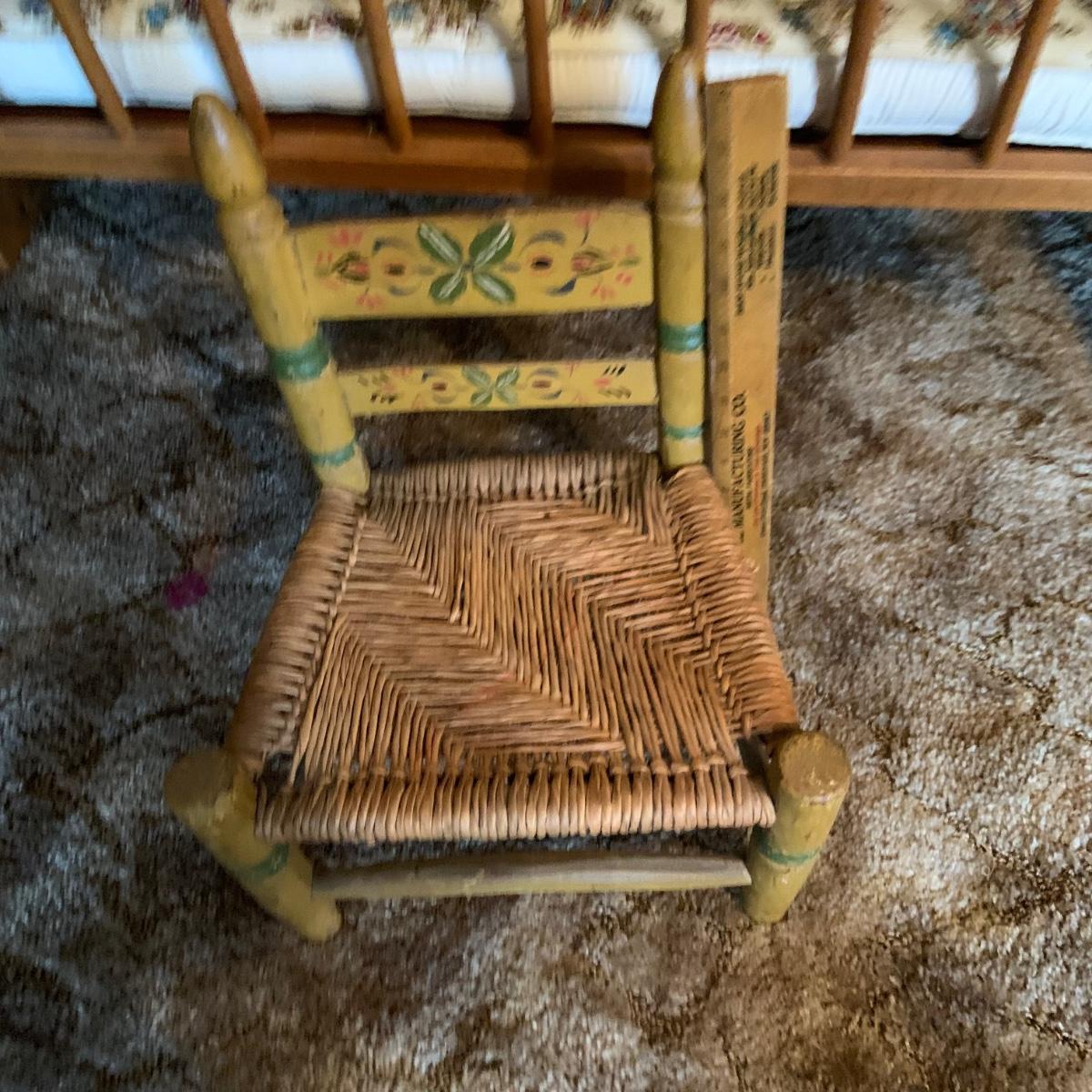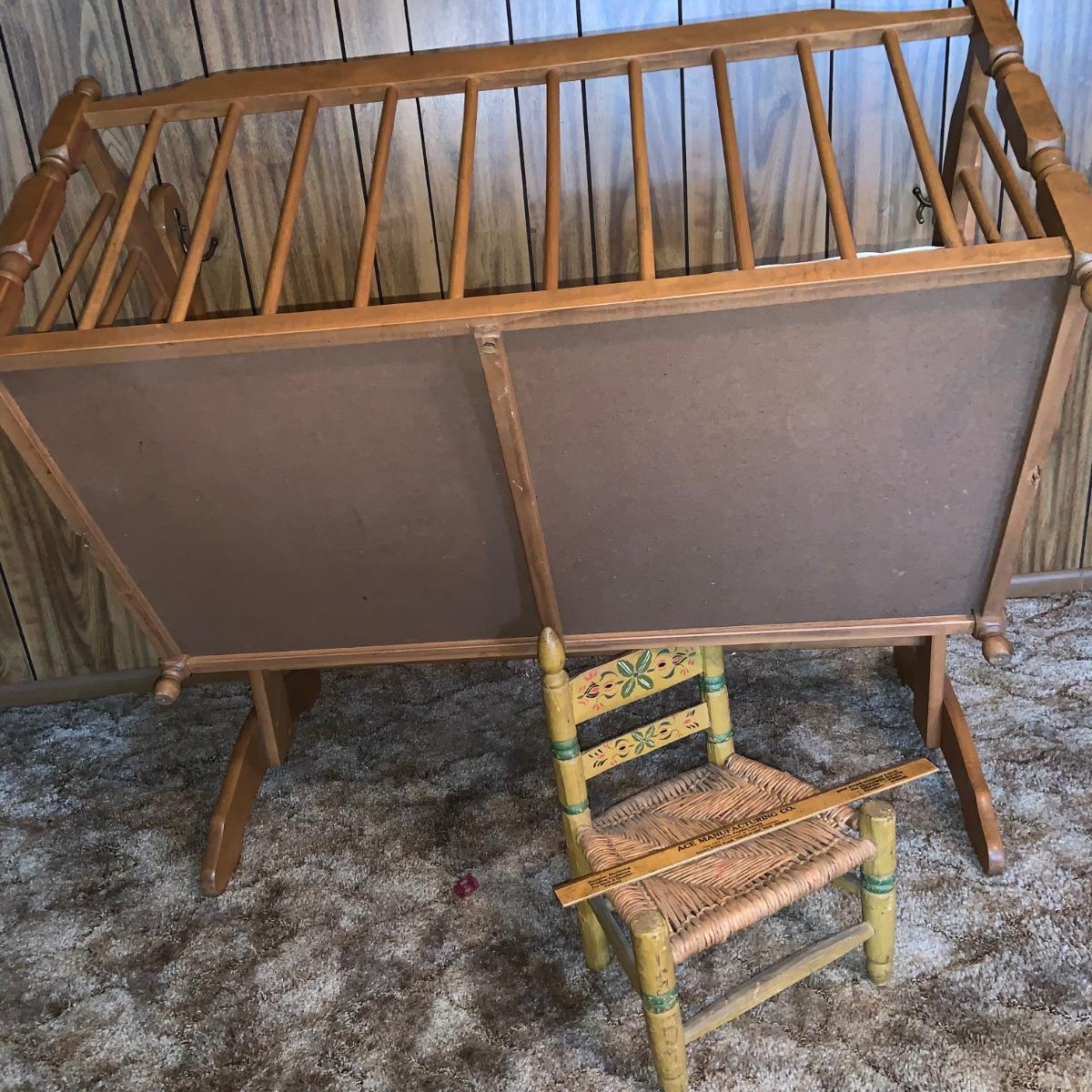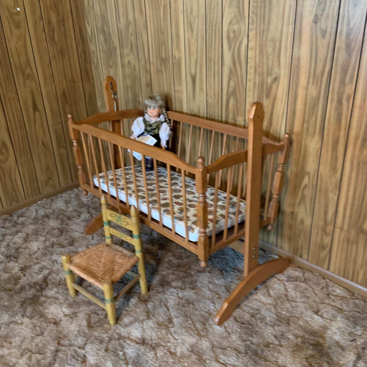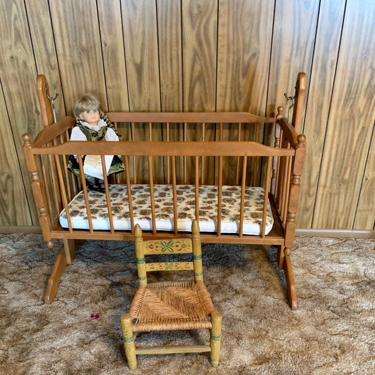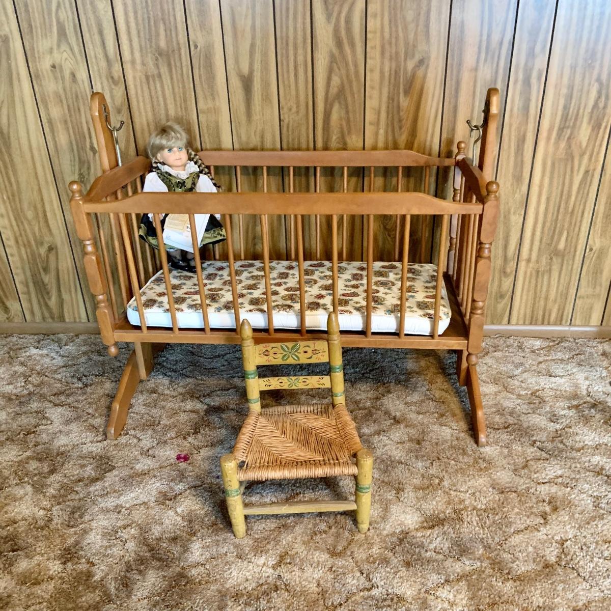 LOT:59G: Vintage Wooden Cradle, Doll Sized Chair and Doll with Tags