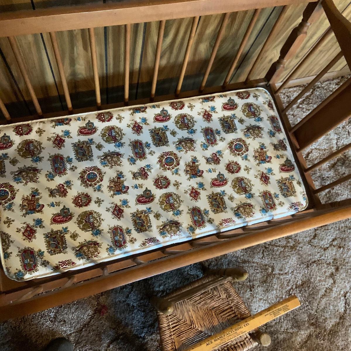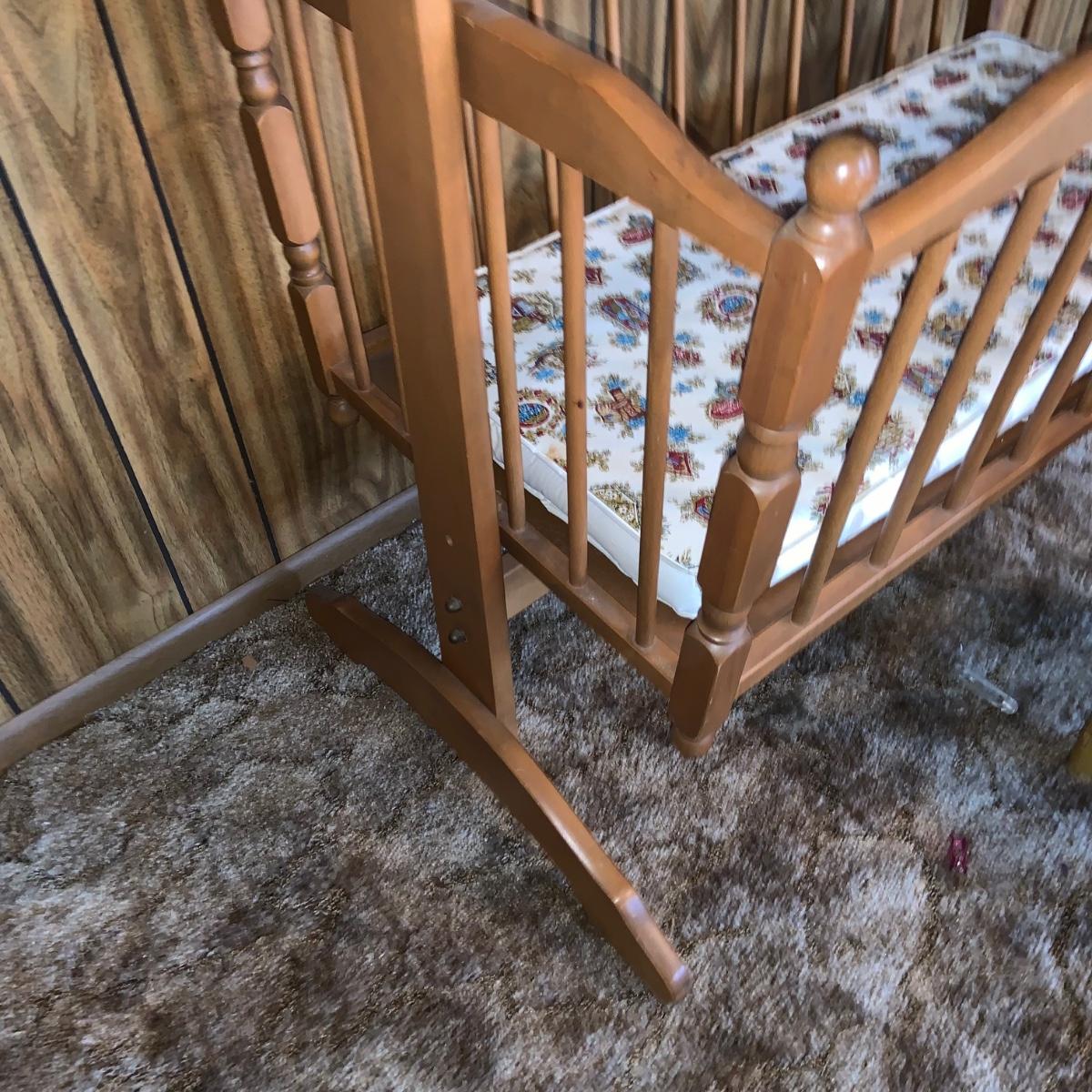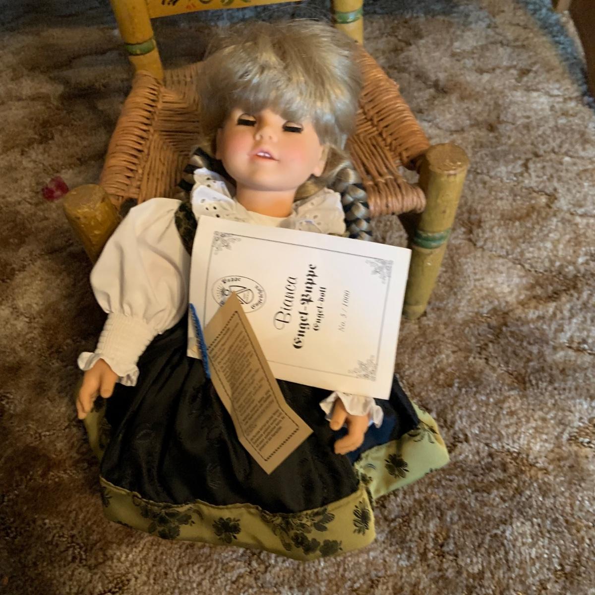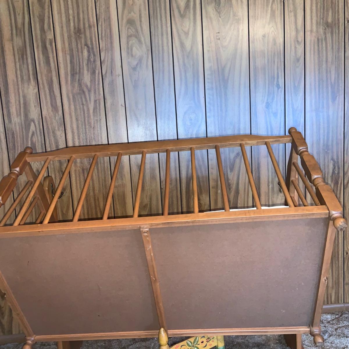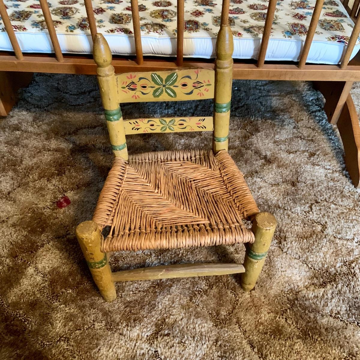 LOT:59G: Vintage Wooden Cradle, Doll Sized Chair and Doll with Tags