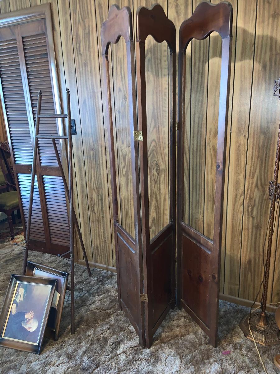 Each panel is 16 x 72", the easle is 17 x60 Please see all pictures as they are the best representation of the items. The pictures show condition, measurements if taken, and what is included in the lot. Due to the large amount that we photograph and the time frame, we are not always able to take measurements. All items unless noted, are pre-owned and have been used. If you purchased furniture, you must bring help. We do not allow one person to carry large furniture out on their own. Bring help, tools and a truck for the safety of our client’s homes, and your personal safety. Any damages that result to the property including walls, and floors due to moving of the furniture will be charged to the buyer. Company policy. Thank you.