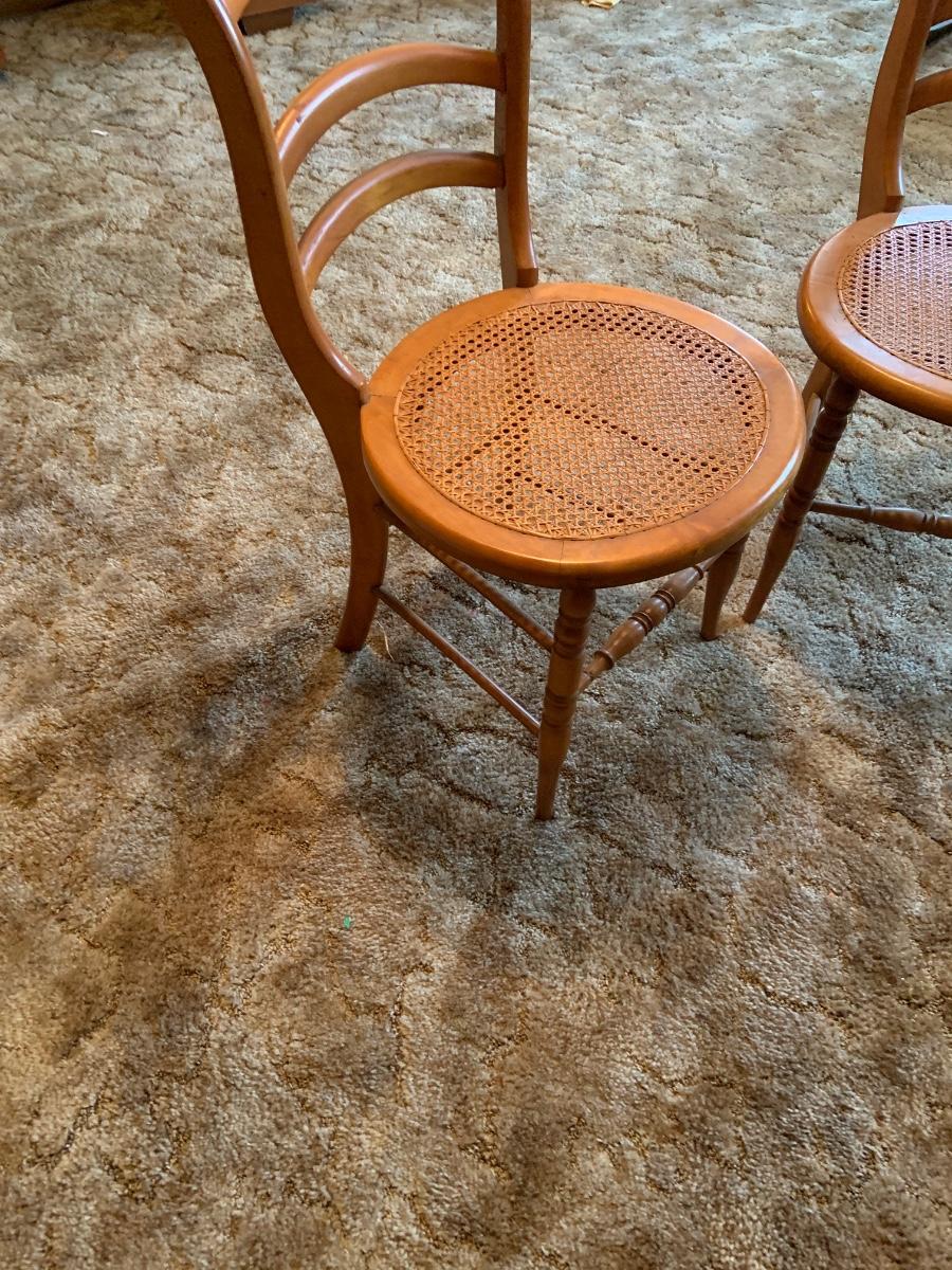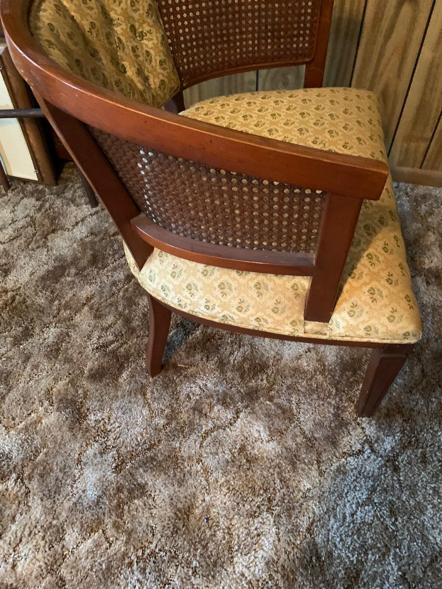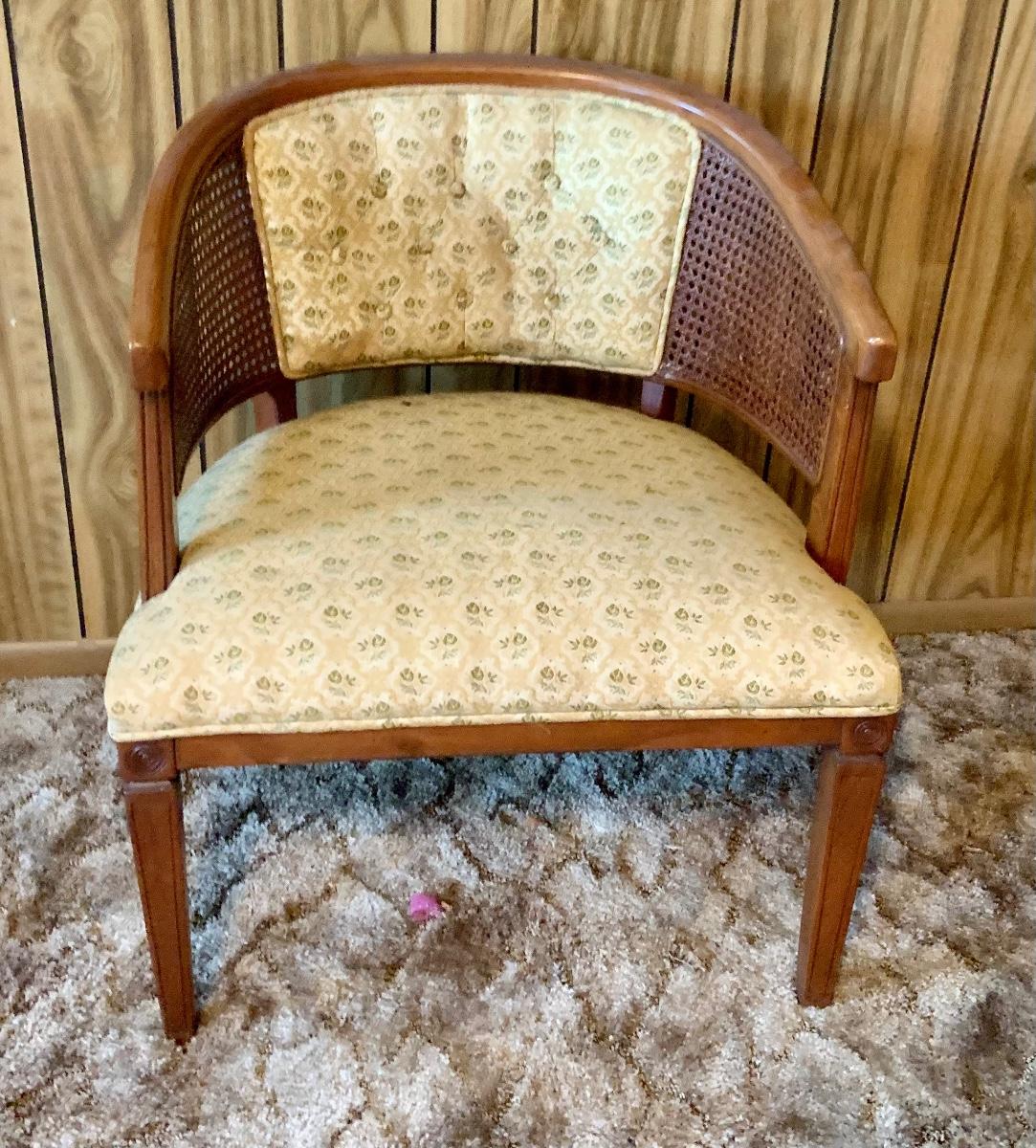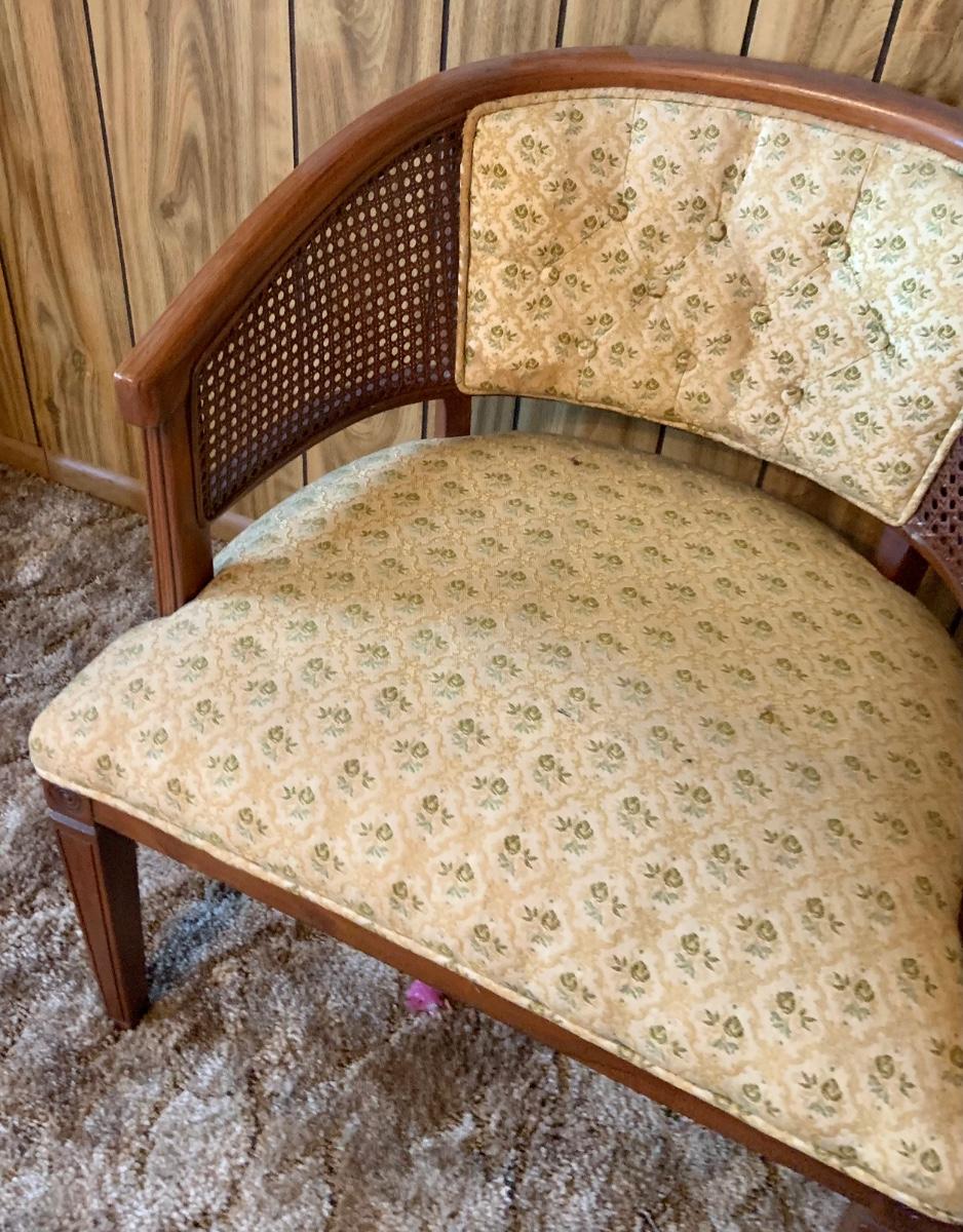 LOT:63G: Vintage Upholstered  Barrel Chair and 2 Wood Chairs with Round Cane Seats