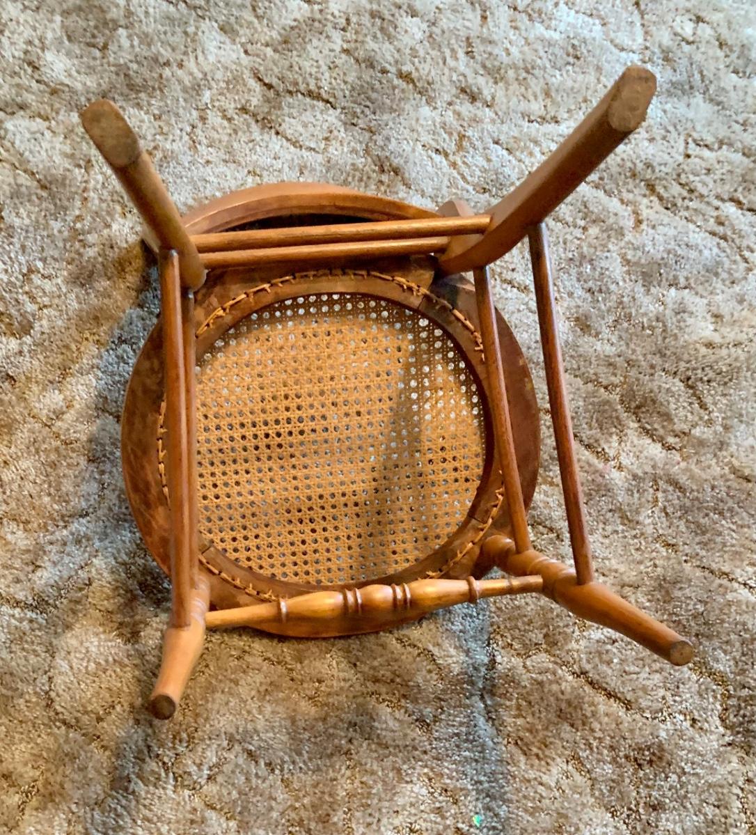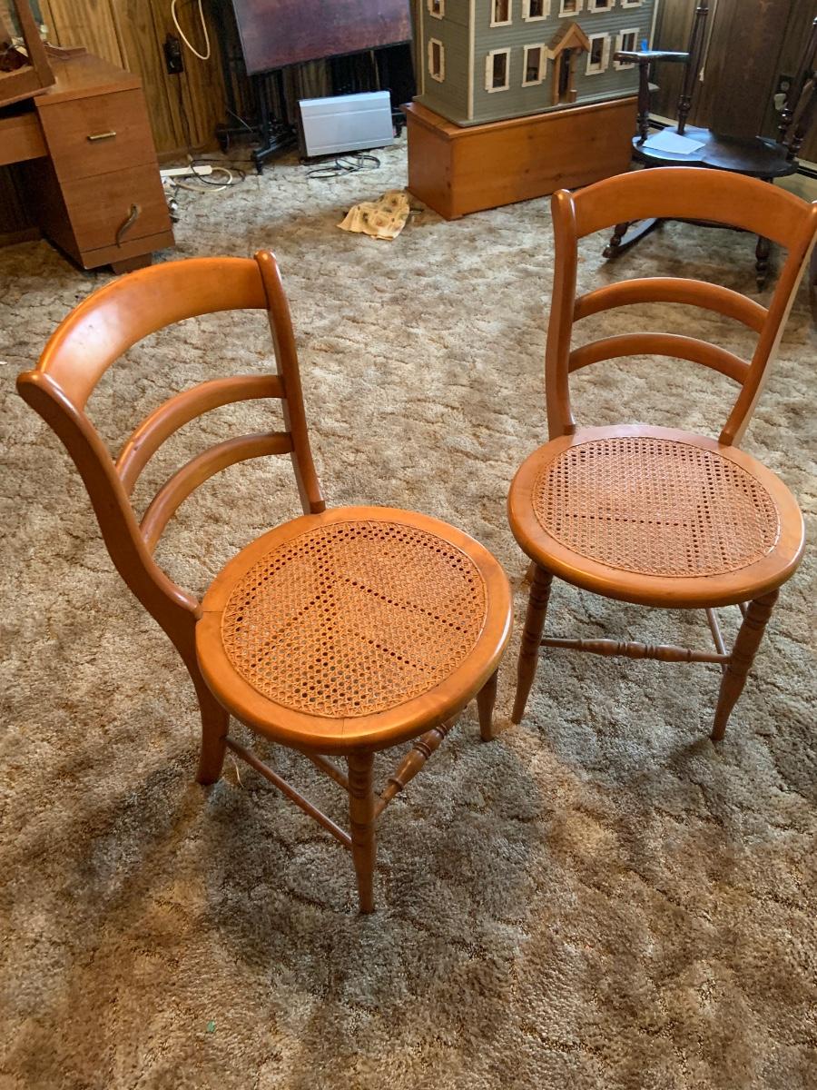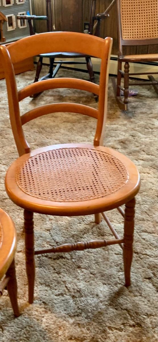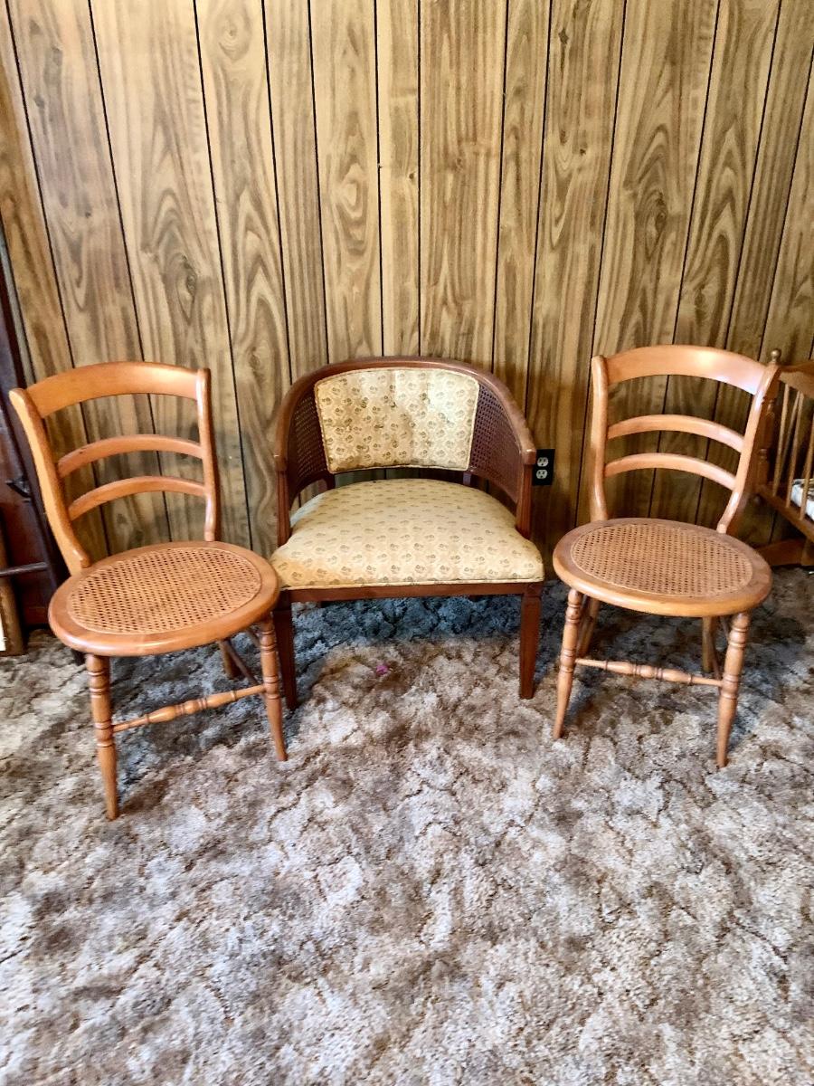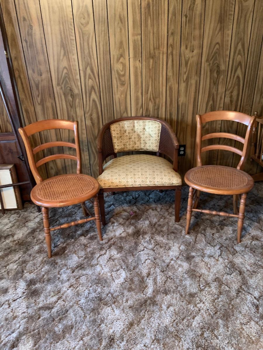 LOT:63G: Vintage Upholstered Barrel Chair and 2 Wood Chairs with Round Cane Seats