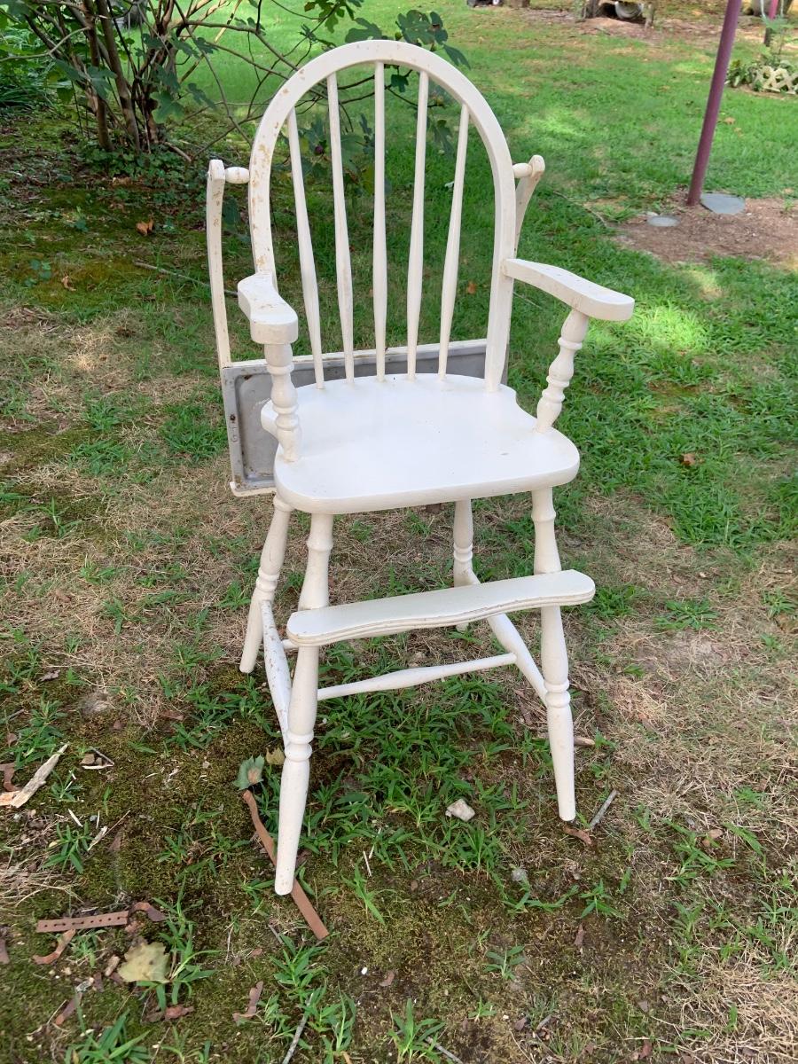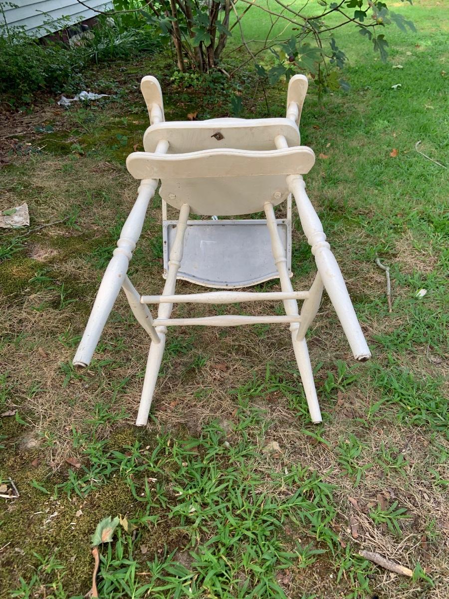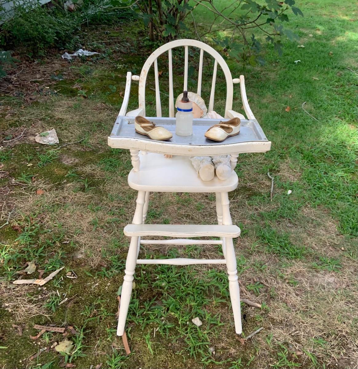 LOT:73G: Vintage White Wood Highchair with Metal Top Tray: Babydoll and More