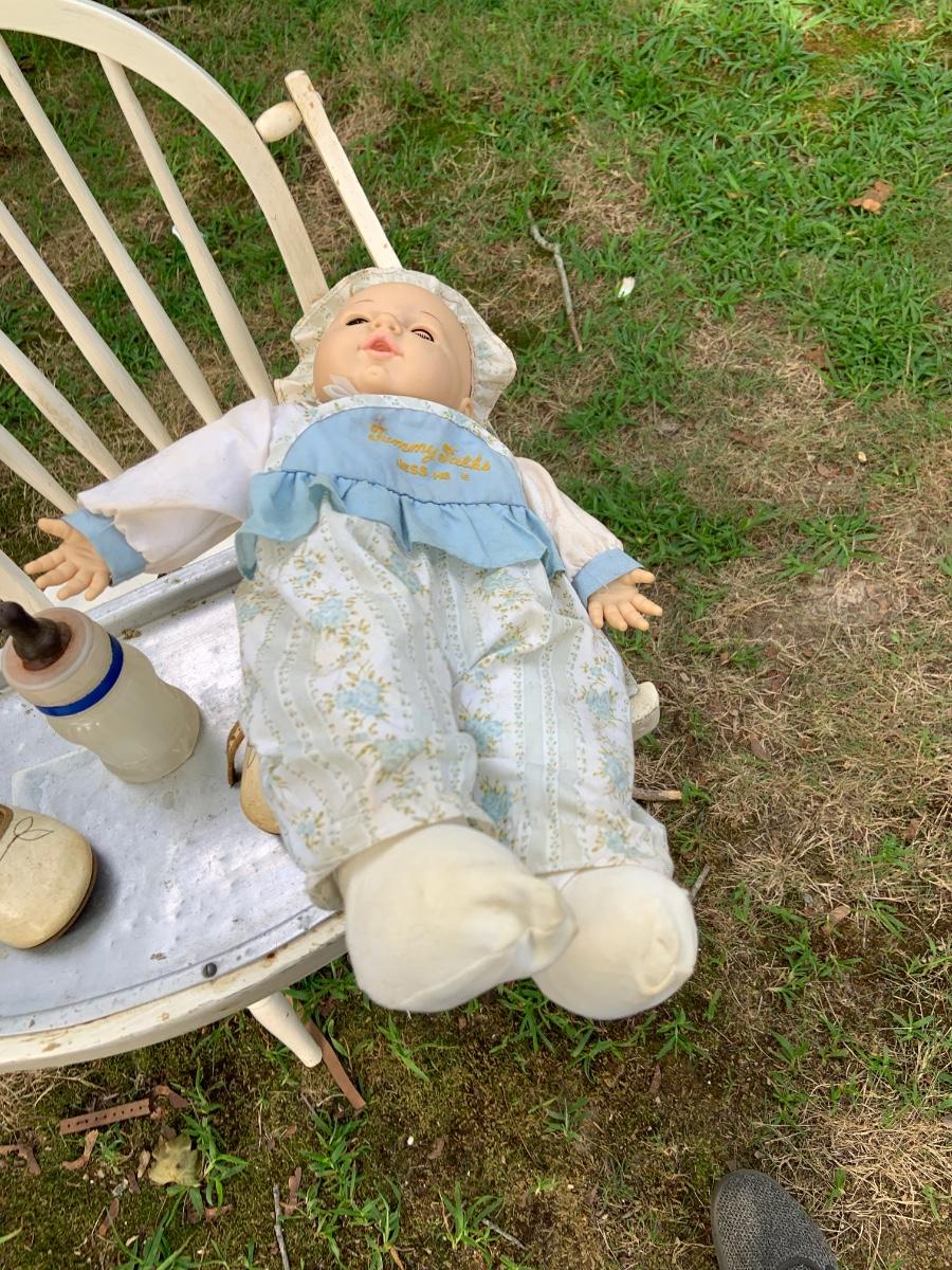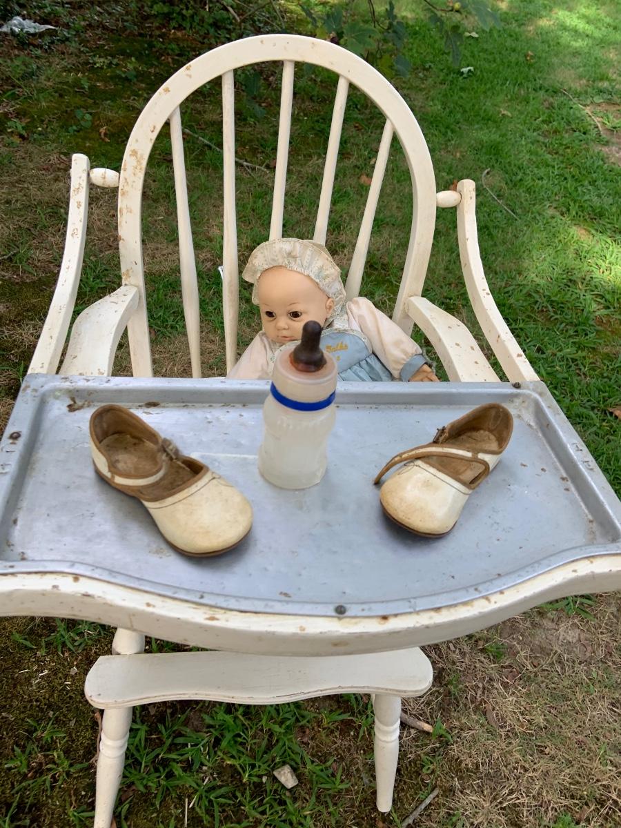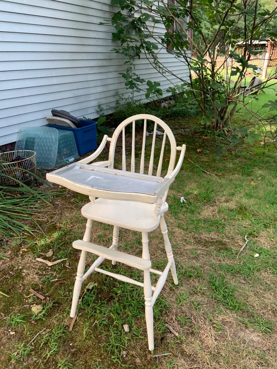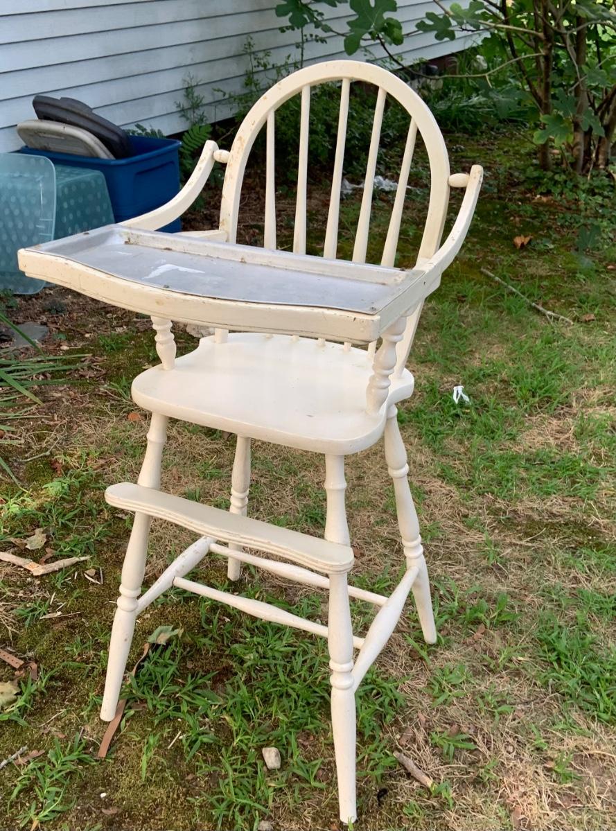 LOT:73G: Vintage White Wood Highchair with Metal Top Tray: Babydoll and More