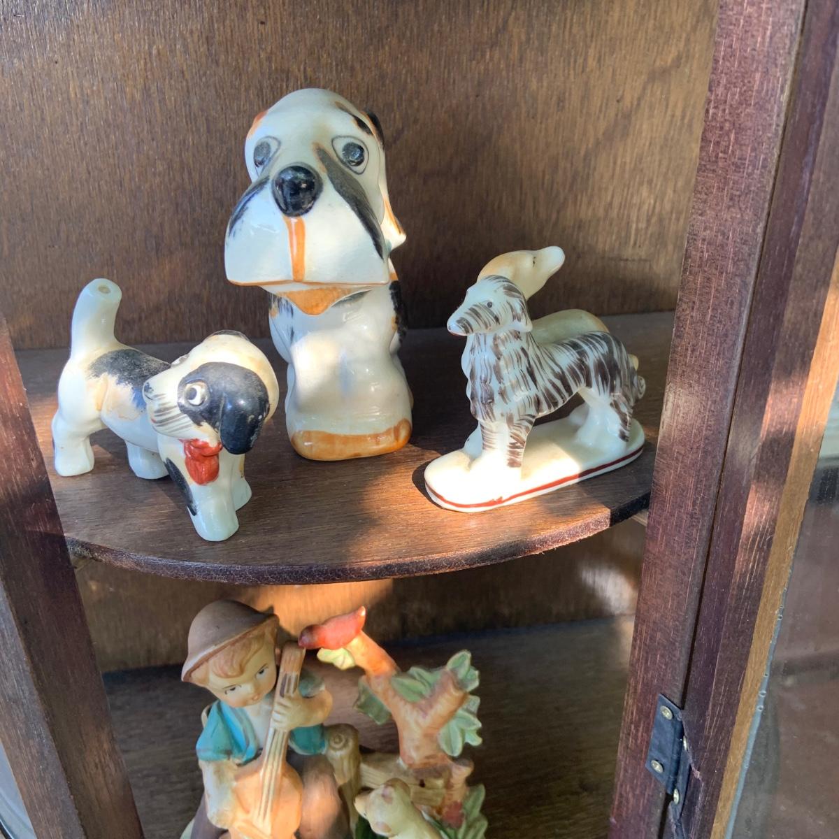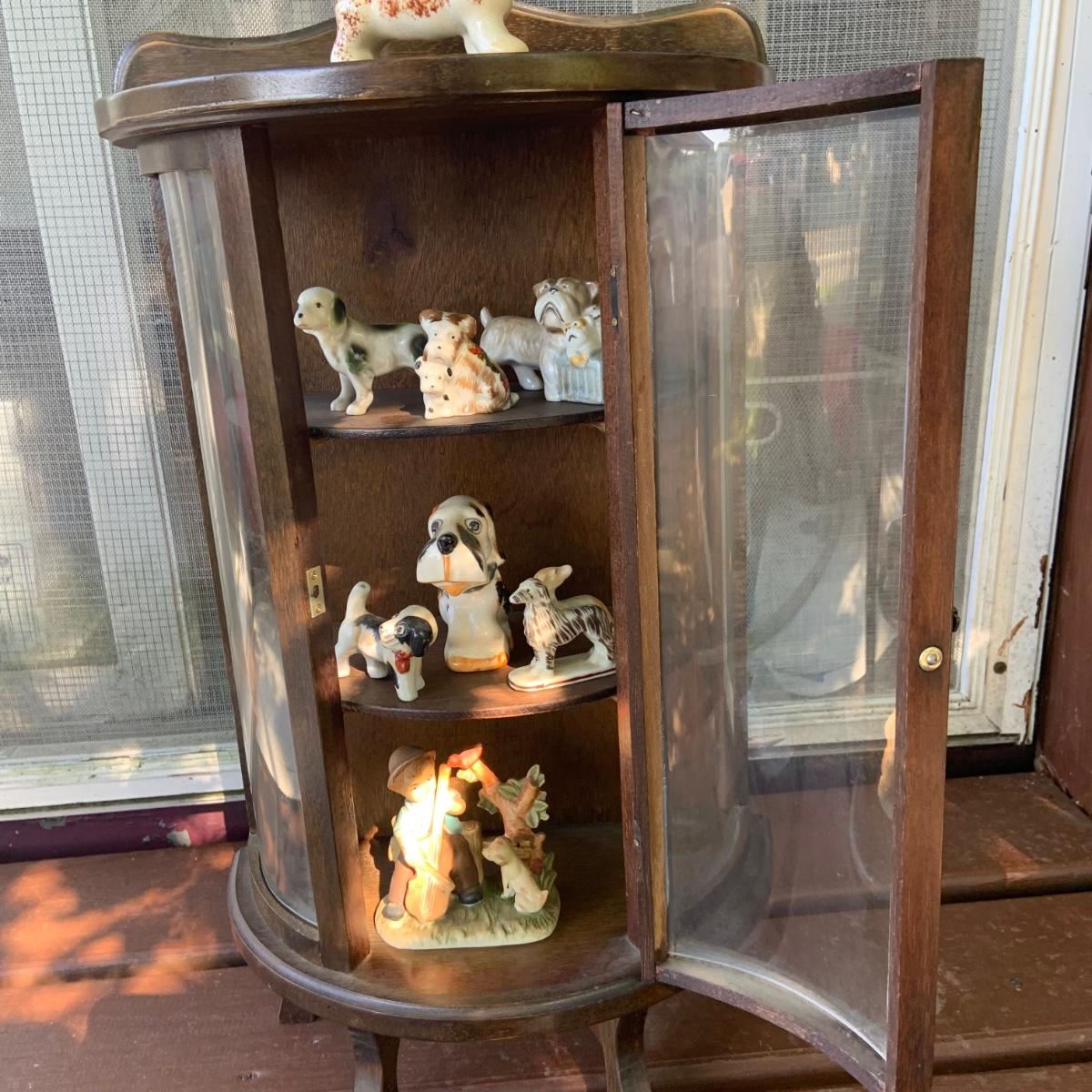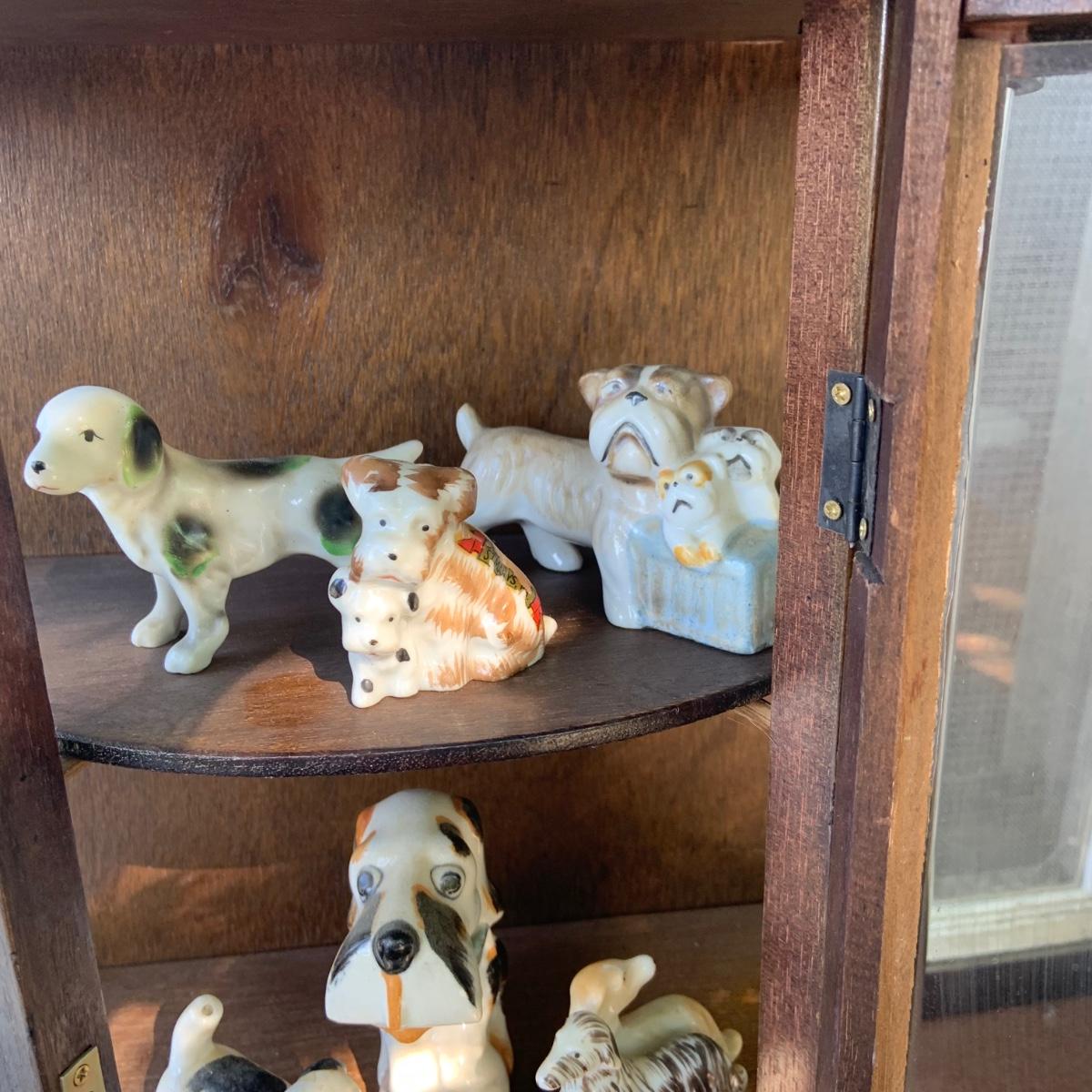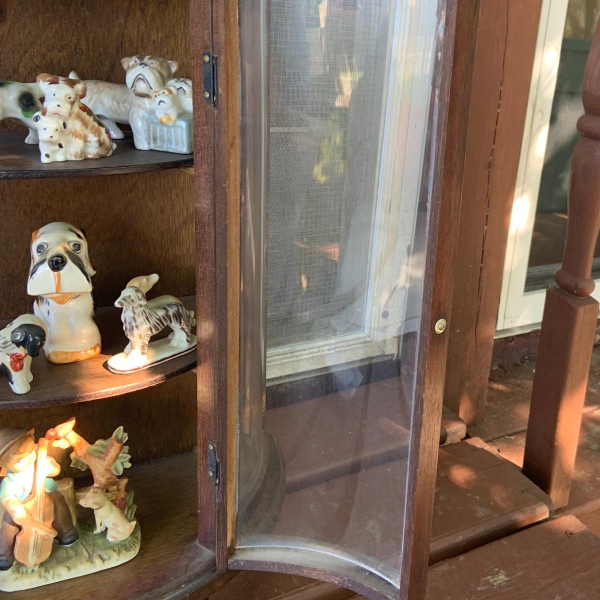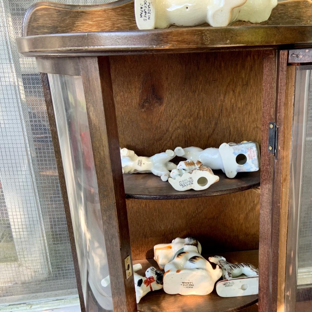 LOT:79G: Bowed Glass and Wood Display Shelf with Occupied Japan Dog Figurines and More: