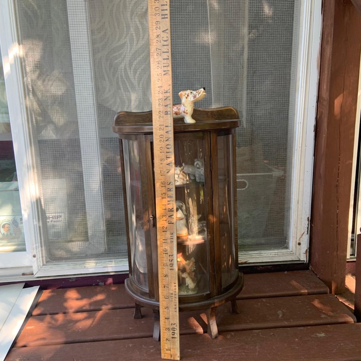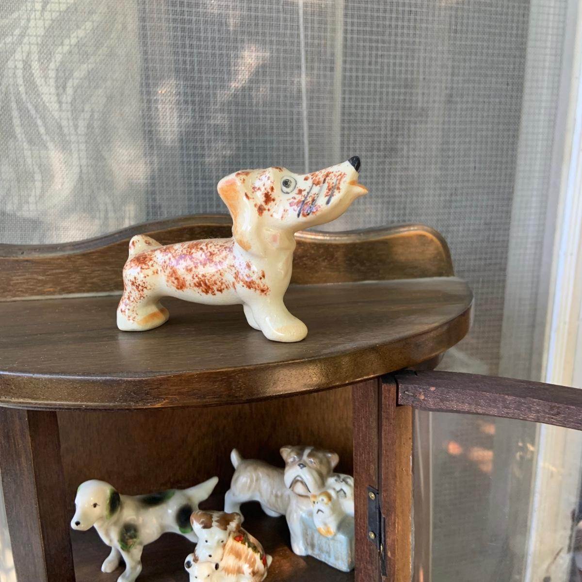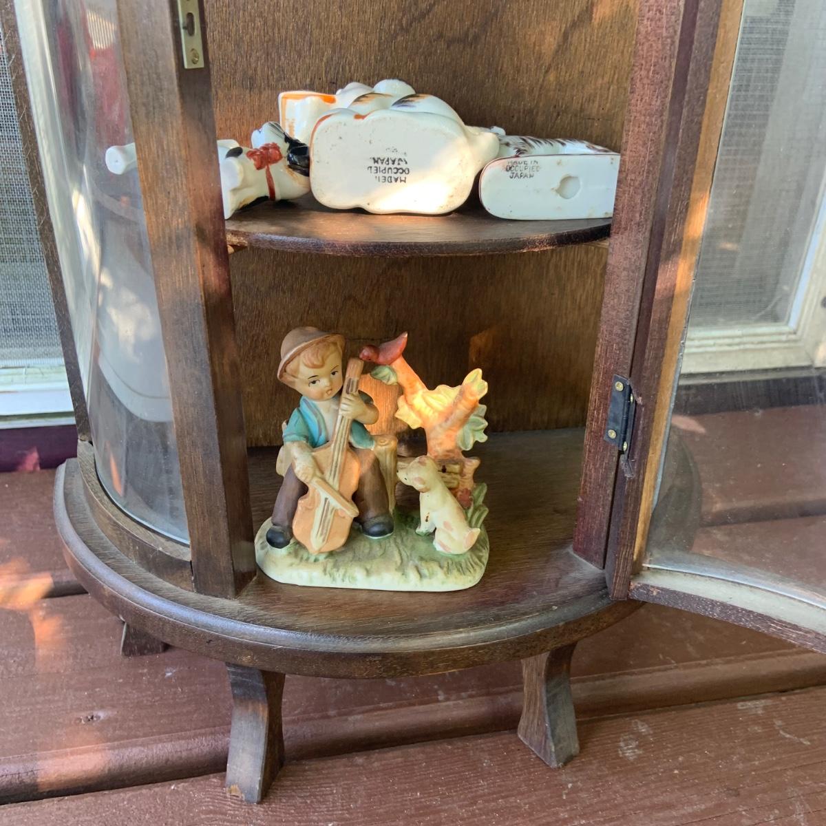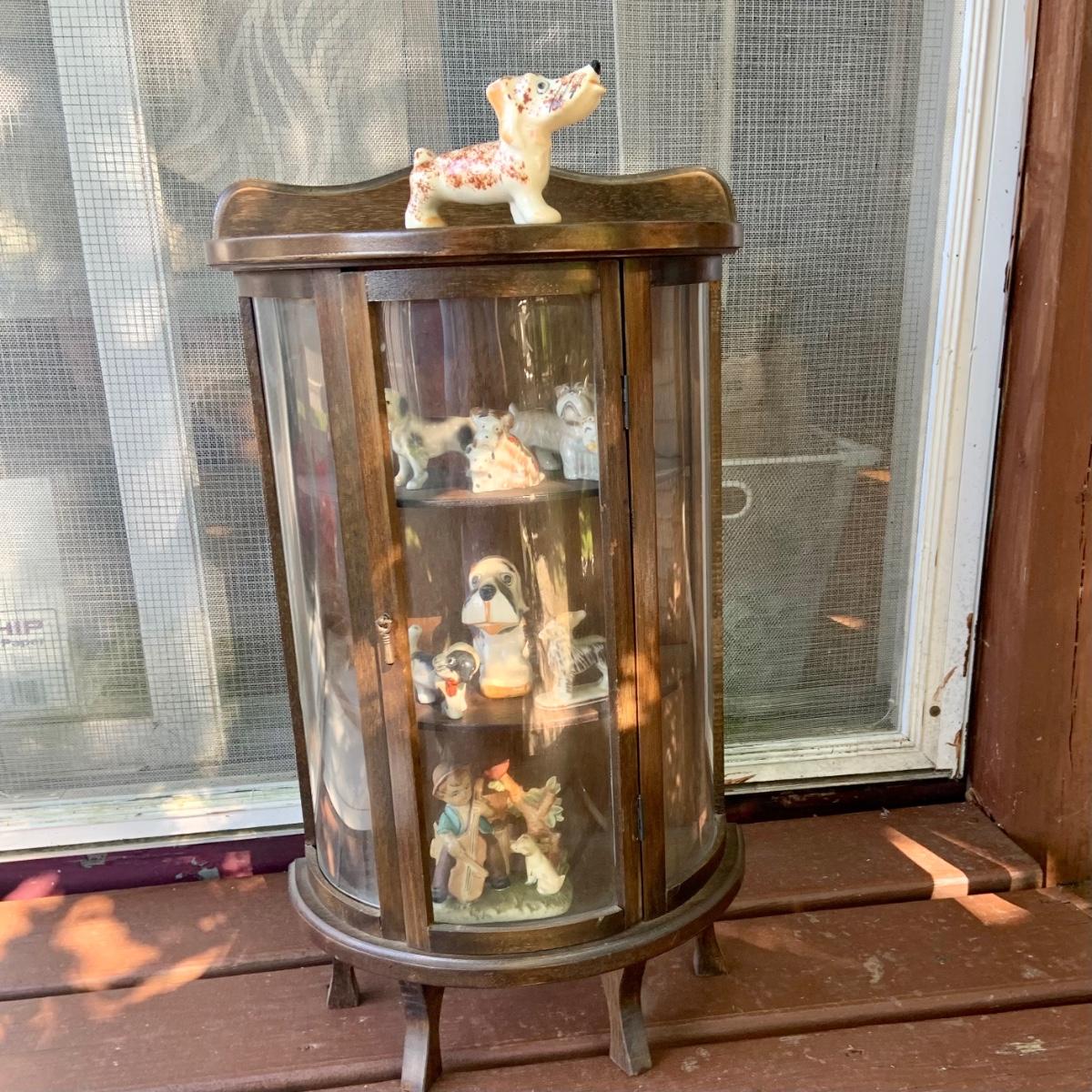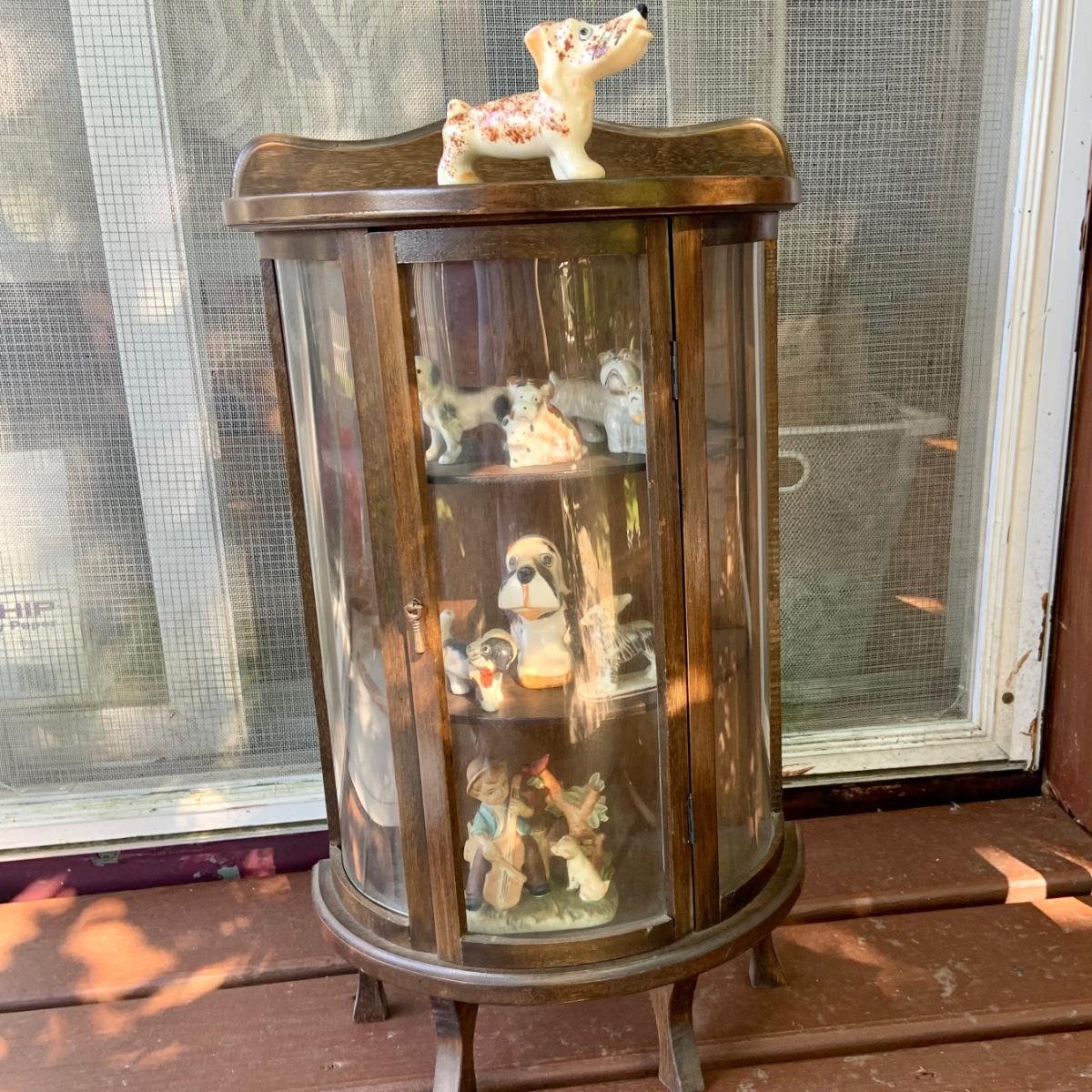 LOT:79G: Bowed Glass and Wood Display Shelf with Occupied Japan Dog Figurines and More: