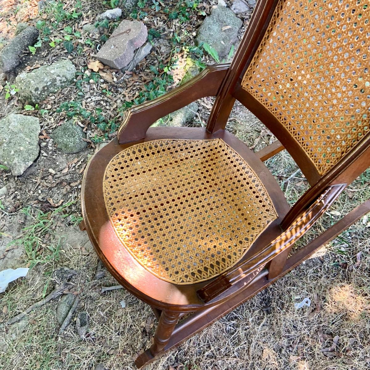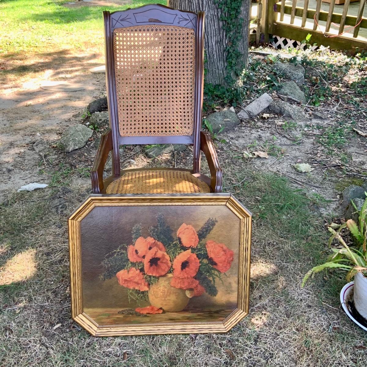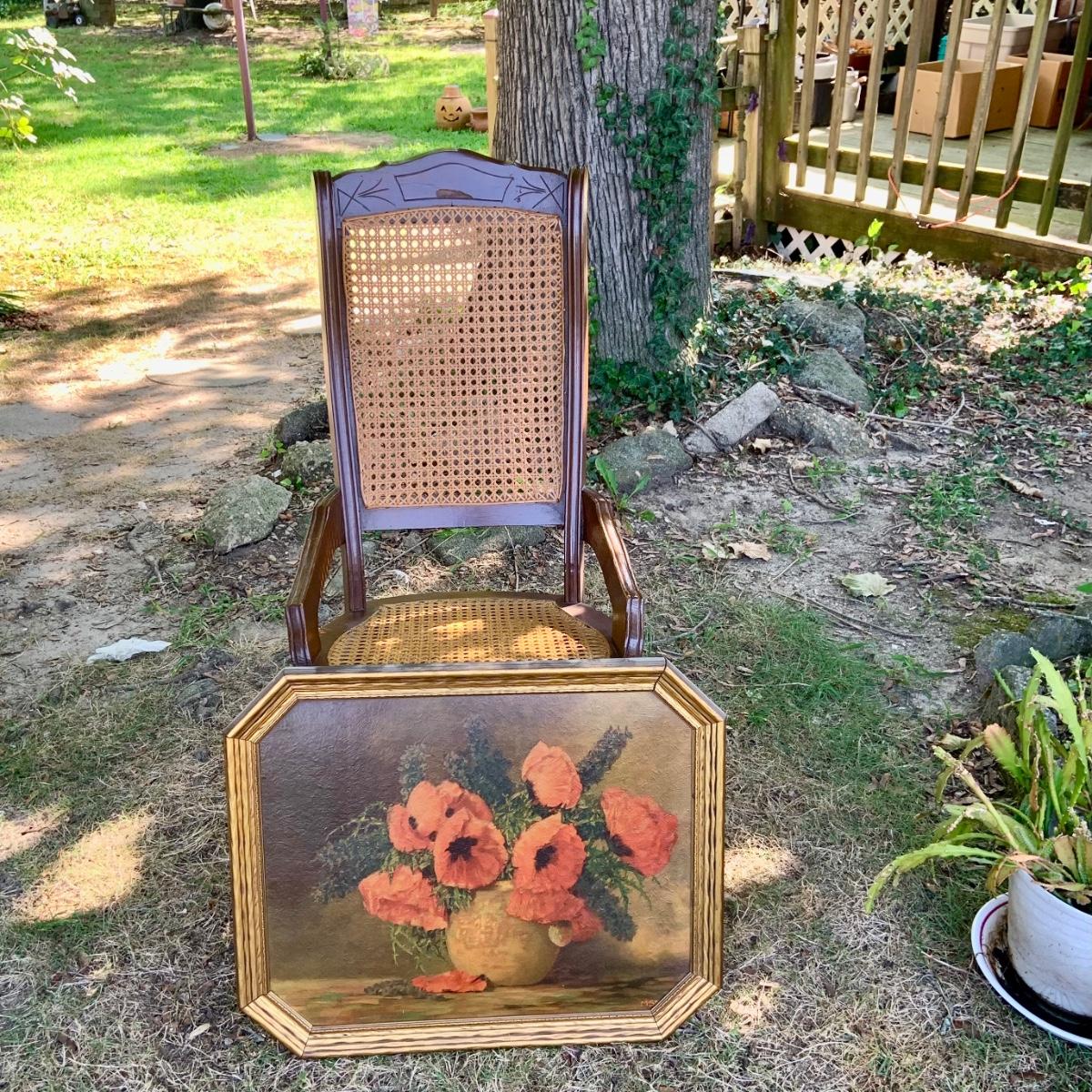 LOT:81G: Cane Rocking Chair and Vintage Framed Floral Painting