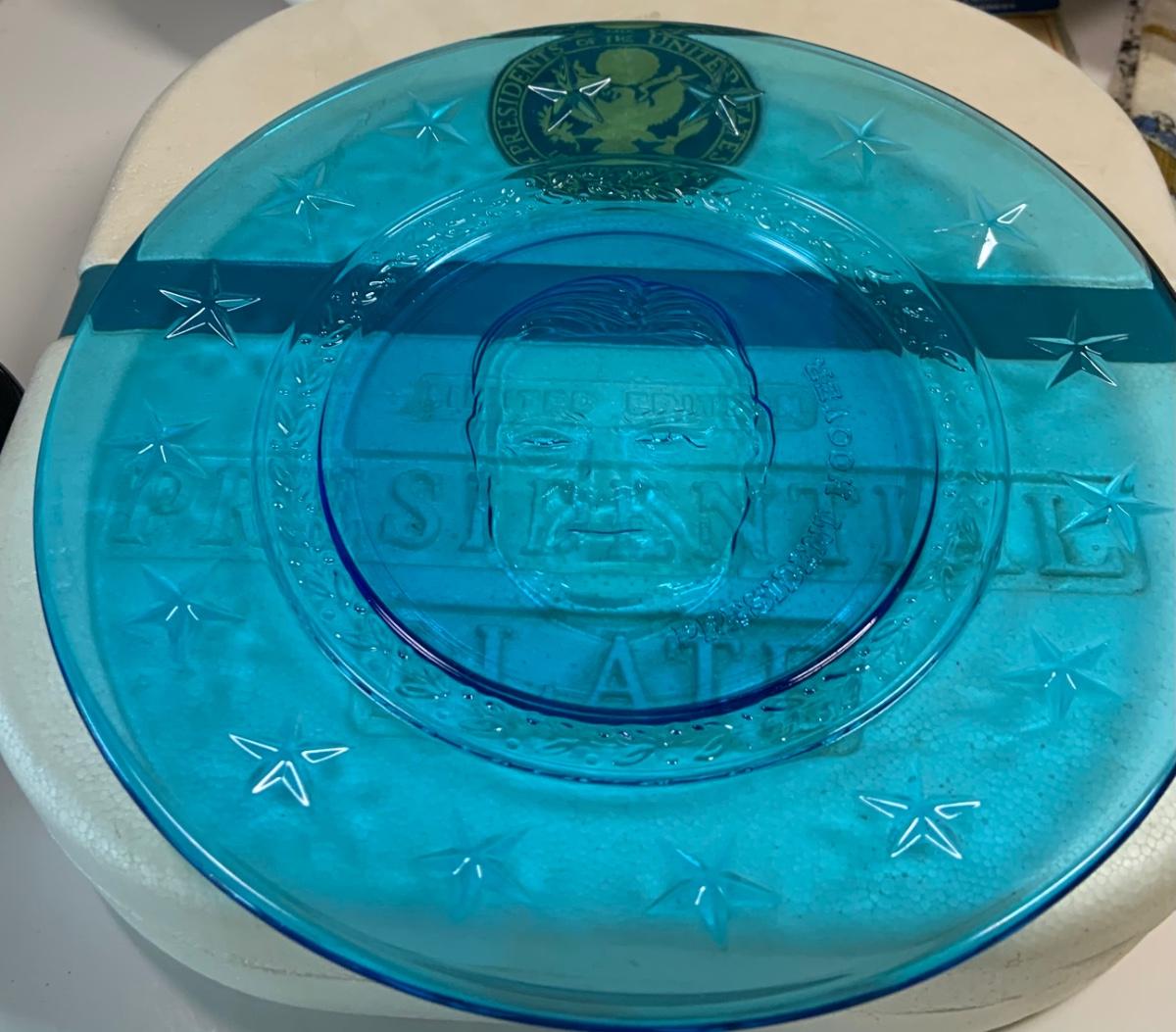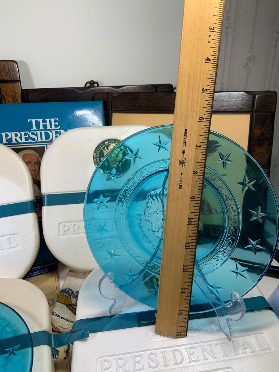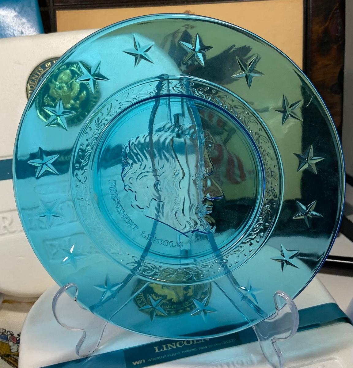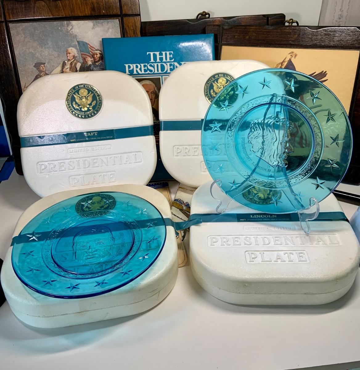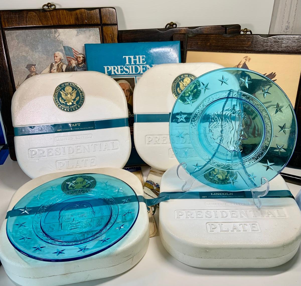 LOT:84G: Wheaton Blue Glass Presidential Plates and Americana Decor and More