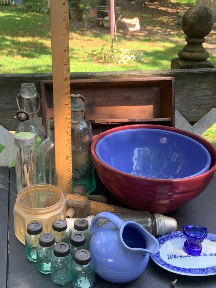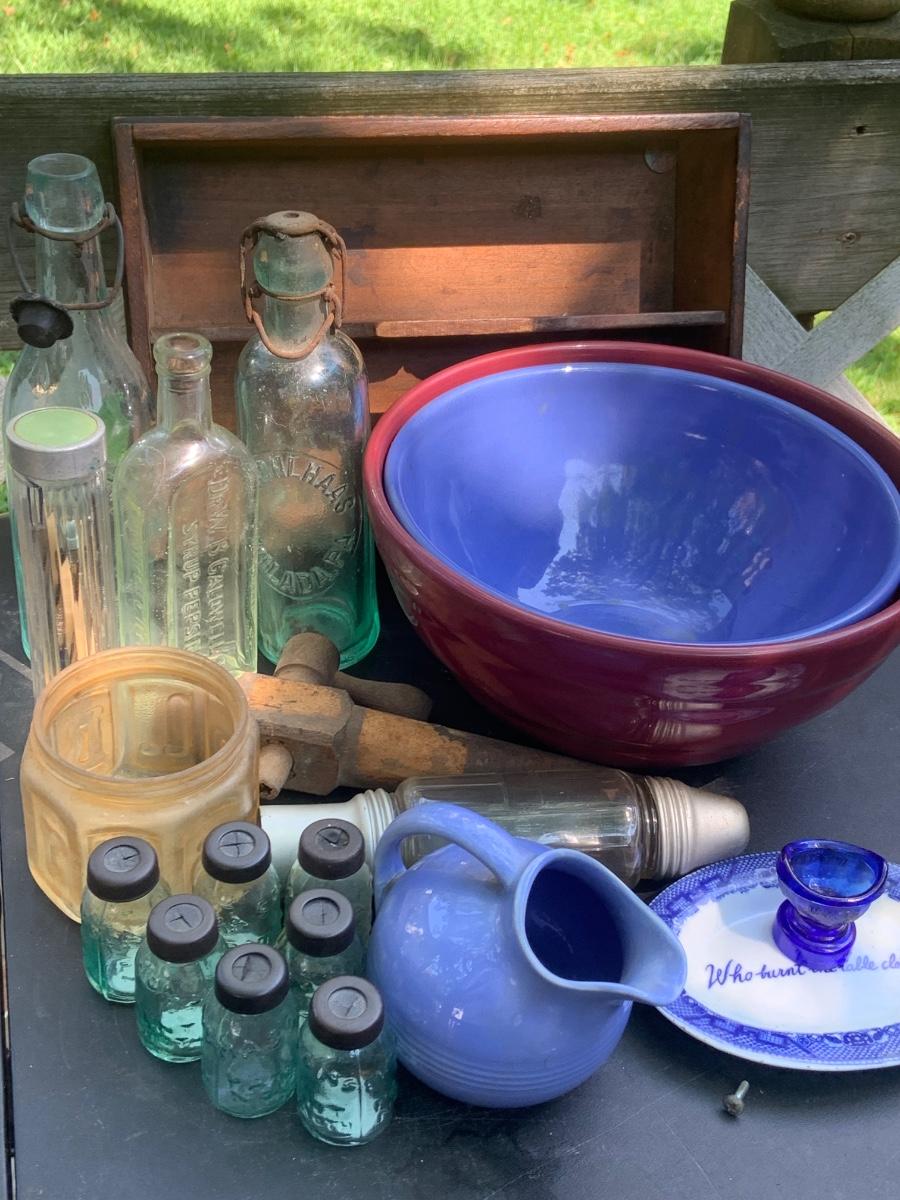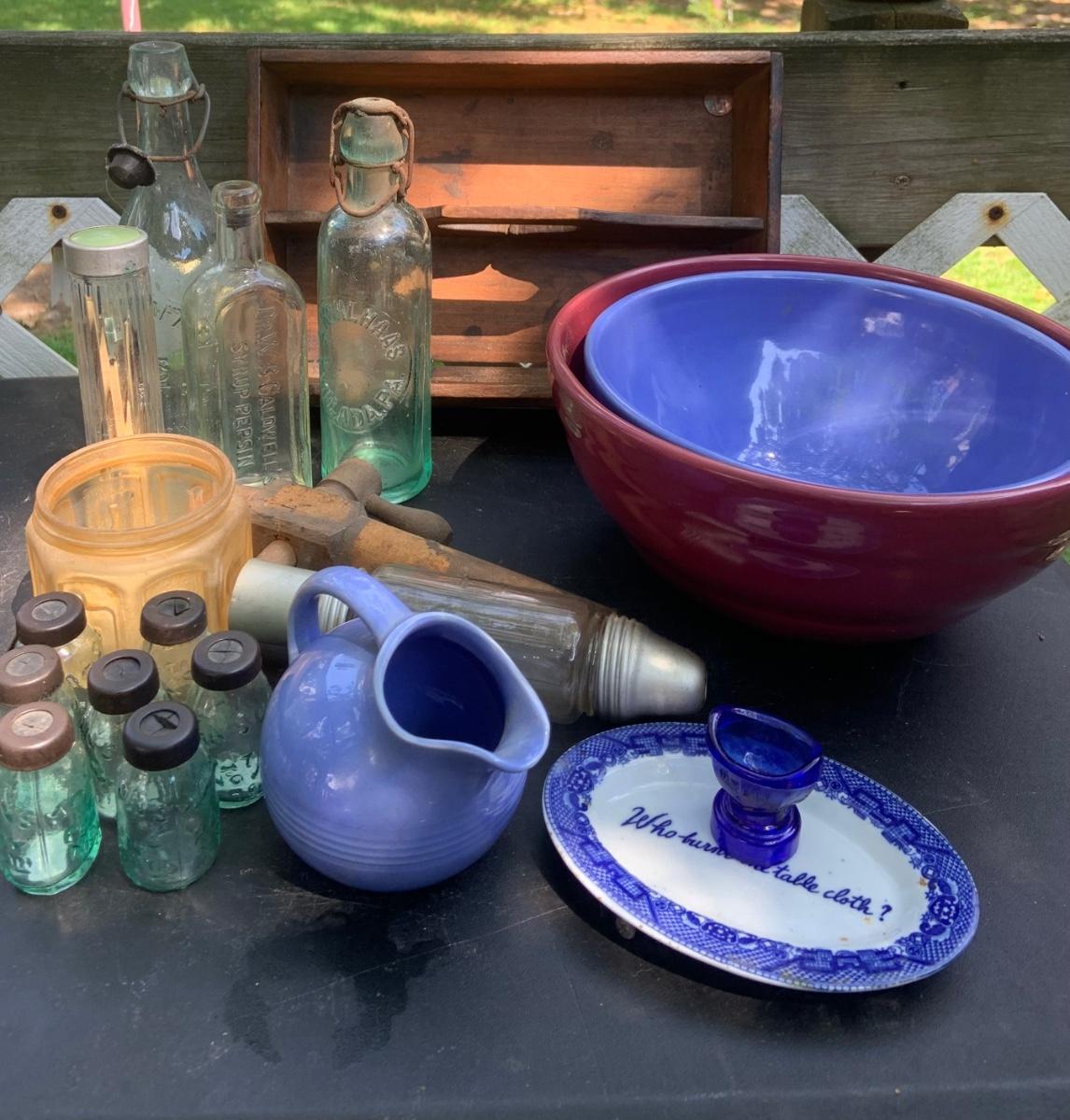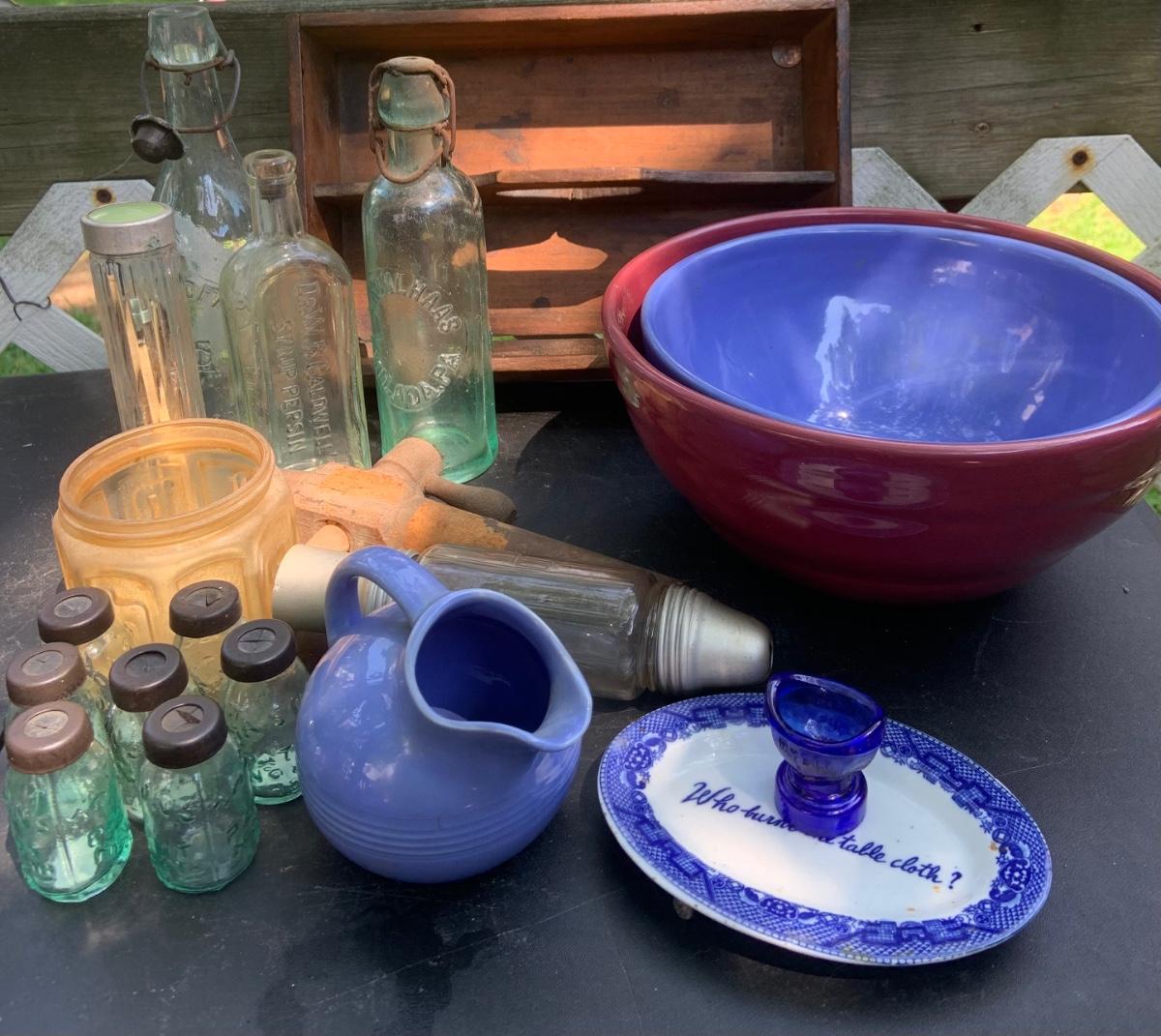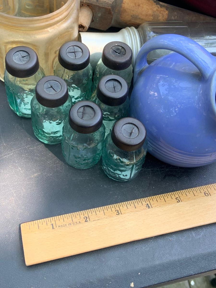 LOT:85G: Mini Mason Jars, and Other Glass Bottles, Ceramic Bowls, Pitcher and More