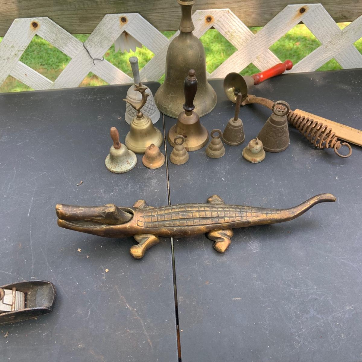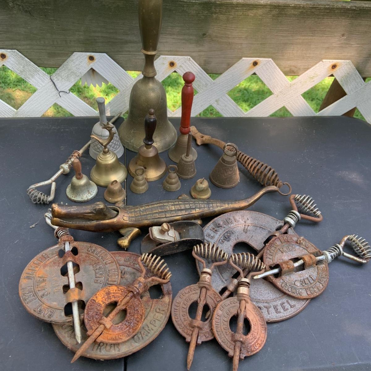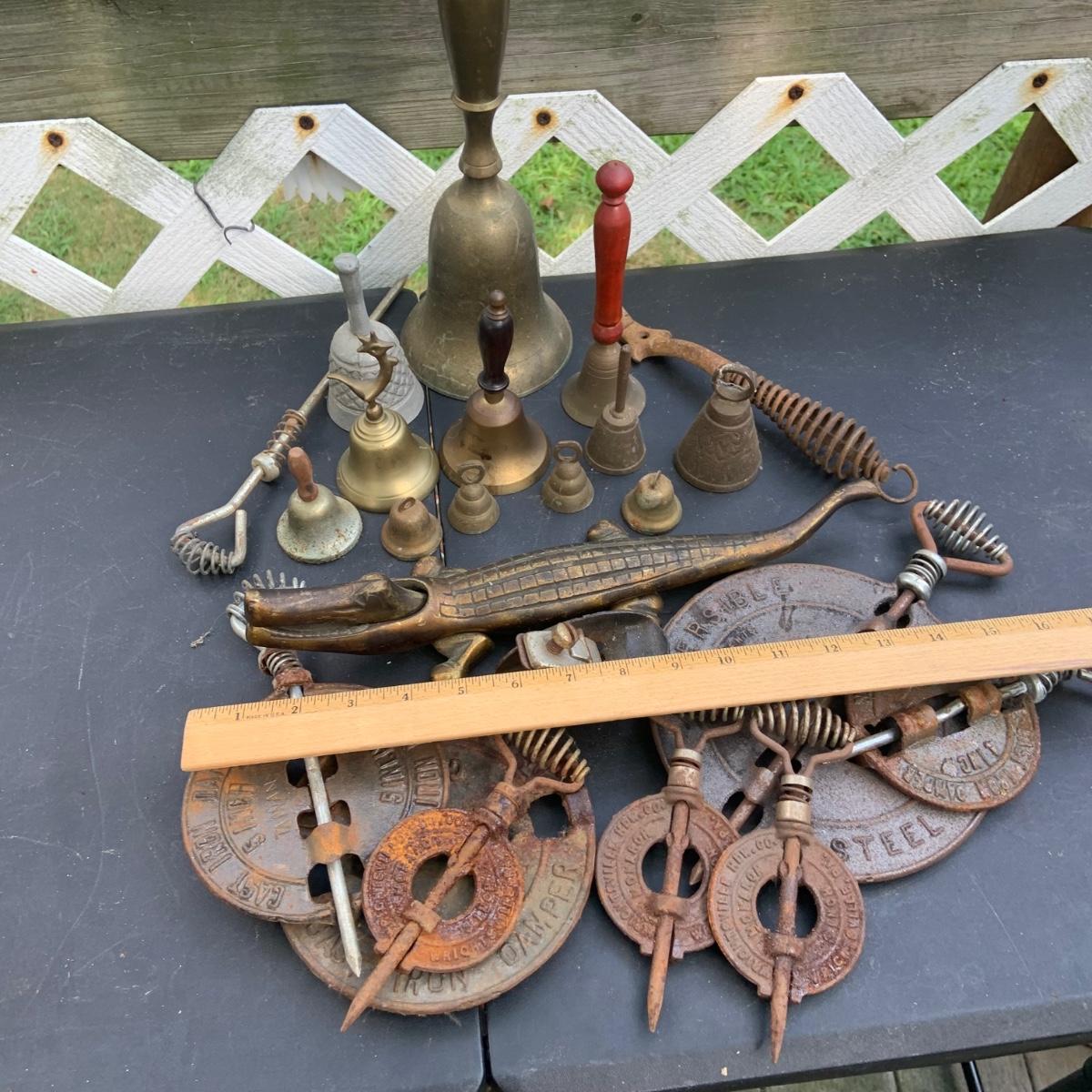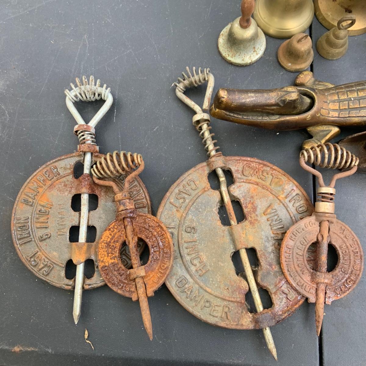 LOT:86: Brass and Other Bells, Stove Dampers, and Alligator Nutcracker More